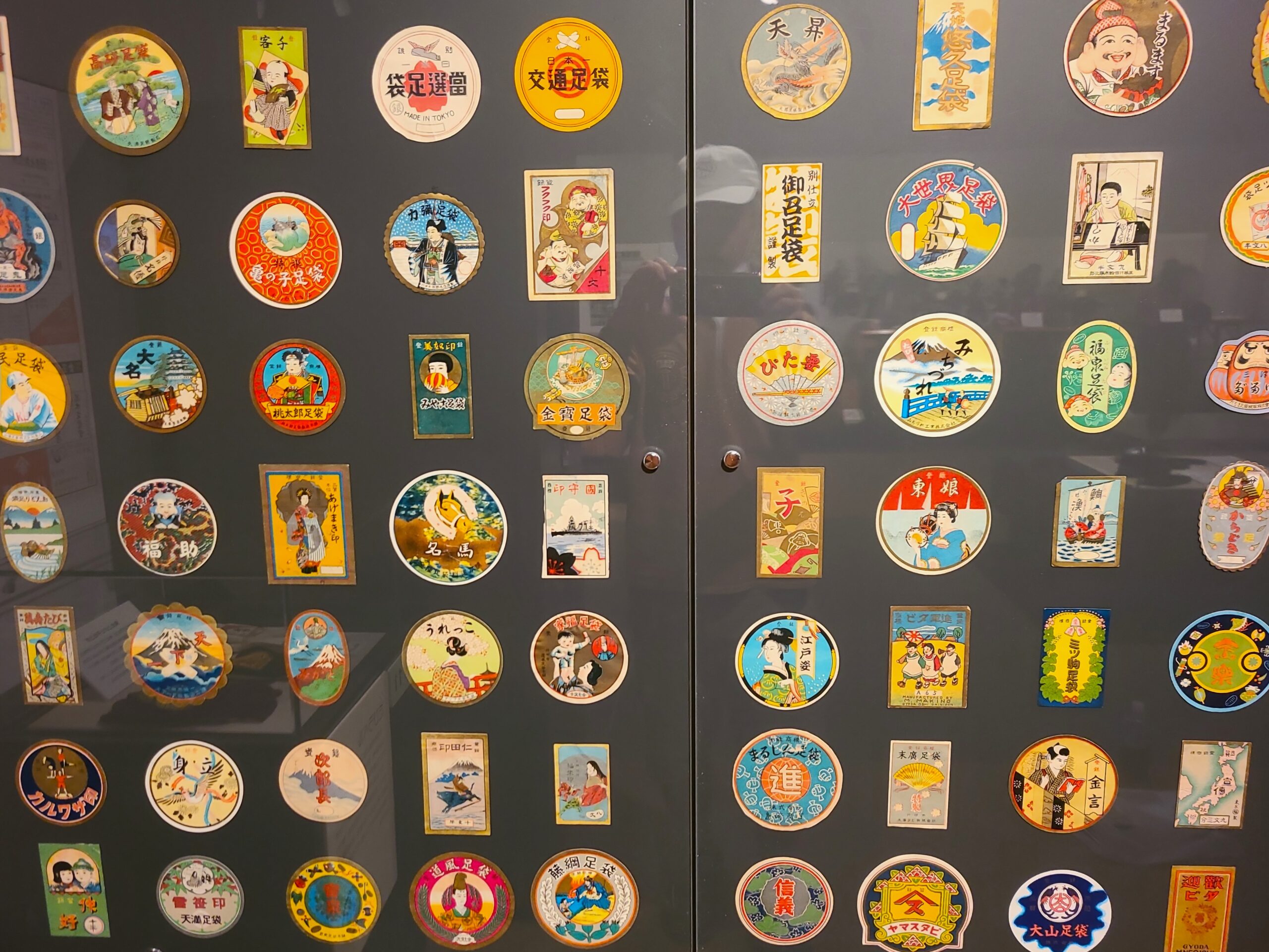 足袋蔵は足袋産業にかかわる蔵造りの建物で古くはおもに足袋の保管庫でした。壁の柱の間隔が狭く、空間に柱がないのが特徴で江戸時代から昭和32年(1957)にかけて建築されました。一般に蔵は豊かさの象徴として表通りに面して建造されることが多く、表通りに土蔵造の見世蔵が続く蔵のまちは各地にありますが行田はそうした蔵のまちとは異なり、行田の足袋蔵のほとんどが裏通り、言い換えればに敷地の裏庭に建造されているのが特徴です。蔵の作りも建造された年代により石造り、煉瓦造、モルタル造、木造と様々な建材が用いられ多彩です。写真は行田市郷土博物館の足袋の商標を印刷したラベルコレクション