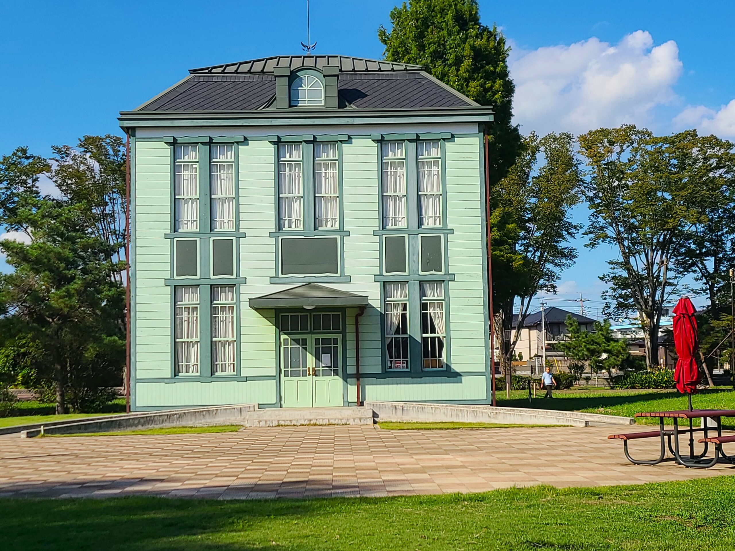 旧忍町信用組合店舗は大正11年(1922)8月建設の腰羽目板付下見板コロニアル様式の木造二階建て洋風銀行店舗で、腰折屋根にはスレートを菱葺きしています。忍町信用組合は、大正4年(1915)に時田啓左衛門ら足袋商店主たちが組織した共楽会を母体として創業した地元金融機関で、その創業時の店舗です。原料卸売商が足袋商店から受け取った手形や足袋商店が全国各地の卸売業者や小売業者から受け取った手形などが多く持ち込まれ、組合で手形の割引が行われました。こうした足袋関連の企業間の信用決済業務を多く行うことで足袋産業の発展を支えました。市内でも数少ない洋風木造建築としても貴重な存在です。現在水城公園東側園地に移築されVert Caféに。