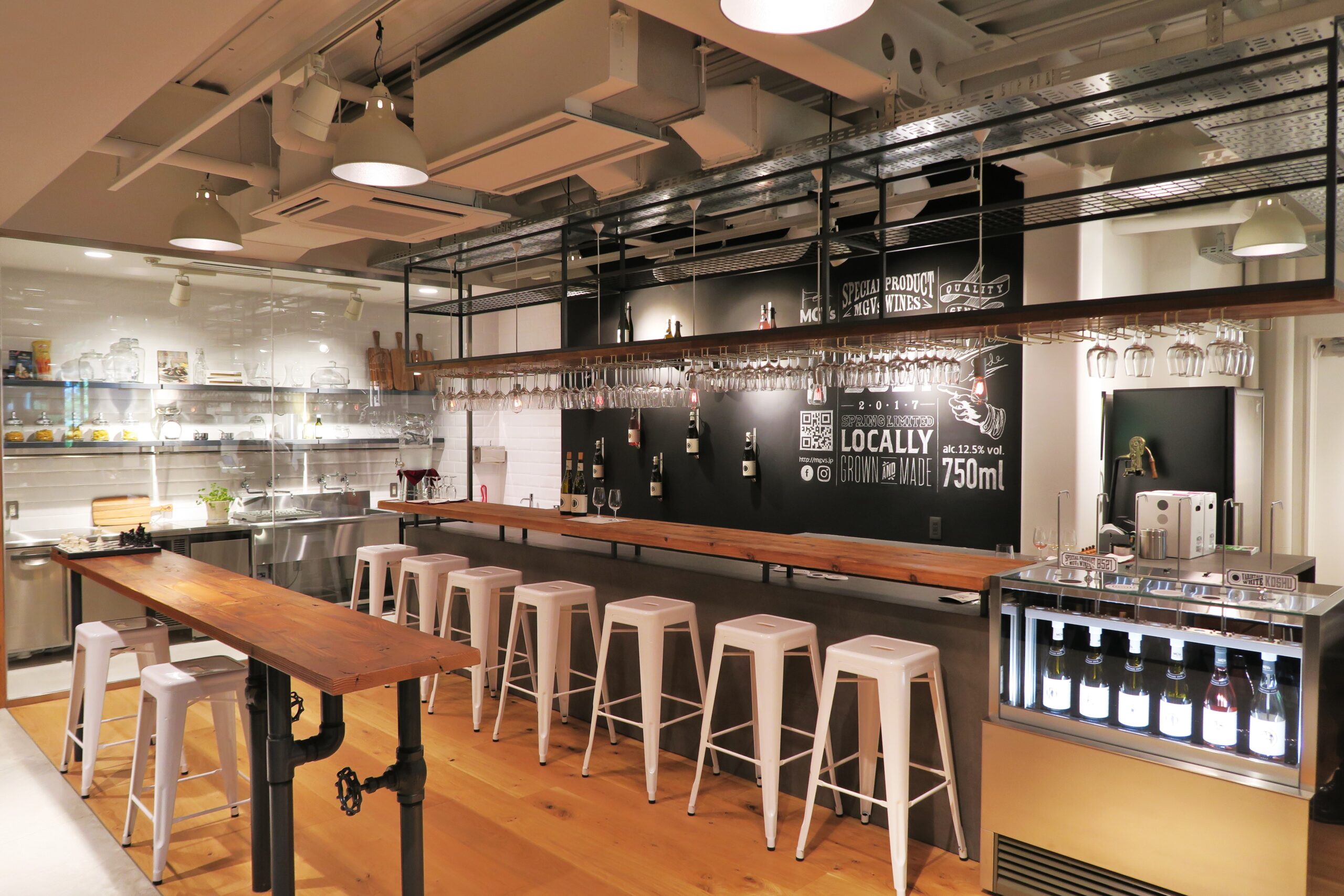 試飲しながらカウンター越しに見える大きく描かれた手描きのチョークアートも必見ですよ。毎月かわるのが楽しみです。スタイリッシュなカウンターバーでお洒落に試飲はいかが!
