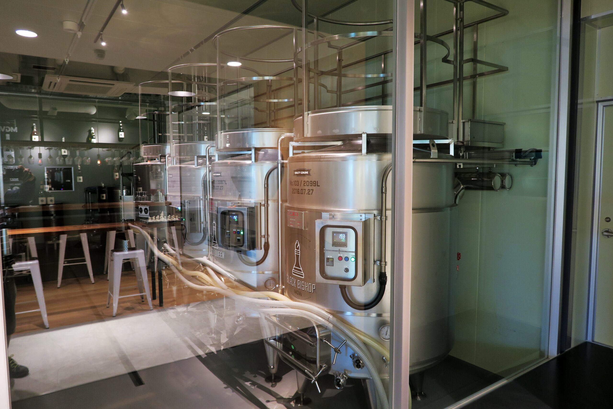 かつて半導体工場であった建屋を全面リノベーションしながらも、もともとインダストリーであったというイメージを生かした作りになっています。黒の壁面に白色が鮮やかに屋外にそびえ立つ液化窒素タンクは、半導体の洗浄に使用していたものですが、今ではワイン製造の際にワインが空気に触れないようにするために活用されています。