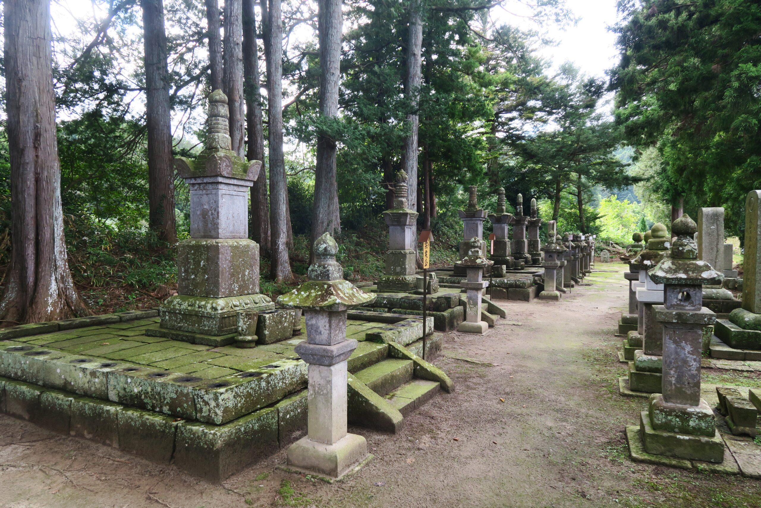 亘理伊達家歴代墓所には13代実氏までの歴代藩主および夫人・子女等の墓石が並びます。特に墓地中央部には2代から5代夫人までの墓が宝篋印塔という見事な石の塔で造られたものになっていて、仙台藩一門の雄である亘理伊達家の格式の高さを表しています。