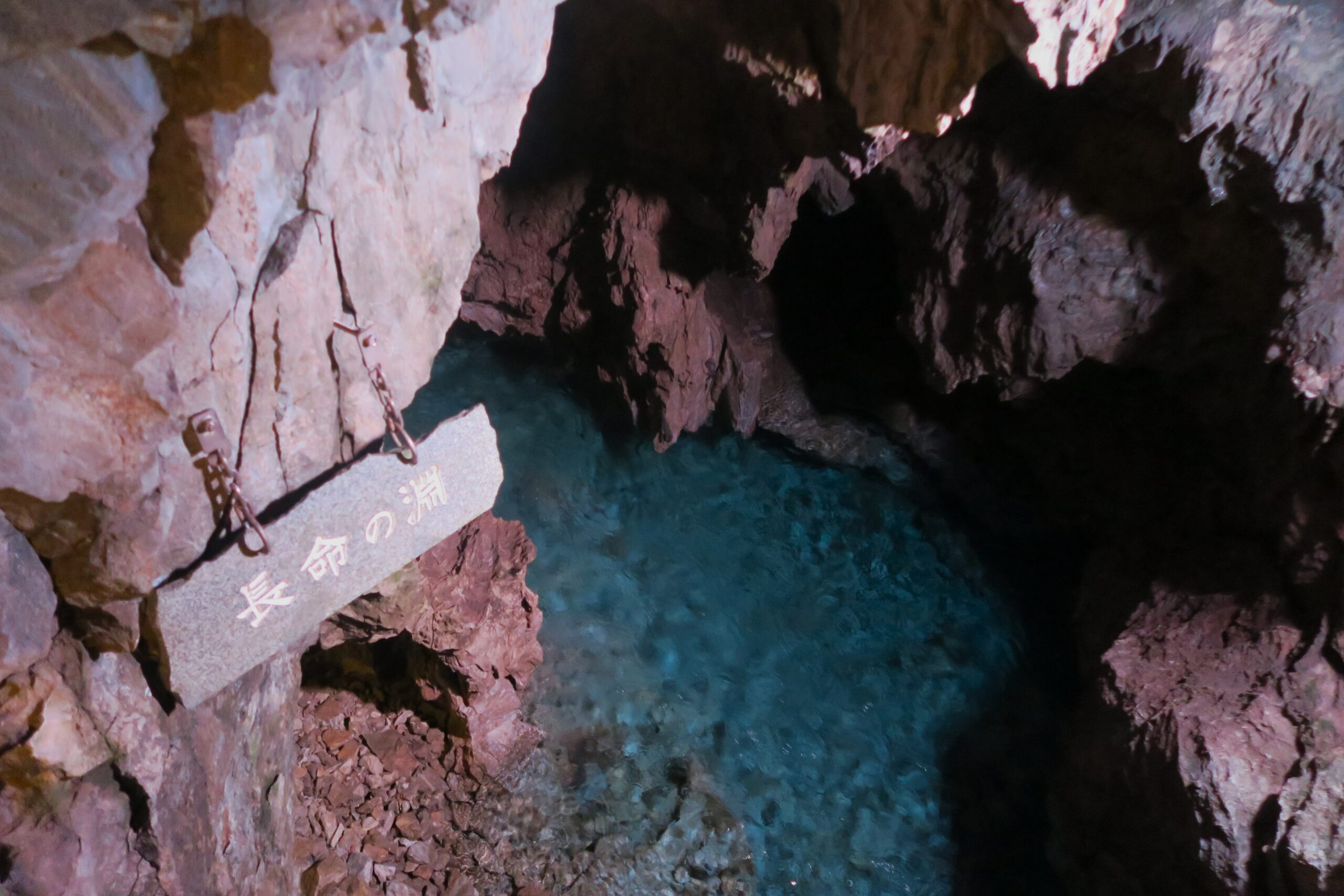 崖下の入り口から早速、鍾乳洞の足を踏み入れます。たちまち中は暗くなり、気温はぐっと下がる。入口からすぐ、地下水の流れが集まる淵が「長命の淵」です。通路の横を川のように流れる地下水の透明度にいきなり驚き、龍泉洞が水の鍾乳洞であることを実感します。