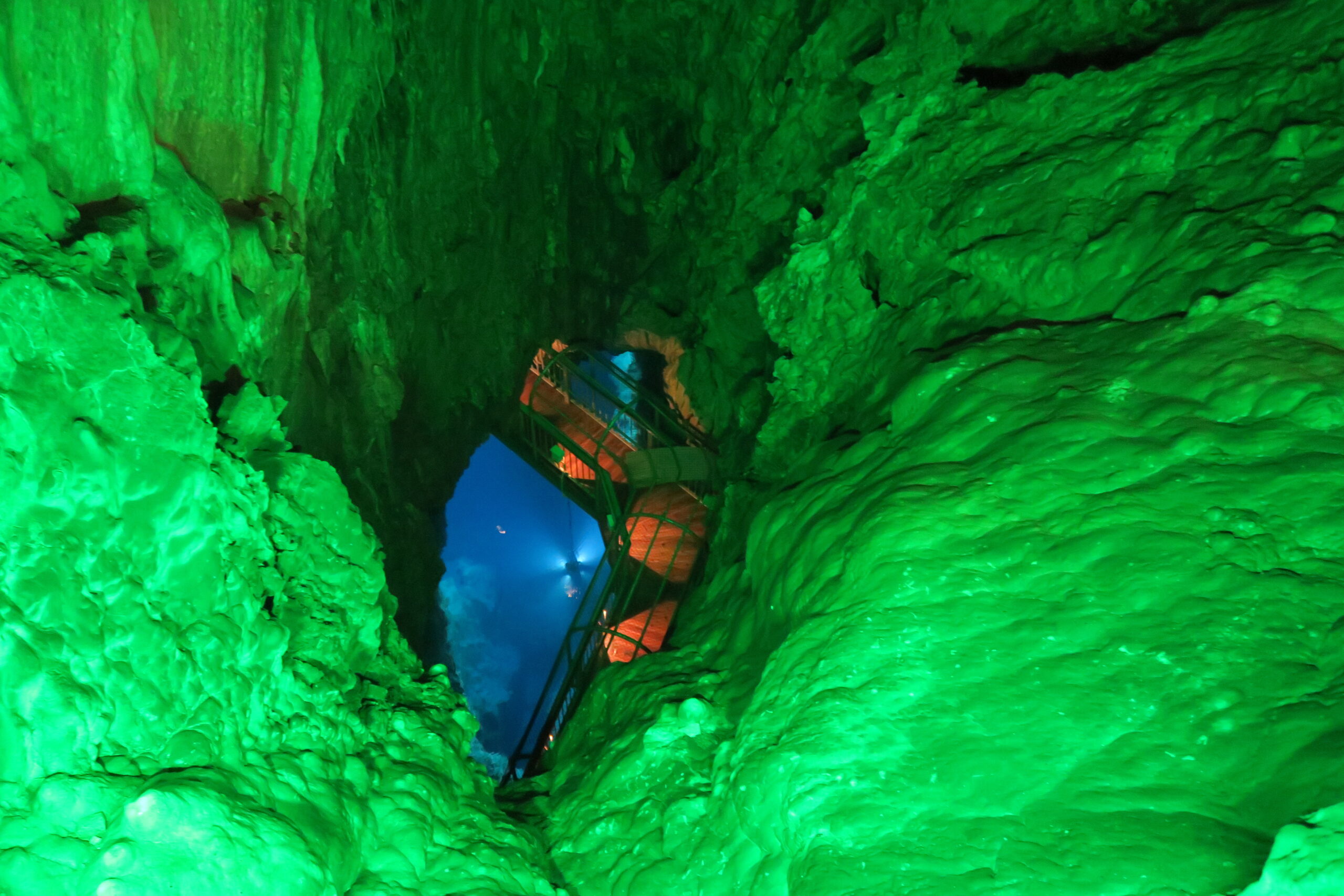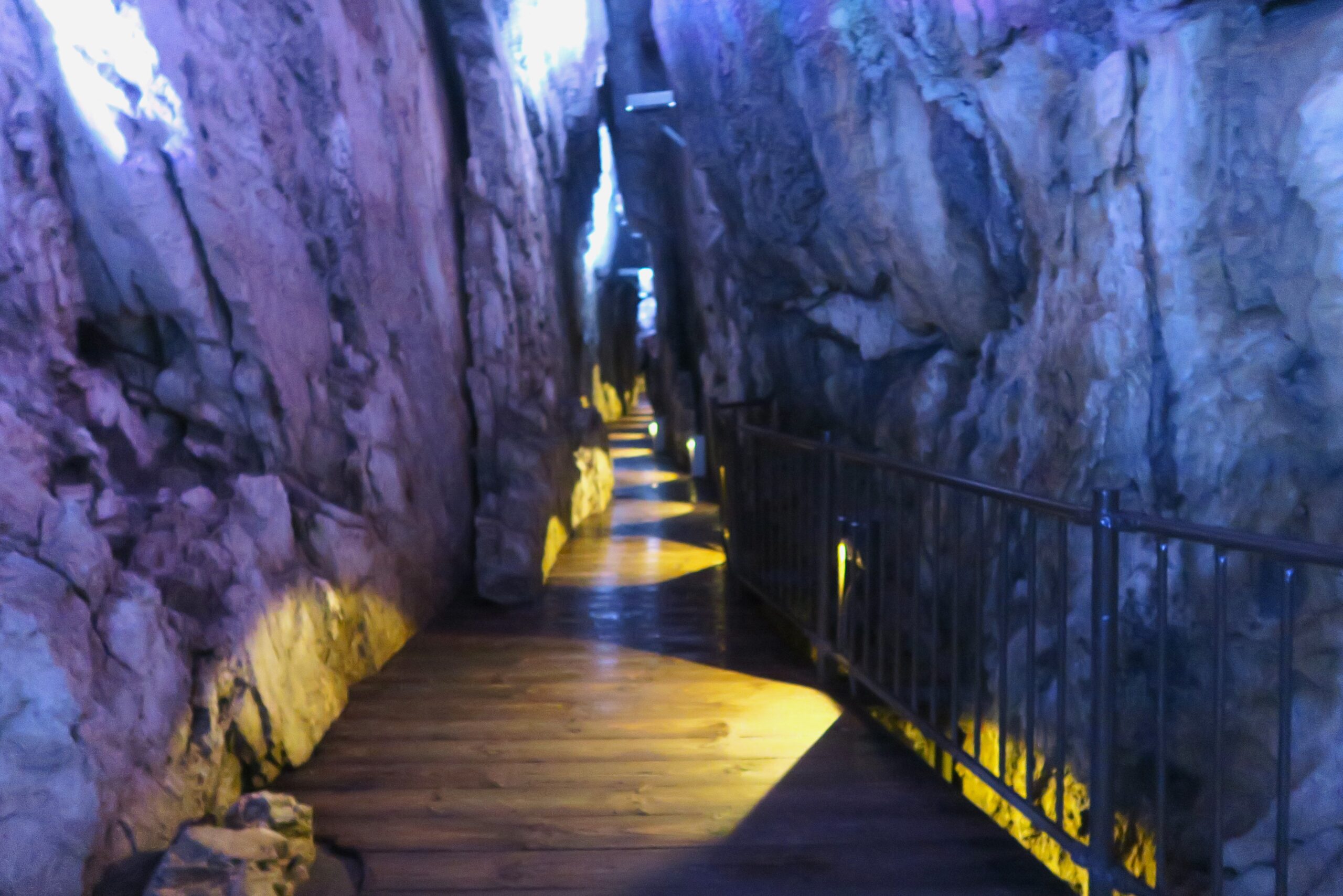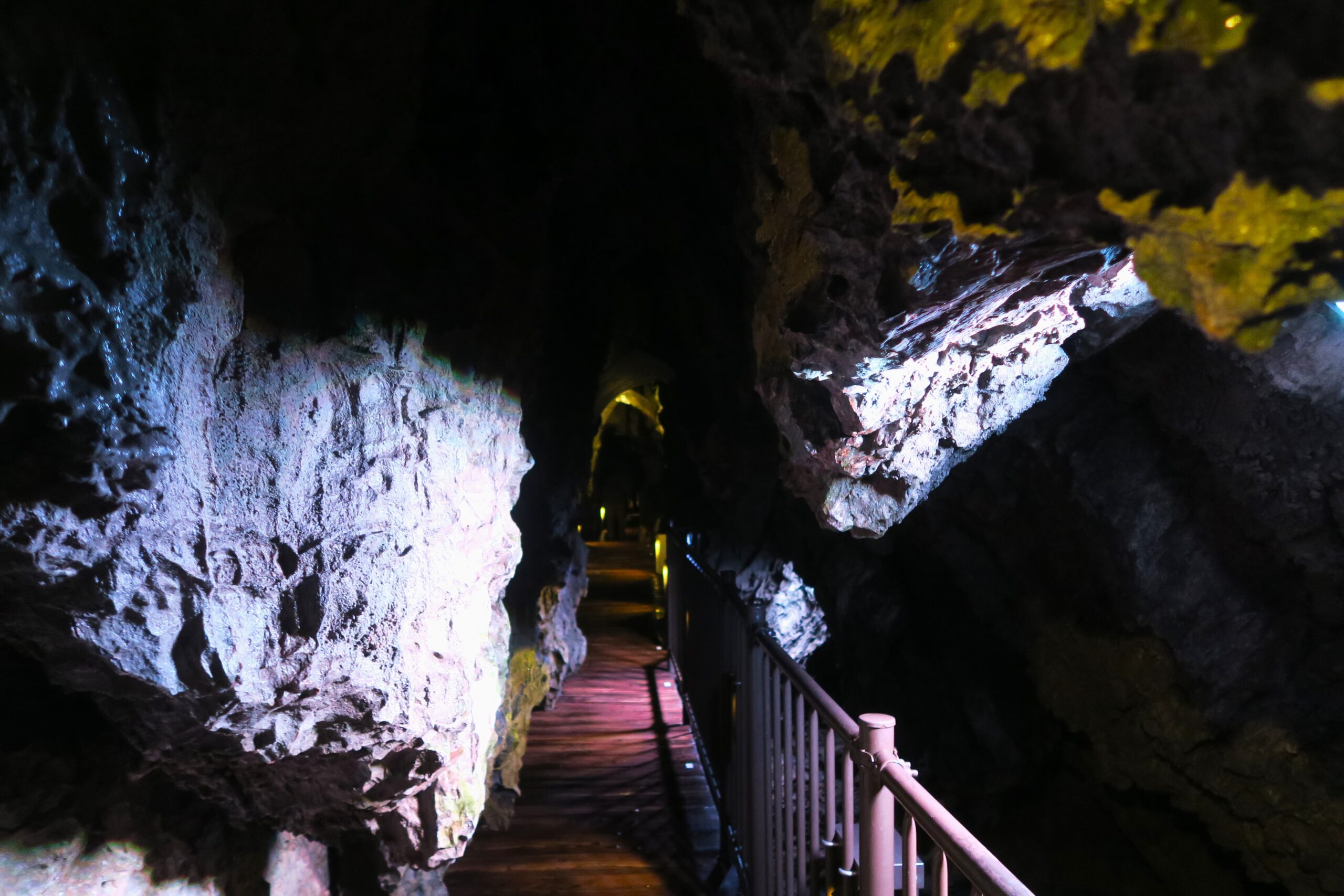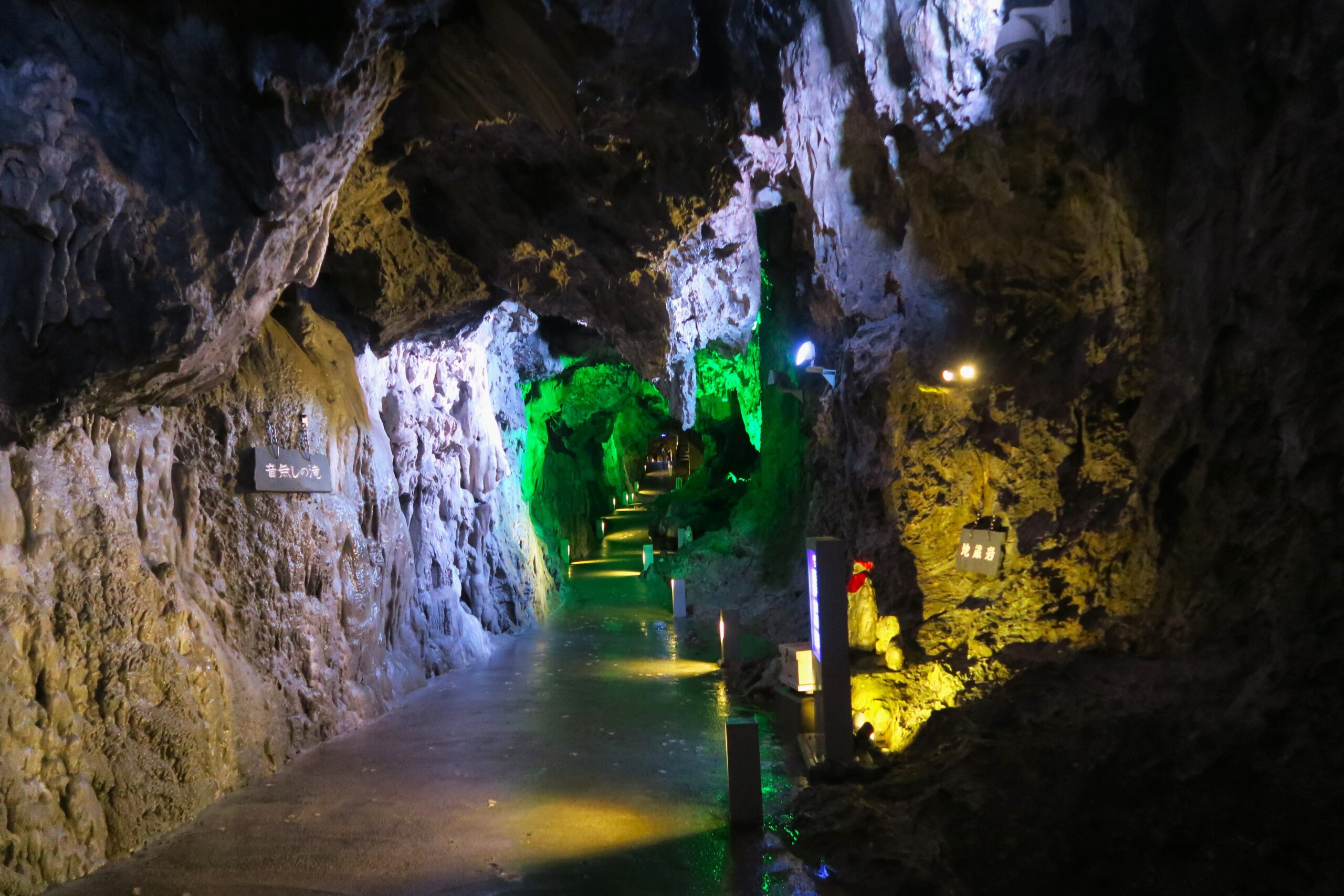 幅数mの細長い裂け目がぽっかり口を開けていて、龍が通った道とも言われる細長く続く空間を、ところどころに照明があるおかげで先まで見通せる。石灰岩の中の洞窟は、水が集まりやすい断層に沿って形成され、一定方向に延びる性質があるため見事に一直線で、この直線部分は「百間廊下」と名付けられています。