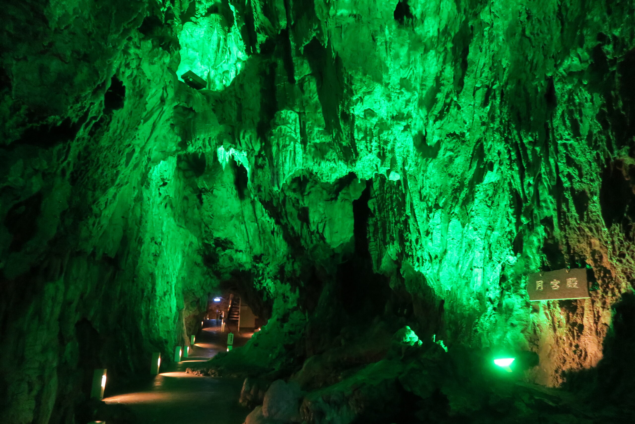 水の流れから離れてしんと静まり返ったせいもあるのか、ことさら広く感じられる「月宮殿」と名付けられたこのホールにはさまざまな形の鍾乳石が並び、その岩肌が、LED照明で幻想的な月の世界を演出しています。