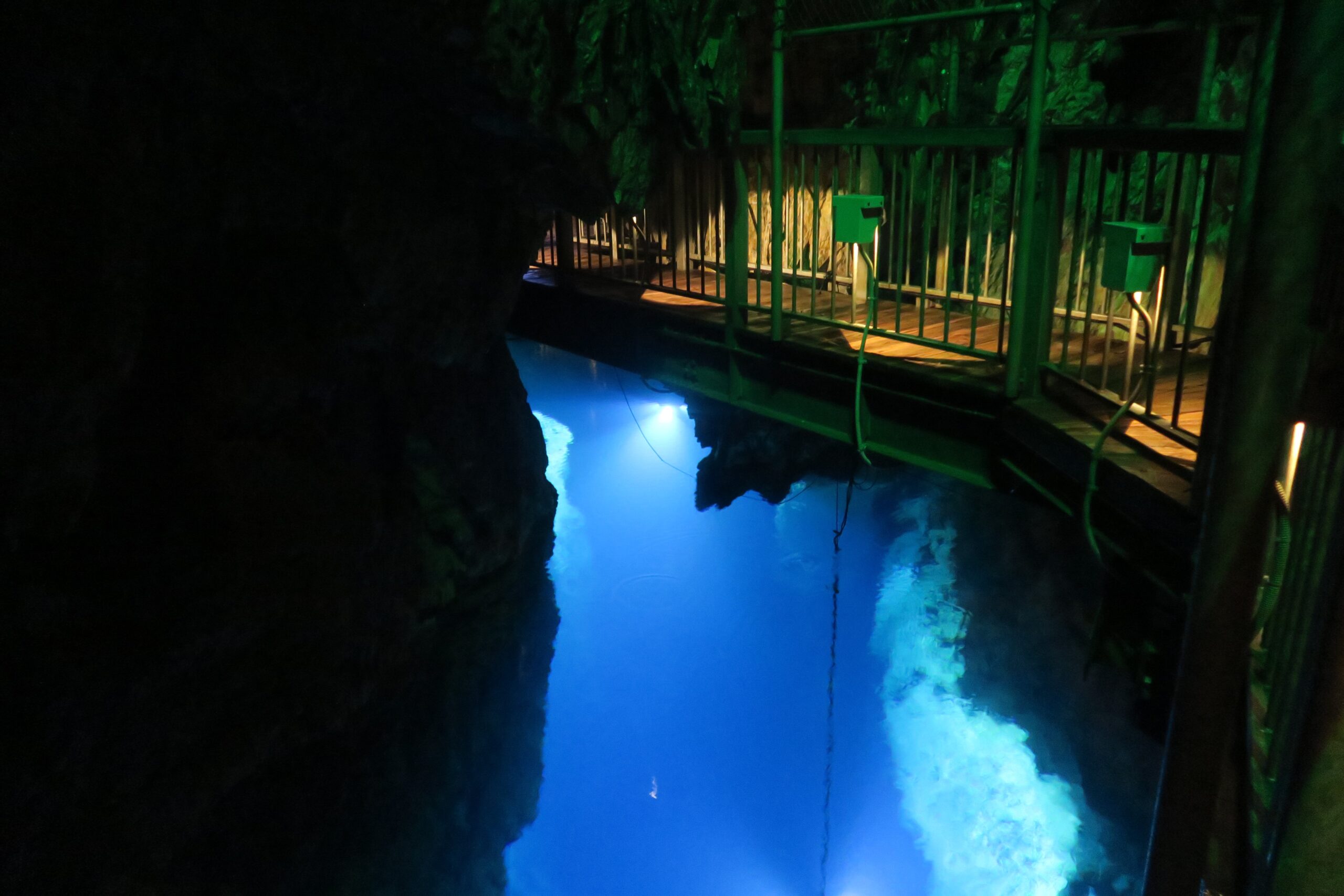 階段を下るとやがて板張りの歩道に変わる。その先の光景はこれまで目にしたどんな風景よりも神秘的でした。水中ライトに照らし出された湖は、どこまでも透き通った目が覚めるほどの青色の水を湛えています。この透明な青色は、吸い込まれそうなほど透明な輝きから「ドラゴンブルー」と呼ばれ、底のほうまで見える深い水には龍の水神様が棲んでいそうな雰囲気です。昭和30年代の調査で発見された第一地底湖で水深は35mと書かれていましたが、透明度がとても高いおかげで、薄明りでも底の方まで見渡せる。おまけに周囲が暗いので、足下にコバルトブルーの水塊が浮かんでいるようにも見えます。今のところ龍泉洞には第八地底湖があることまでわかっていますが、一般のルートは第三地底湖までです。