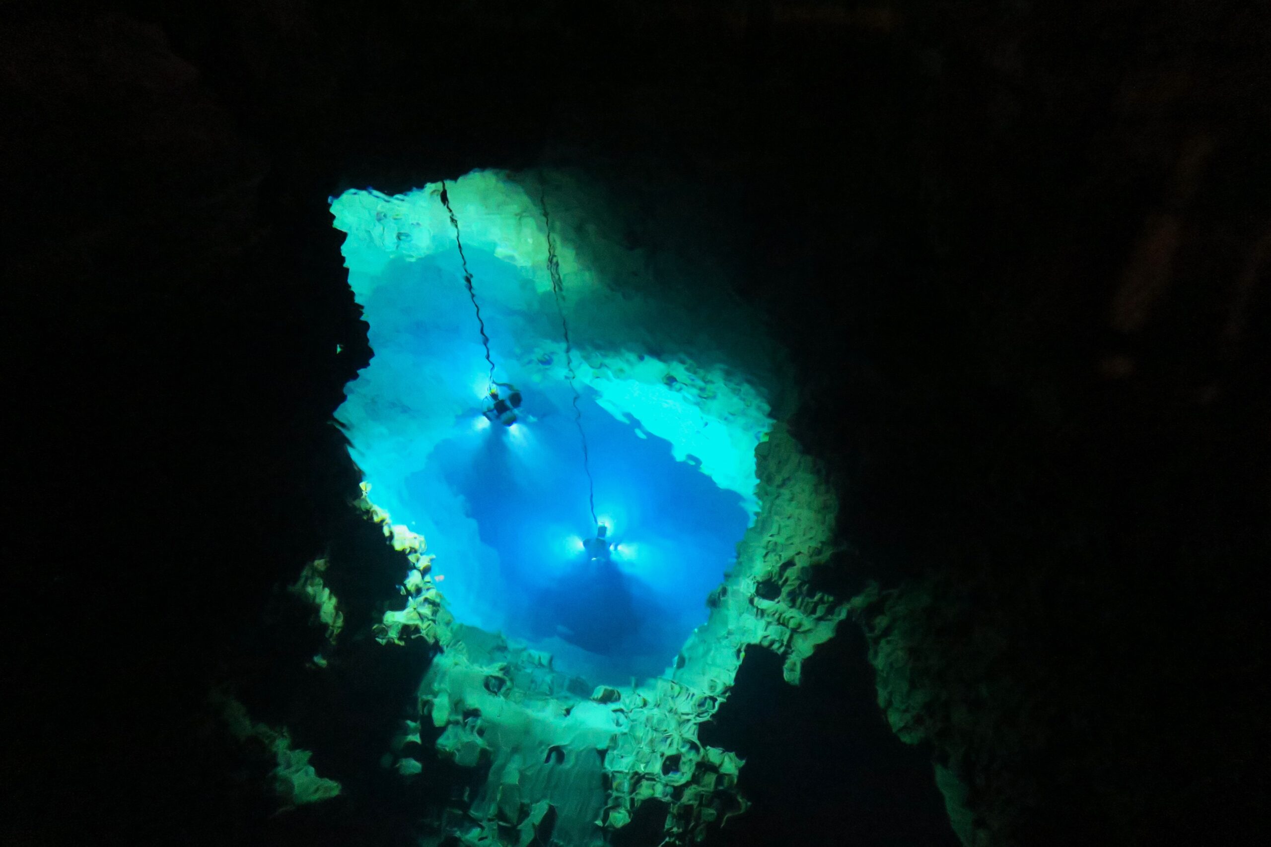 第一地底湖から続いて第二地底湖は水深38m、昭和37年(1962)の潜水調査で発見された地底湖です。