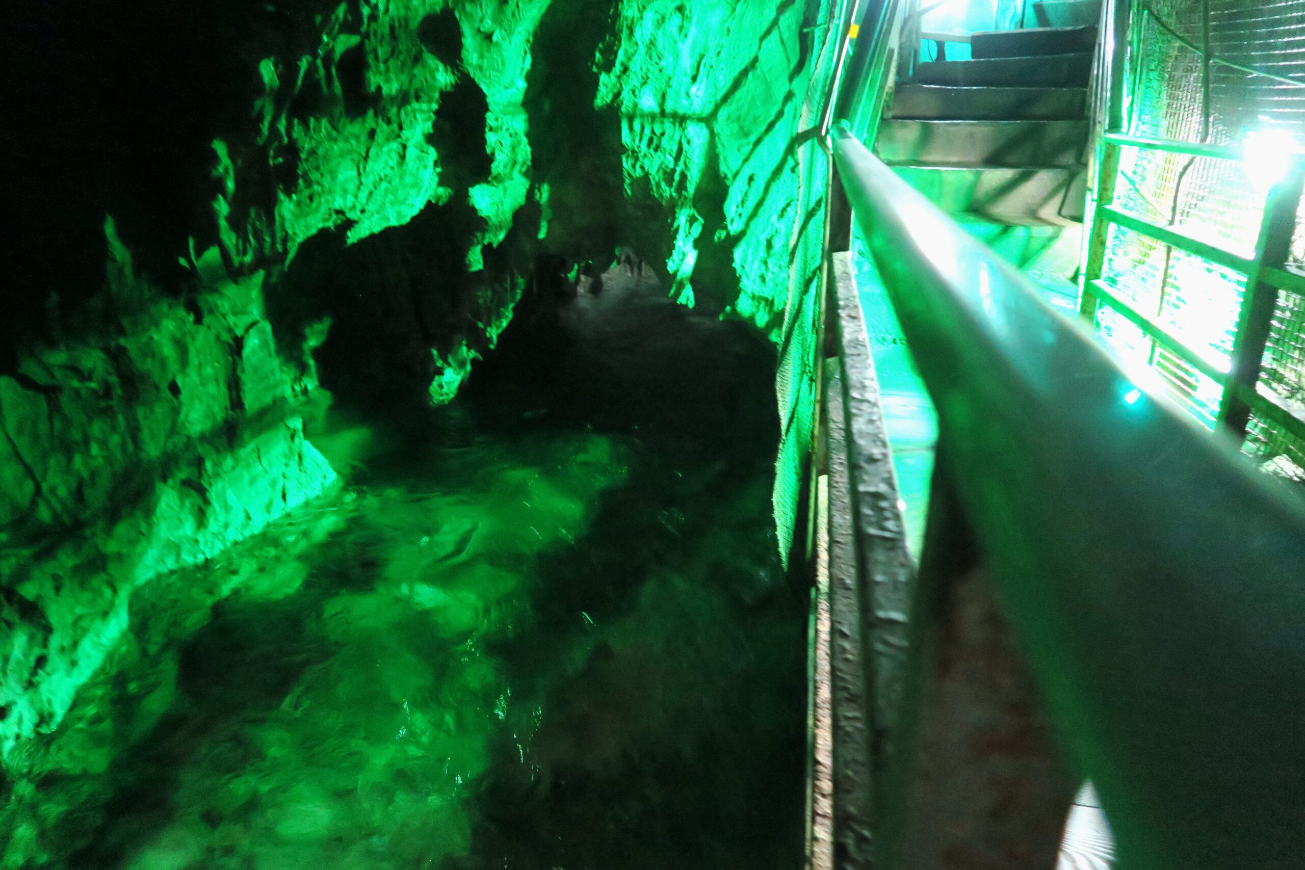 観光コースの最終地点にある第三地底湖は水深98m、昭和42年(1967)の潜水調査で発見されました。ここまで所要時間30分。