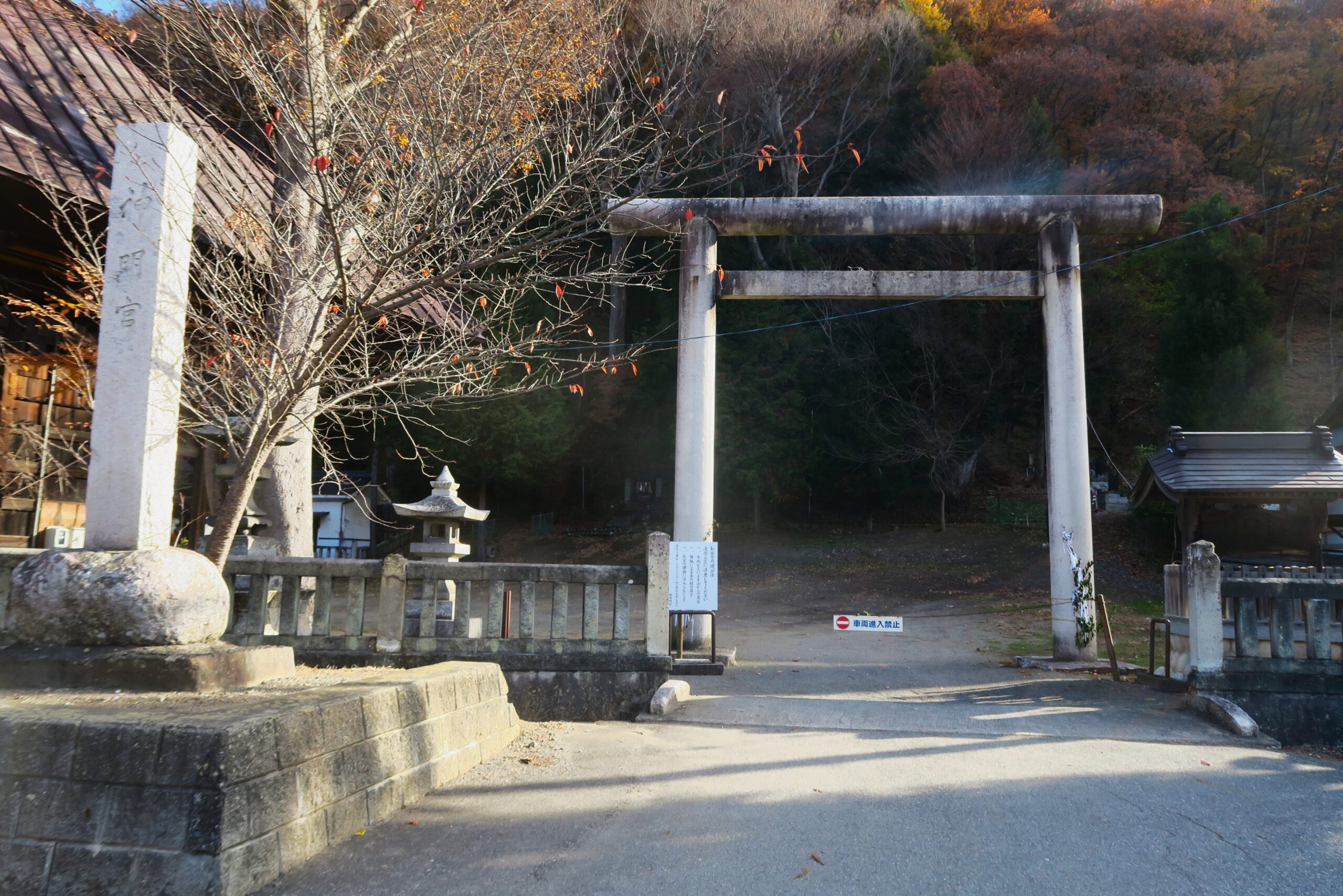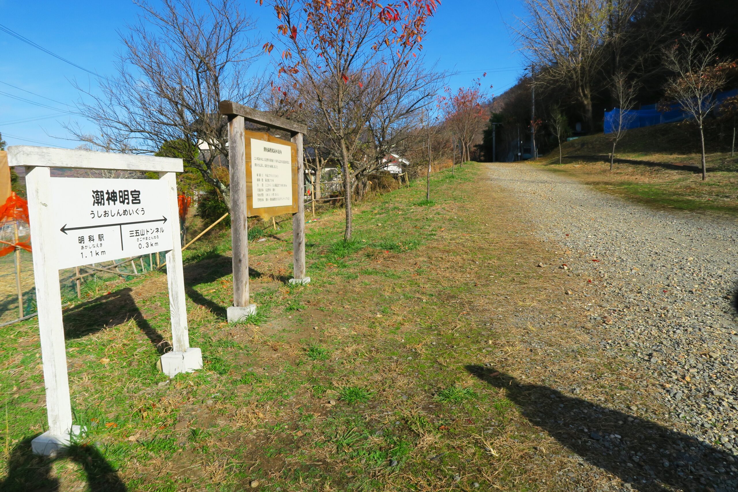 明科駅から標識に従って廃線敷を目指します。川を渡り、線路下を越えて30分ほど歩くと、潮神明宮です。途中第1白坂トンネルが見えます。