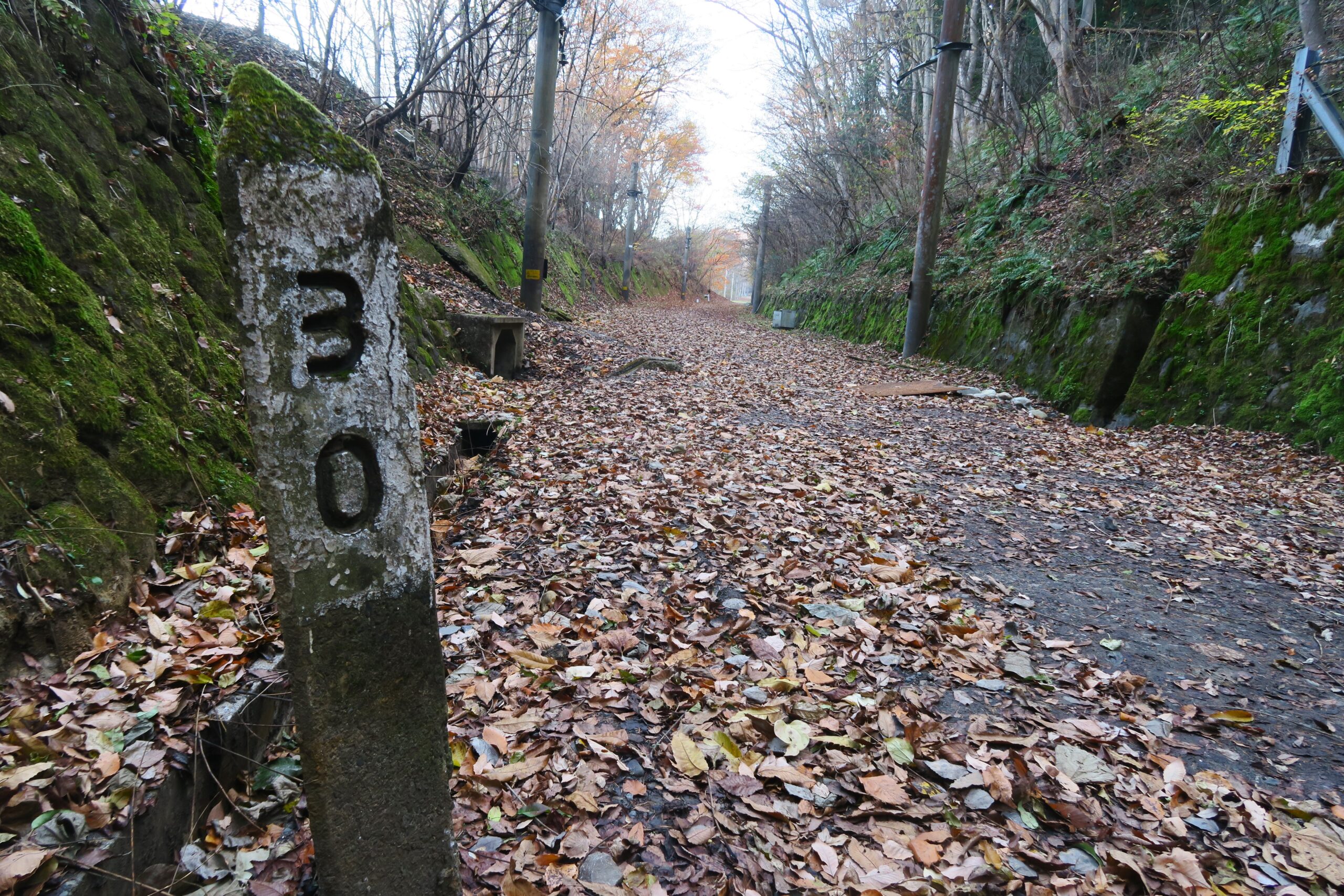 この先から旧第二白坂トンネルまで最急勾配25‰の急坂が続き、雨天時に蒸気機関車が滑って上れないため勢いをつけて上り直す光景も珍しくなかったといいます。当時のキロポストも残され、数字は塩尻駅からの距離(30km)を示しています。