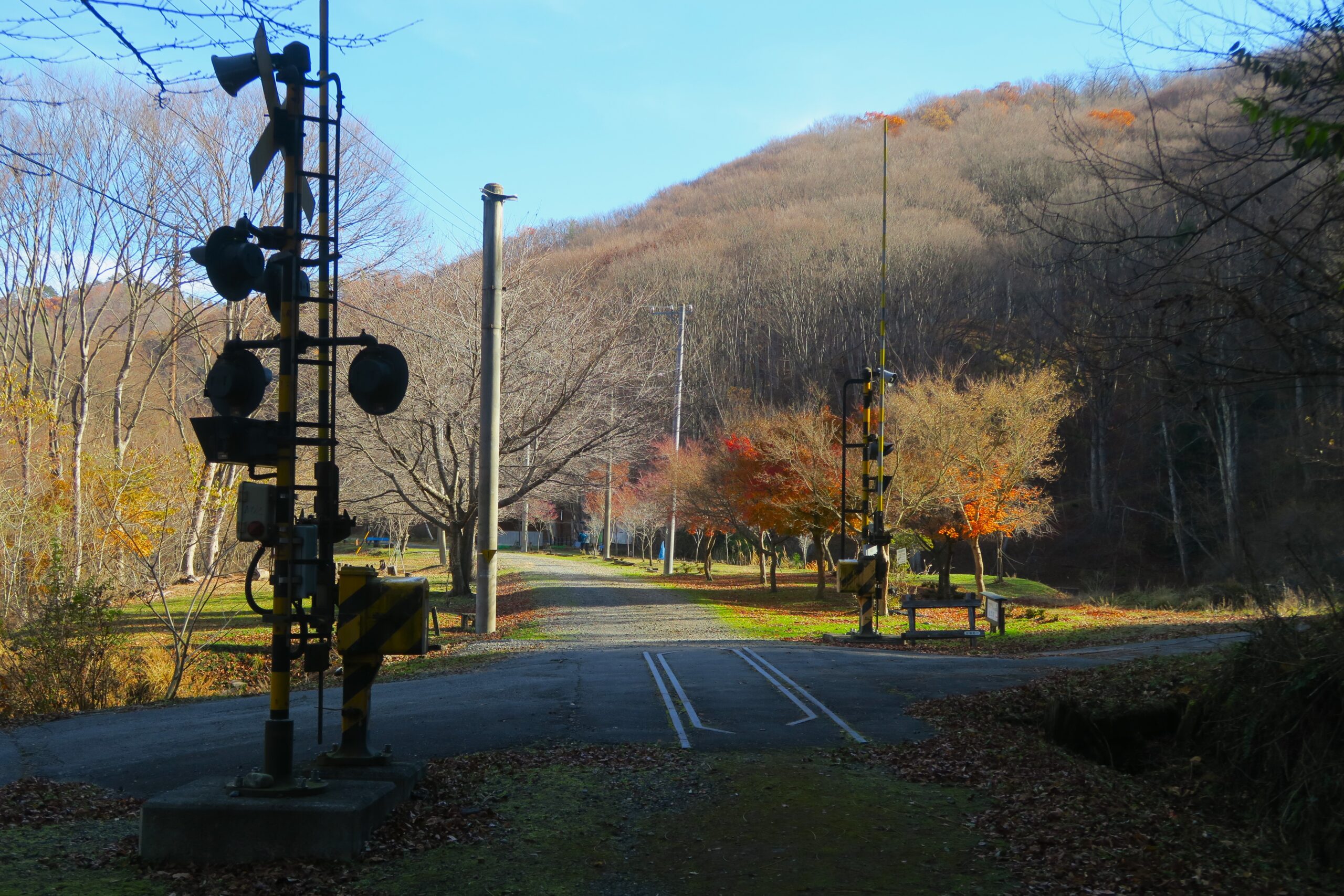 けやきの森の手前にはコース内に唯一残る当時のレール。遮断機はあとから設置されたものとのこと。