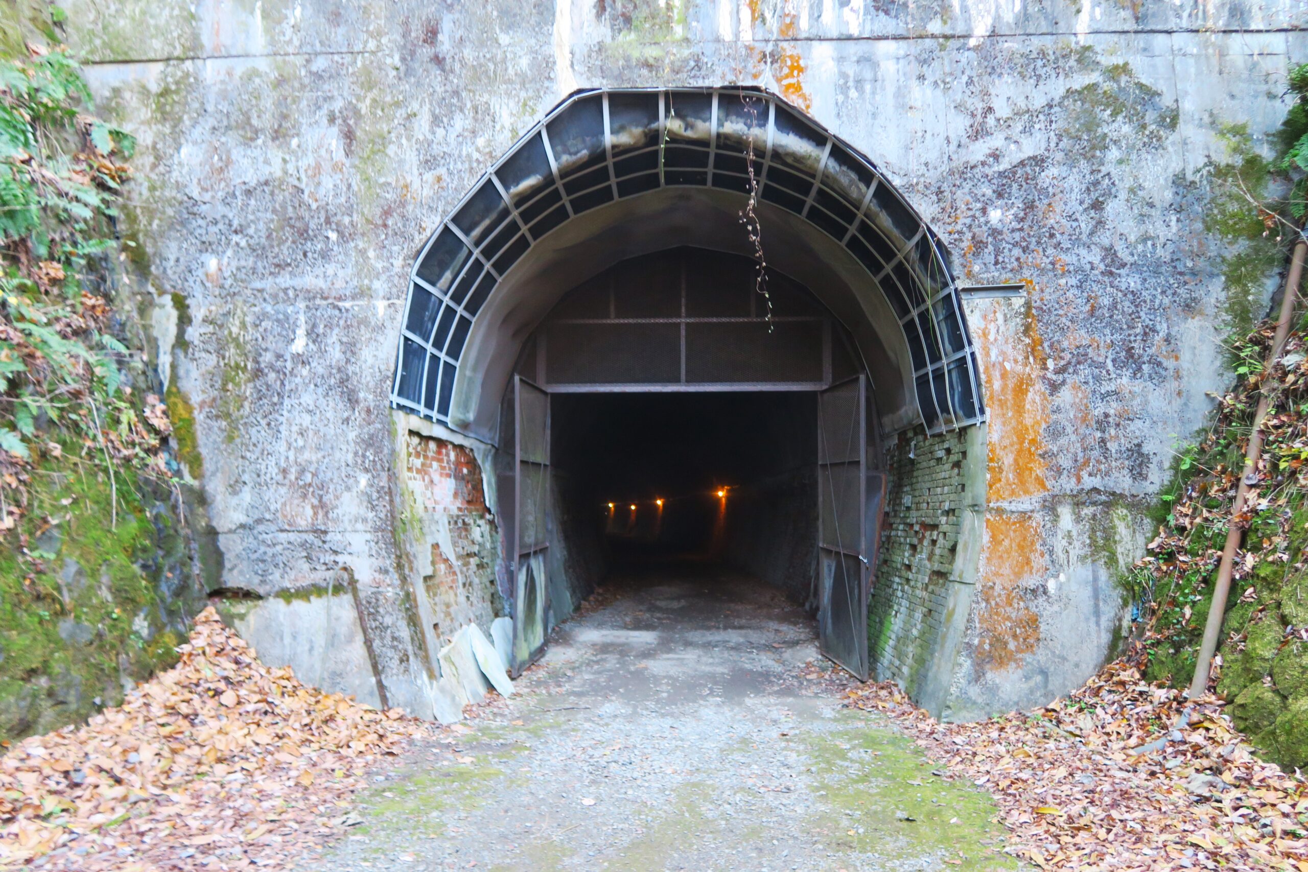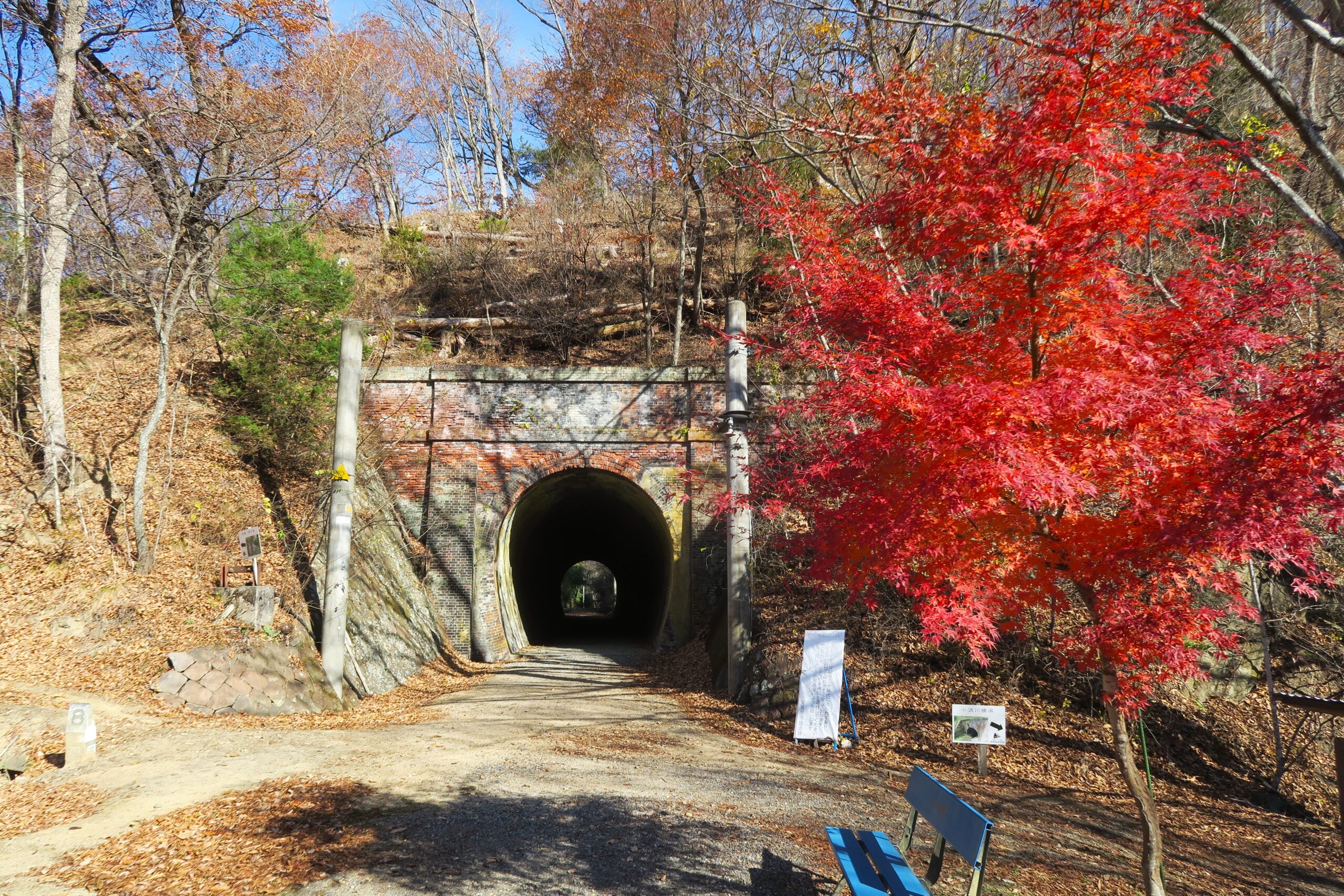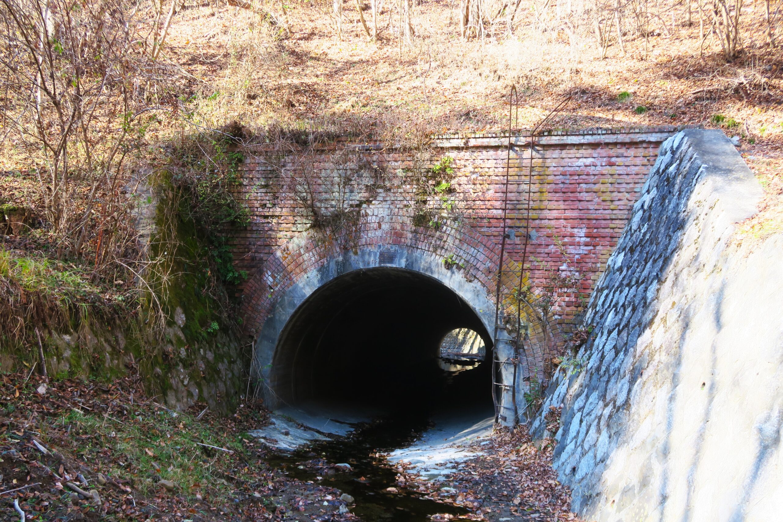 けやきの森から10分ほどで見えてくるのが、漆久保トンネルです。地元では「うるしゃくぼ」と通称される地名を冠した、明治35年6月の全線開通にあわせて開削されたトンネルで、全長35m、三五山トンネルとともに明科で焼成されたレンガを使用しています。開業当時から今まで補修工事もされていないので、天井を見上げると、蒸気機関車が吹き上げた煤の跡が残っていてレンガ色とのコントラストが鮮やかです。まさに明治の近代遺産といえるトンネルです。