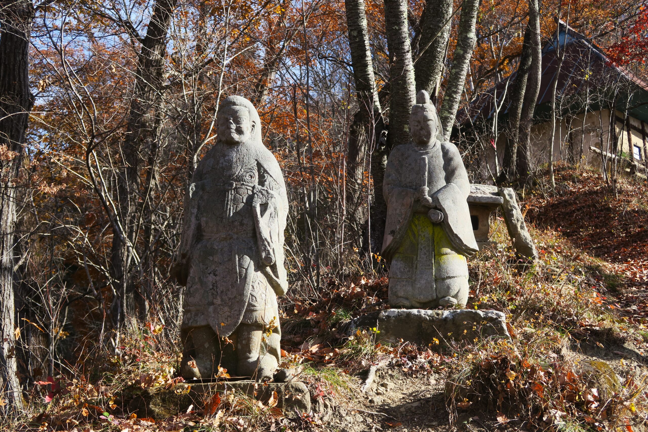 漆久保トンネルの上には木曾御岳山の表参道を開いた普寛様(烏帽子を被っている)と裏参道を開いた覚明様の2体の石像が据えられています。トンネルの上を通る細い道は大昔の善光寺街道で、ここから山を登り、柏尾の峰をとおり名九鬼の上に出る近道でした。そこから矢越や池桜の峠を越えて、善光寺への道を辿ったと言われています。この2体の像は道を通る旅人の安全を願って祀られたと思われます。