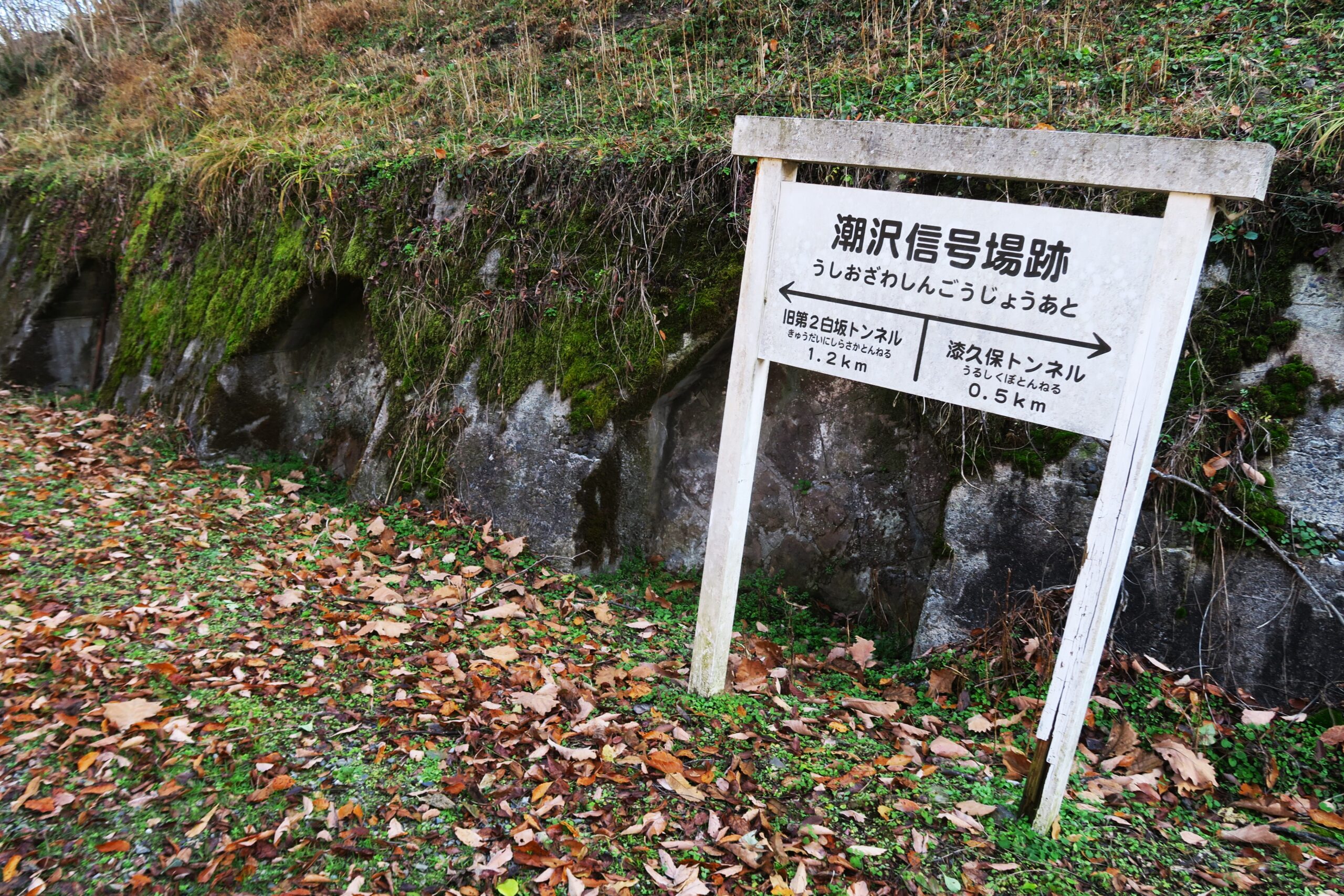 トンネルに戻りさらに15分ほど行くと、潮沢信号場。この辺りは標高634mで東京スカイツリーの先端と同じ高さとのこと。漆久保トンネルと旧第2白坂トンネルとの間に位置する行き違い退避のためのスイッチバック式信号場です。篠ノ井線の山岳区間に位置し、潮沢川に沿って蛇行しながら、最大25‰(パーミル=25/1000)の急勾配を上るルートで、高度経済成長に伴って輸送力の向上を目指し、桑ノ原信号場(姨捨駅~稲荷山駅)と同じ、昭和36年(1961)9月に設置されています。電化後も普通列車は、ここで引き上げ線に入って、特急「しなの」の通過退避をしていました。