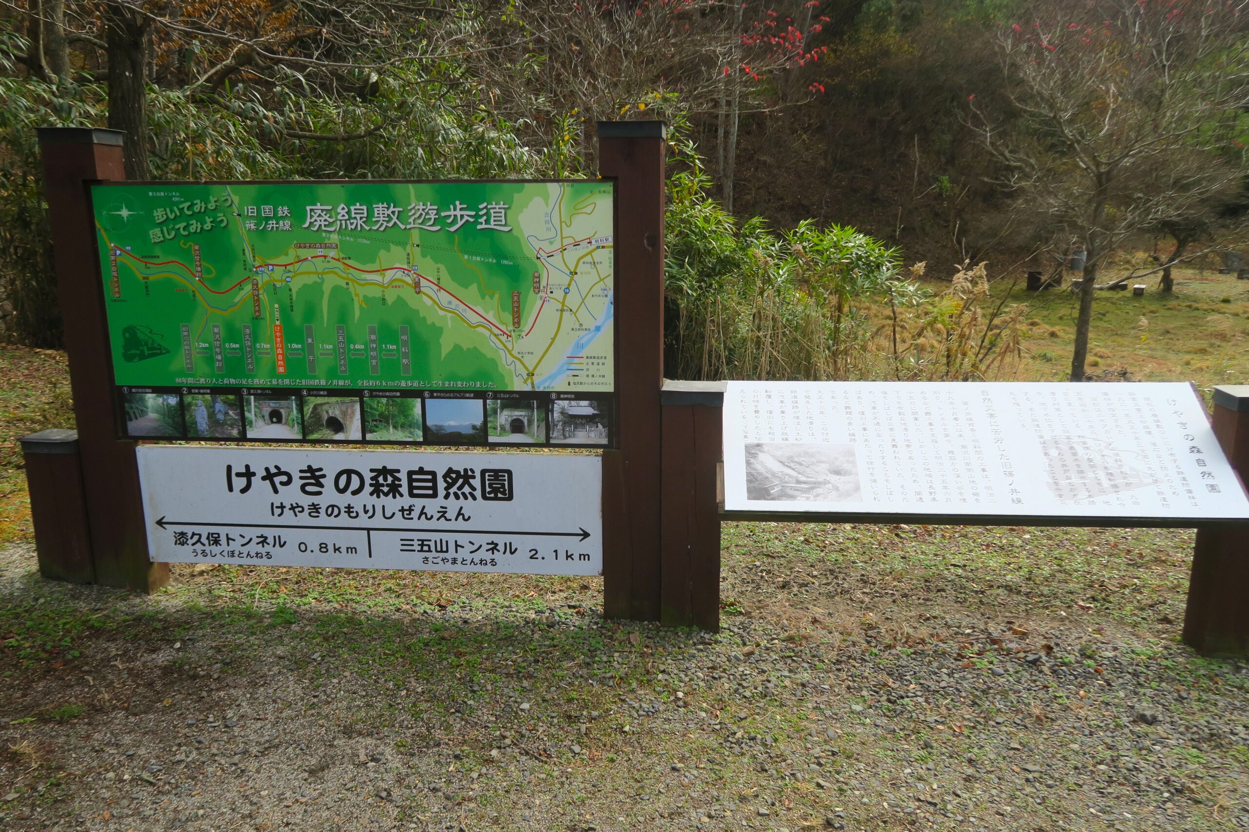 篠ノ井線明科~西条間の工事は明治29年の10月の着工以来、潮沢川南側山地の裾を削り、トンネルを穿ち、幾筋かの深い谷を埋めるなどの難工事を克服して明治35年6月に開業しました。しかしこのあたりから白坂までの一帯は長野県内有数の地滑り多発地帯だったため、保水や地盤を安定させるために、大正10年(1921)に全国に先駆けて造られた鉄道防備林として旧線の周辺20haの斜面に3万本以上のケヤキの木が植えられています。木々包まれた遊歩道を歩くと、森林の爽やかな空気、香りの正体であるフィトンチッドで、身体がリフレッシュしていきます。