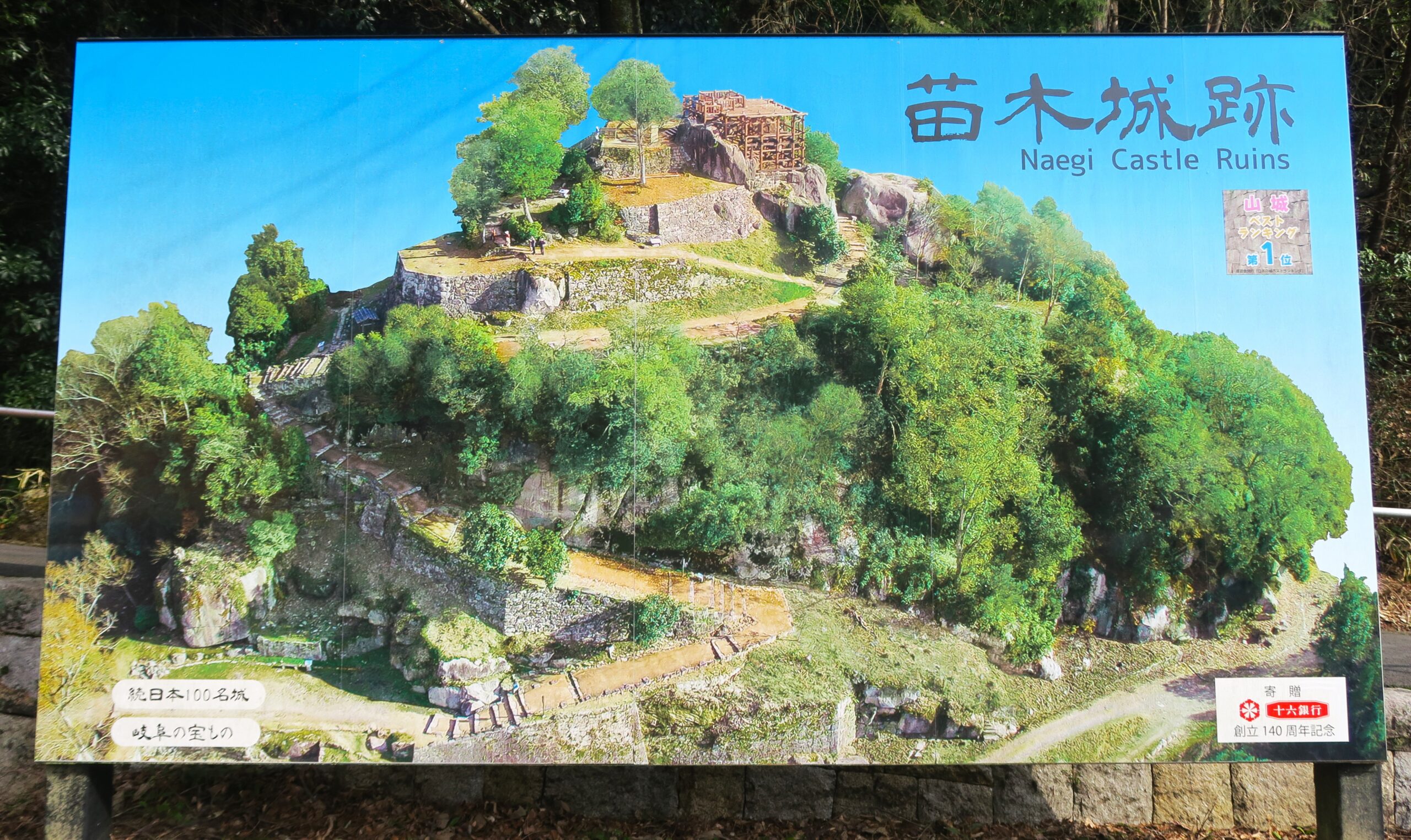 苗木城は、中津川市内を東西に流れる木曽川右岸、一段と高く聳える標高432mの高森山にあります。木曽川から山頂の天守跡までは、標高差約170m、急峻な地形を生かして大永6年(1526)苗木の北方6kmほどの植苗木の広恵寺城を拠点としていた苗木遠山氏の遠山一雲入道昌利が移り住み、見張りに適した高森山に築かれた山城です。その後、岩村遠山家から苗木遠山家に養子に入った遠山直廉が拡張し、直廉が死去した後は飯羽場遠山氏が養子となり苗木城主となりましたが、豊臣秀吉配下の森長可により落城します。慶長5年(1600)関ヶ原の戦いに先立ち徳川家康の指示で遠山友政が18年ぶりに奪還し、以後江戸時代を通じて12代にわたり遠山氏が城主として苗木藩1万石を治めました。苗木城は友政により現在の姿へと整備されたようで、石垣のほとんどは友政によるものと思われます。江戸時代末期まで1万石で城持ち大名だったのは遠山氏のみで、小藩ながらも戦国期の面影をとどめた近世城郭です。