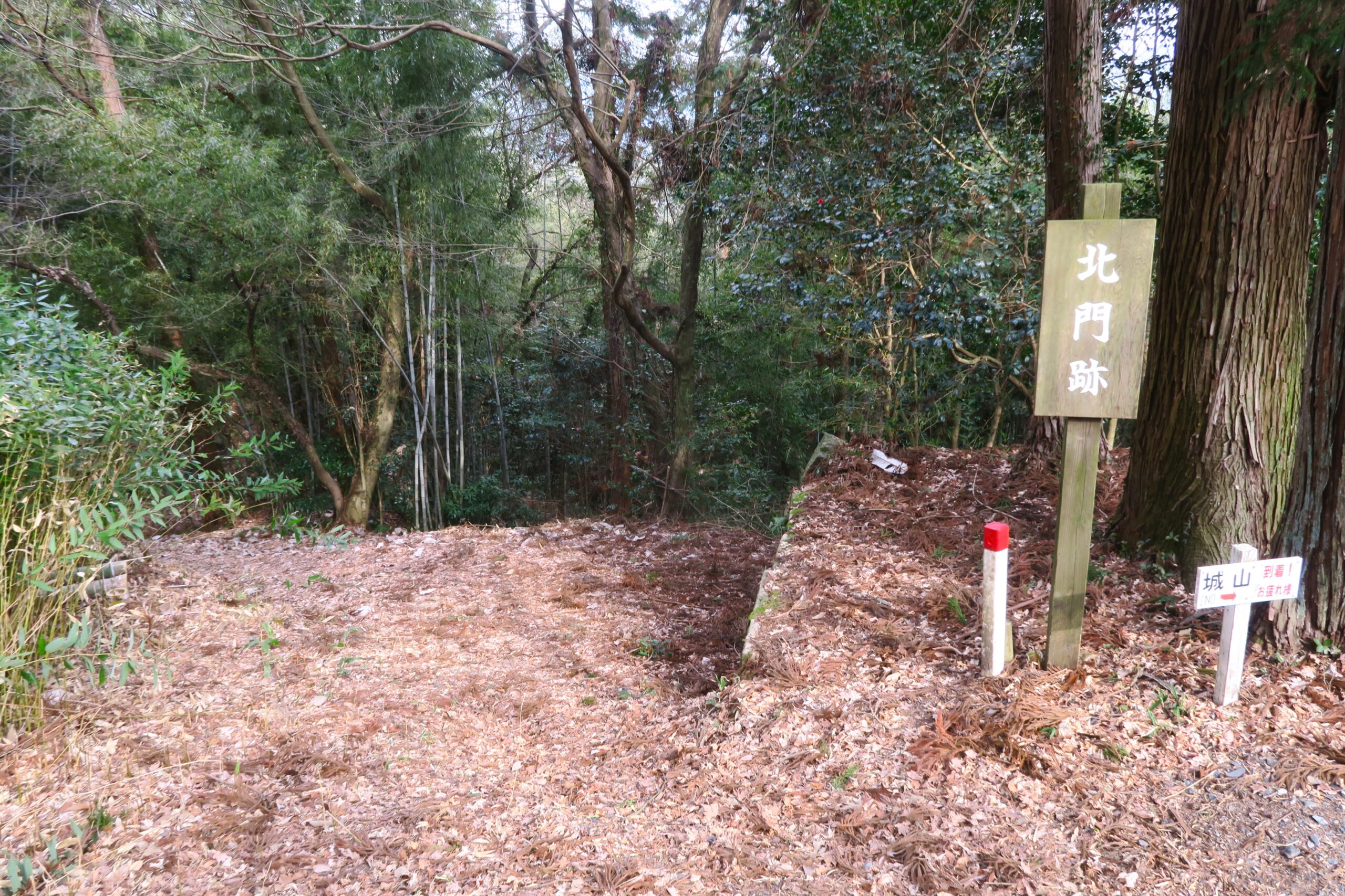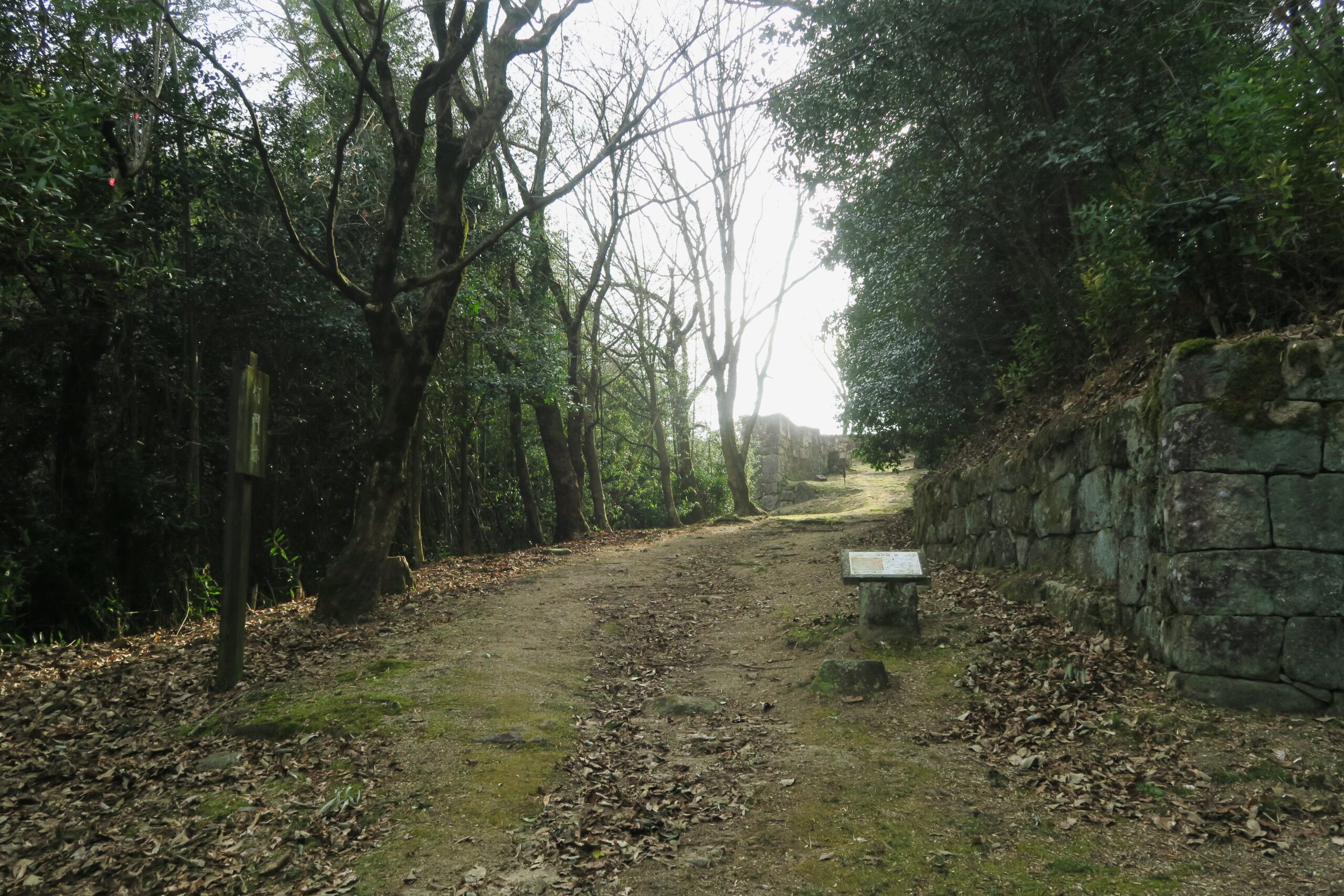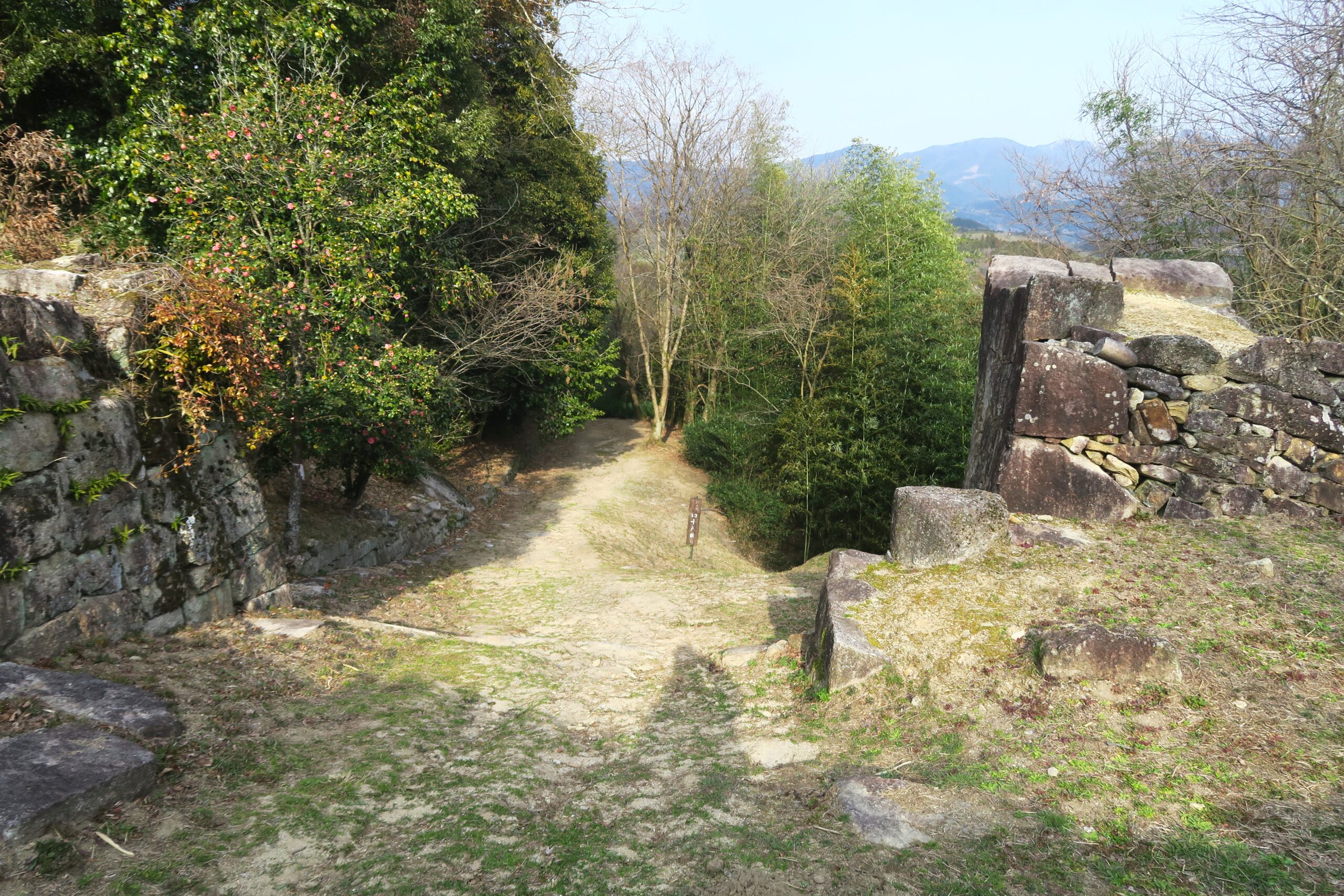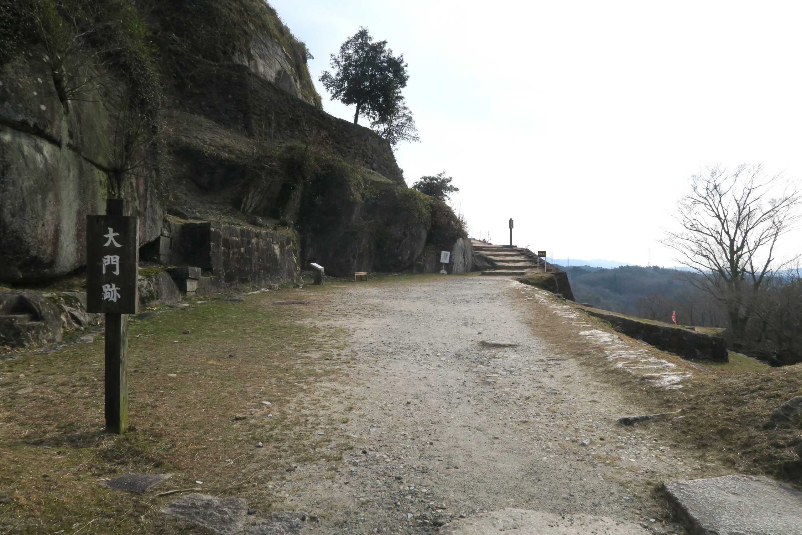 中津川駅までは約3.5km、徒歩約1時間の距離です。大矢倉を囲んで北門からと駆門からの合流地点にあるのが竹門跡。苗木城には竹門という名の門が2カ所あり、いずれも外郭にある二脚門でした。往時は竹で戸を据え付けてあり、門番はおらず開けっぱなだったといいます。領主は竹門から藩士は北門から城にに入ったとのこと。
