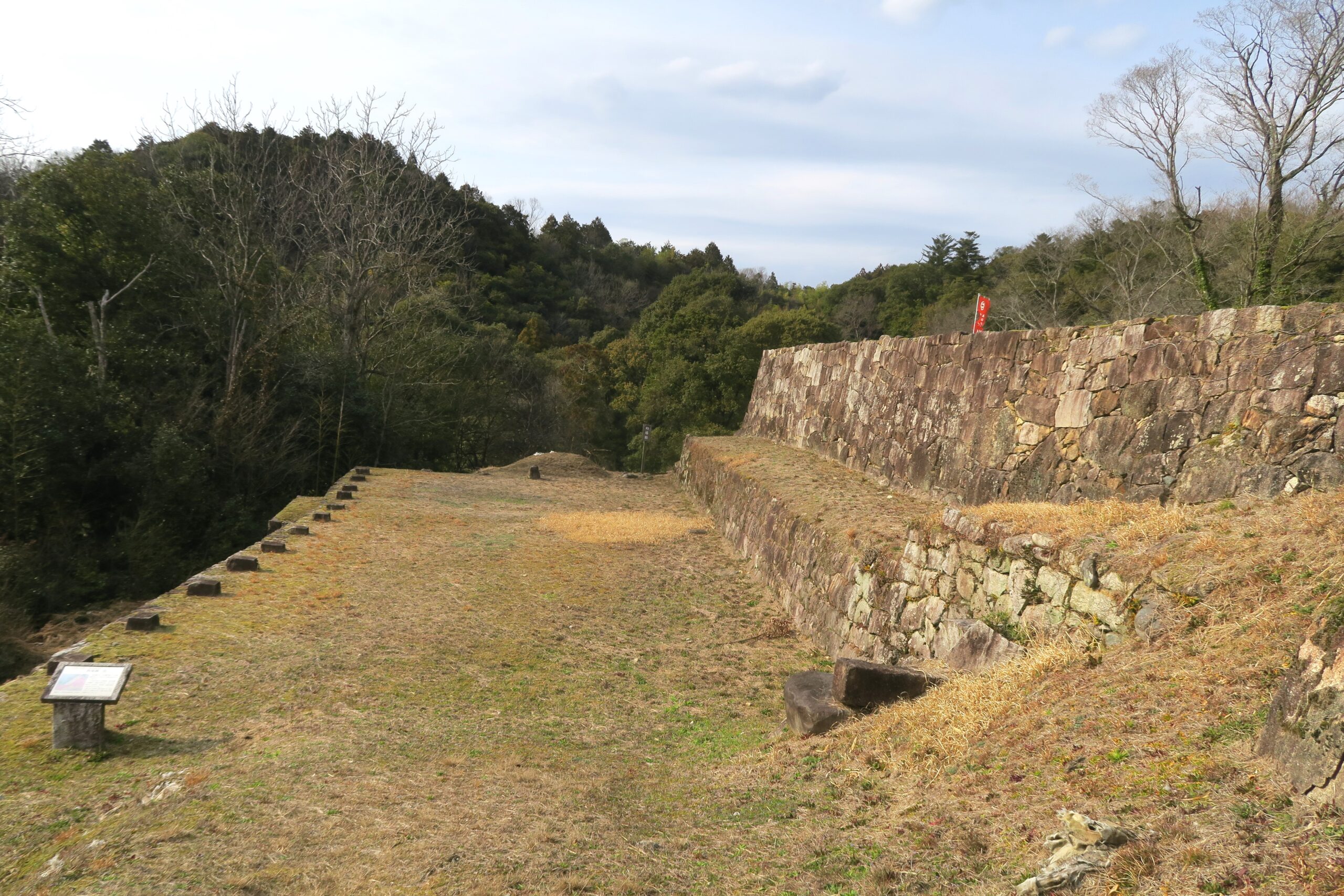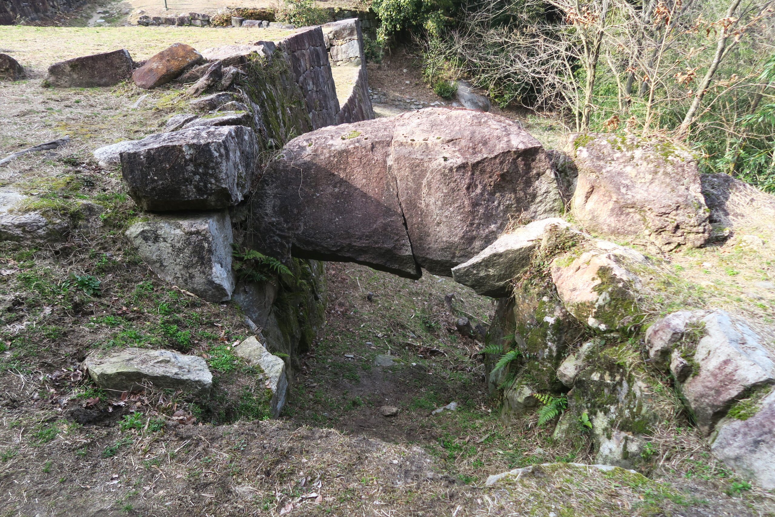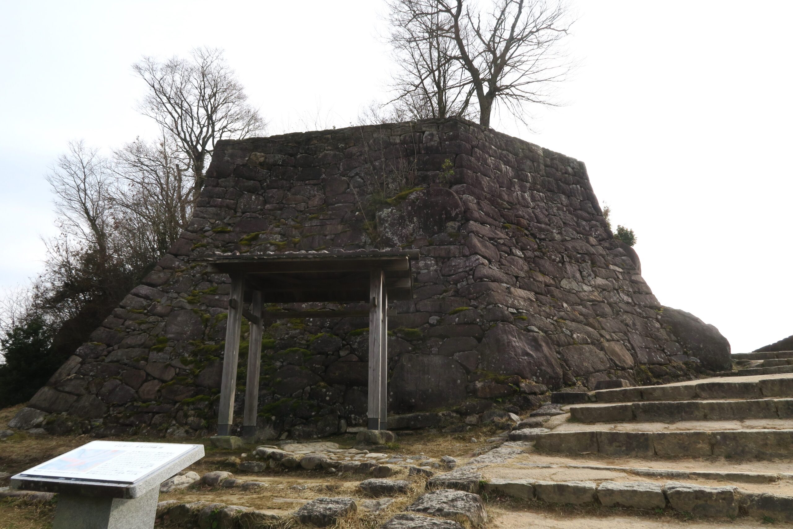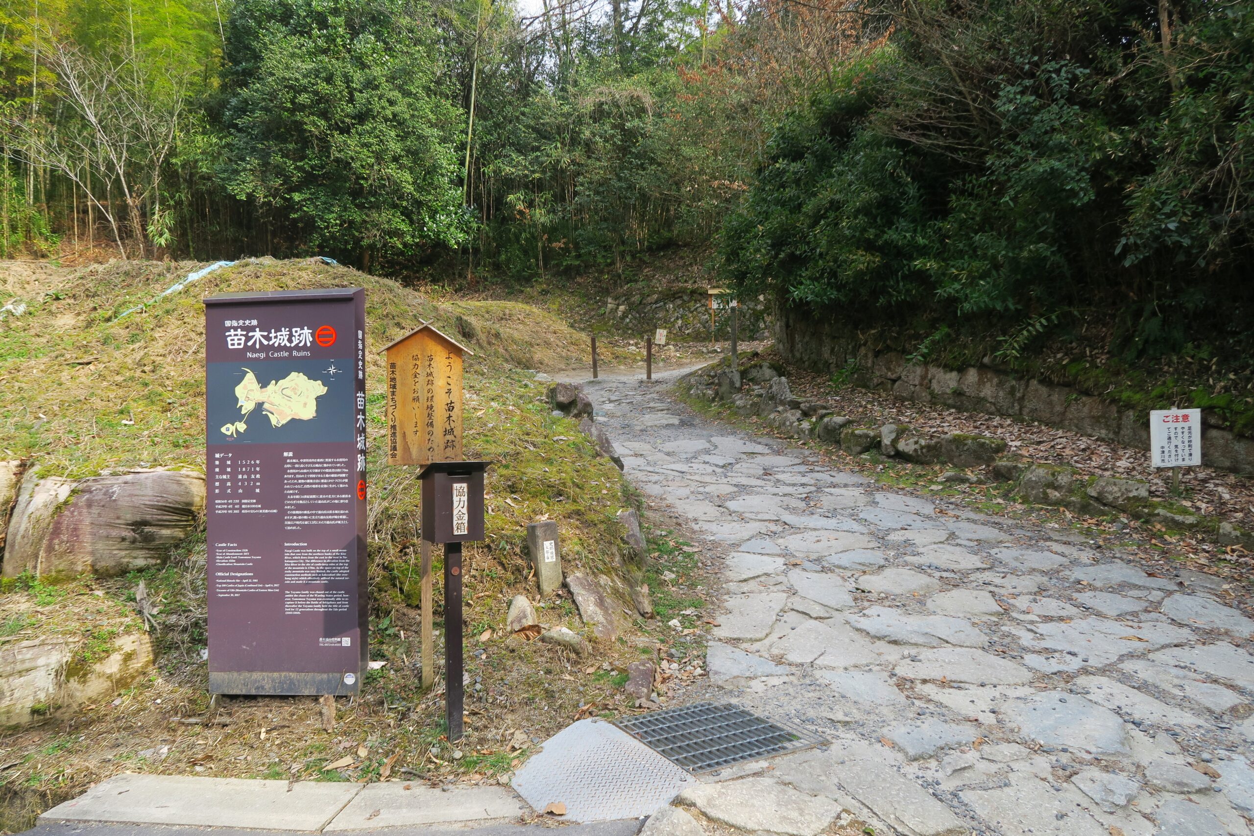 中津川駅までは約3.5km、徒歩約1時間の距離です。大矢倉を囲んで北門からと駆門からの合流地点にあるのが竹門跡。苗木城には竹門という名の門が2カ所あり、いずれも外郭にある二脚門でした。往時は竹で戸を据え付けてあり、門番はおらず開けっぱなだったといいます。領主は竹門から藩士は北門から城にに入ったとのこと。