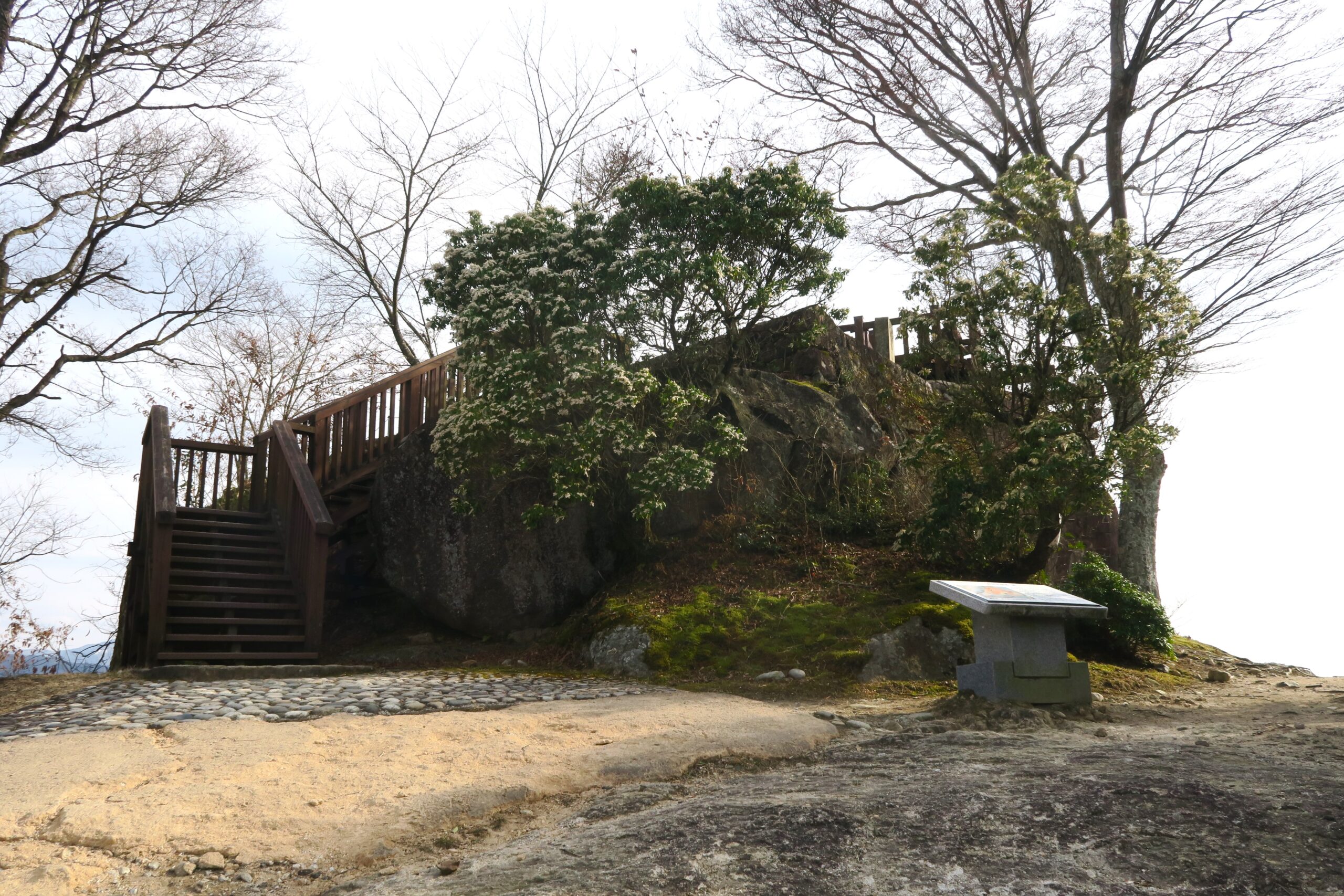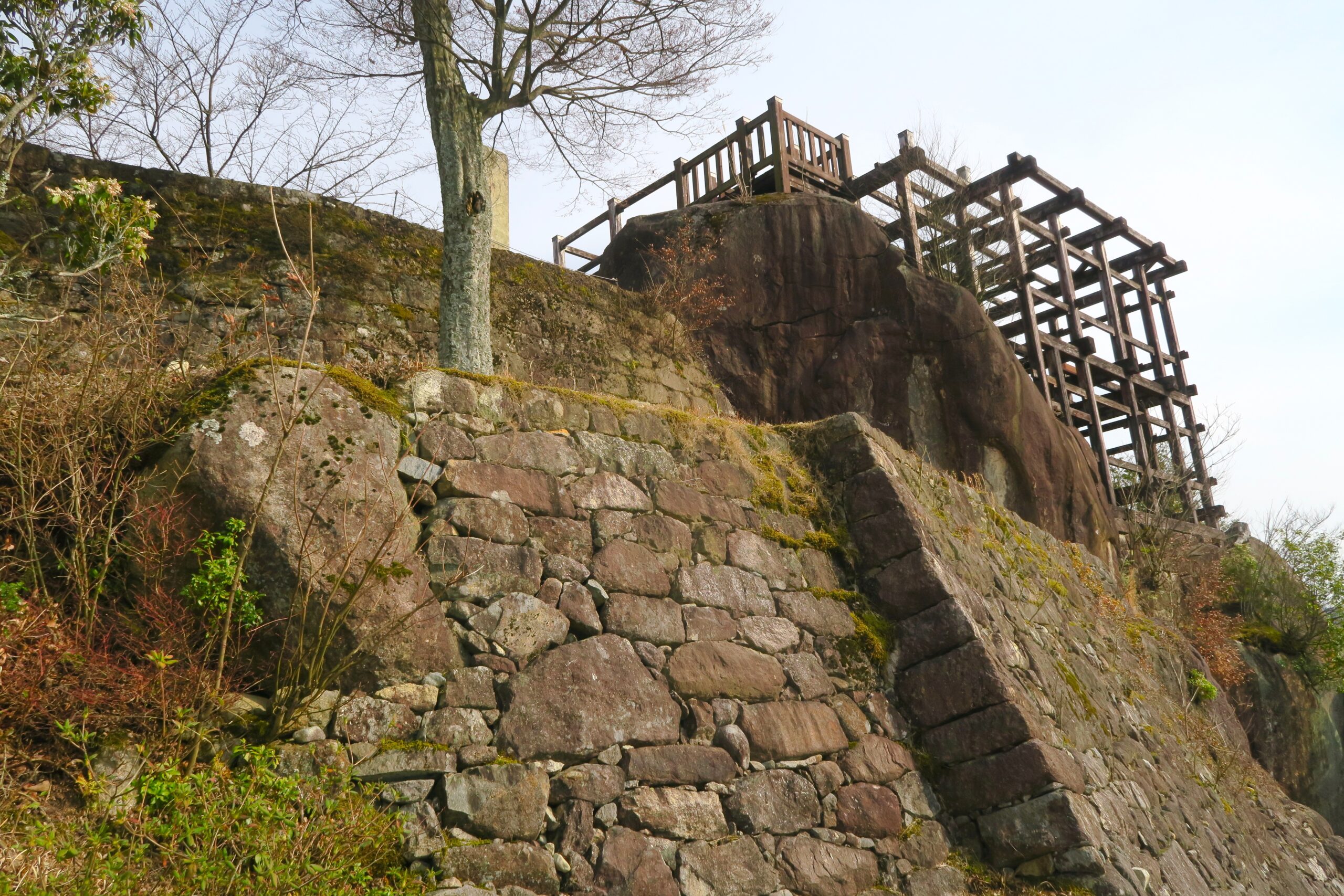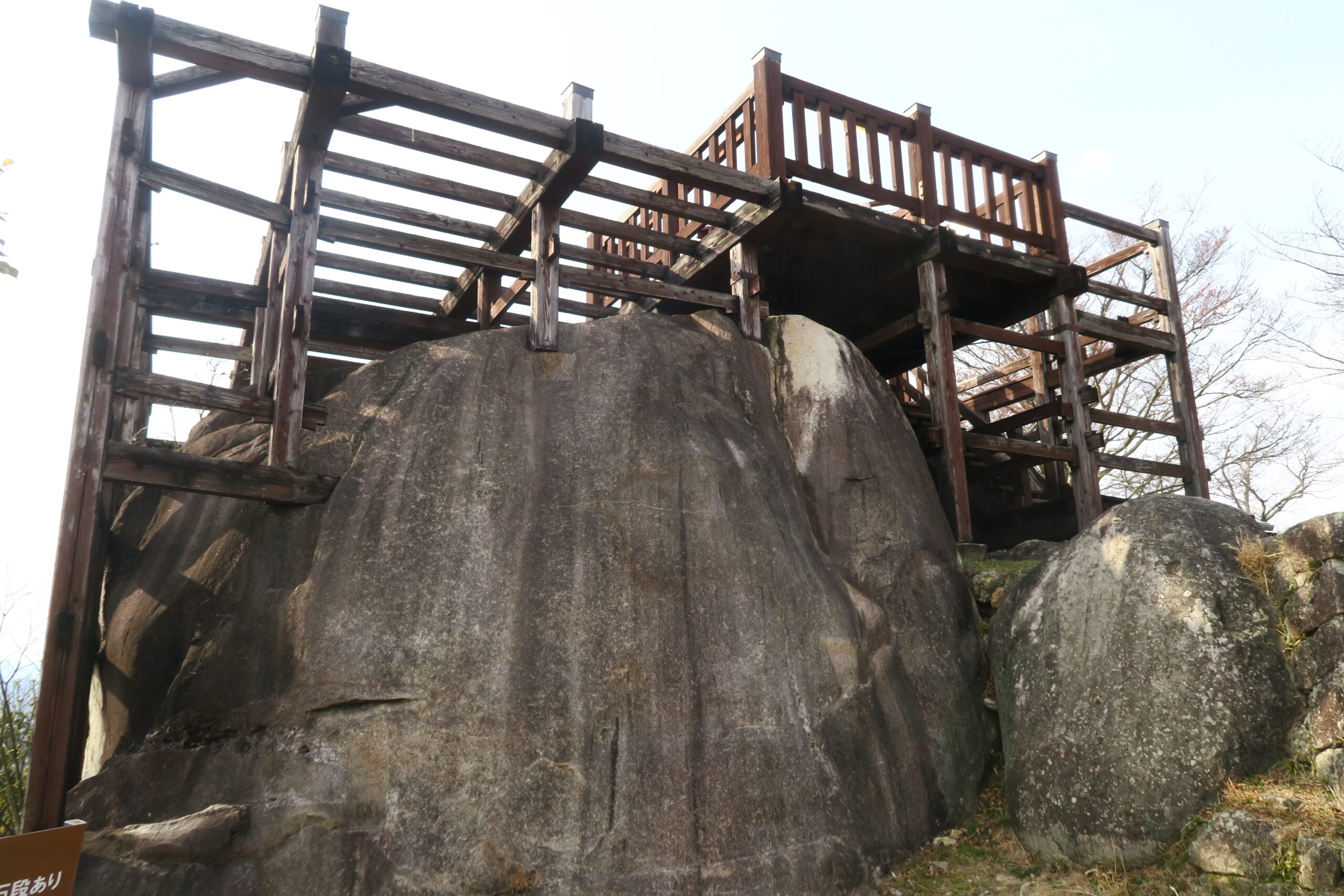 さらに本丸からみて西側に、巨岩の上に三層の懸造りの矢倉が建てられていました。笠置山に向かって設置された物見矢倉・笠置矢倉で城山大橋、笠置山の絶景を望みます。