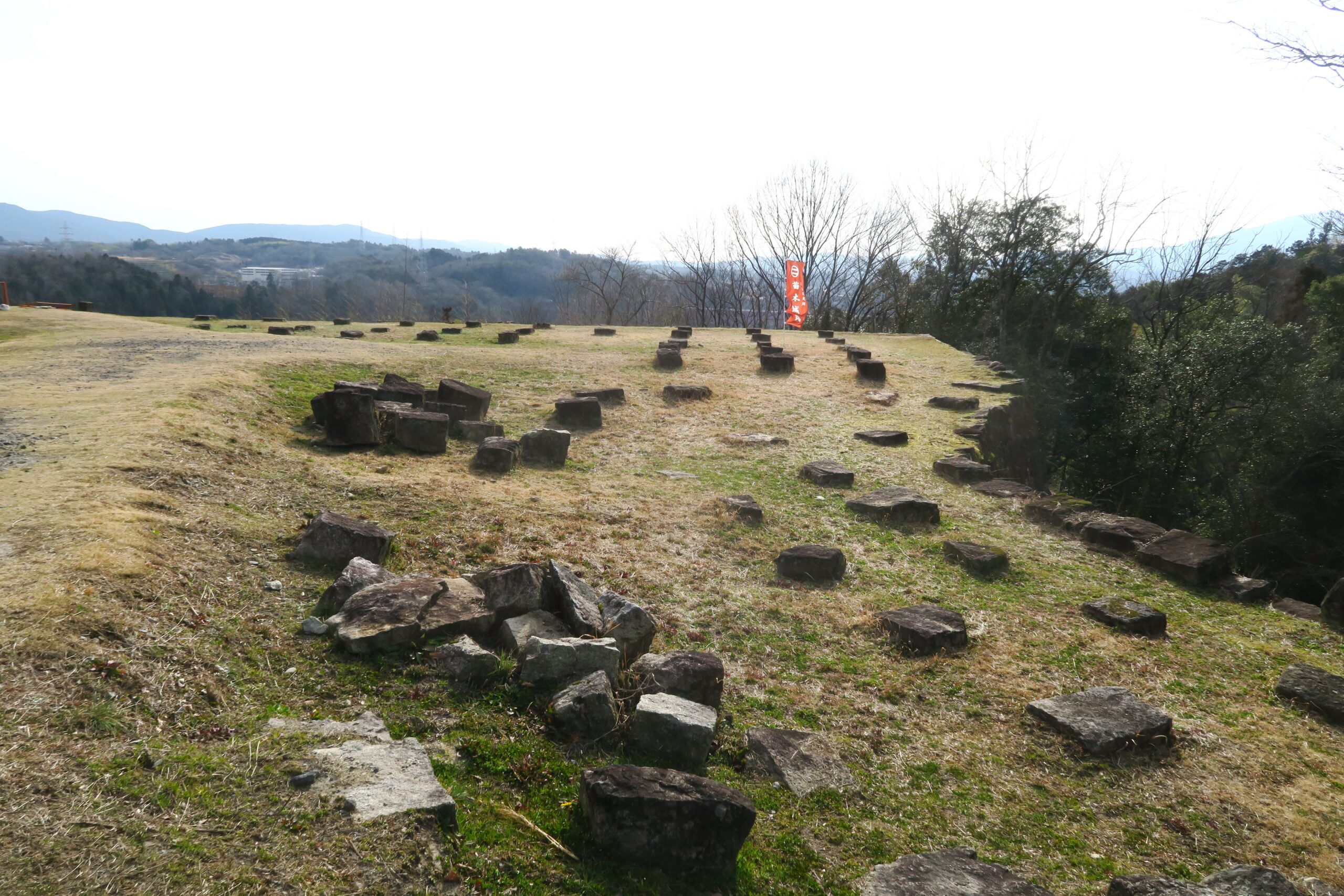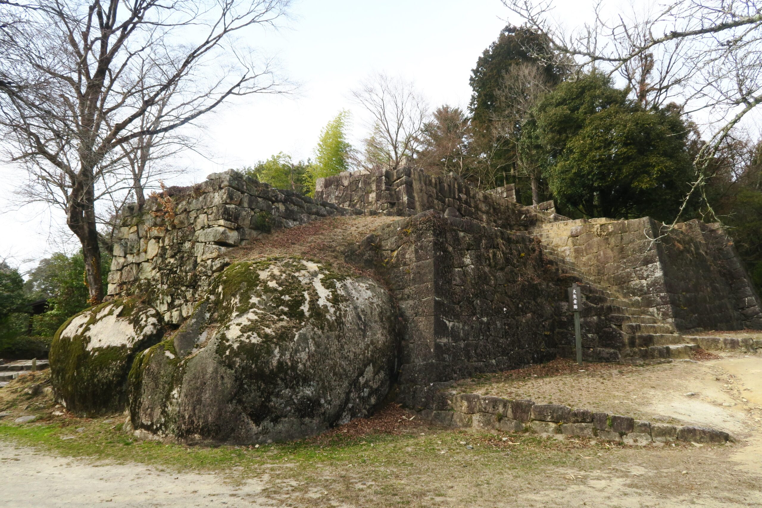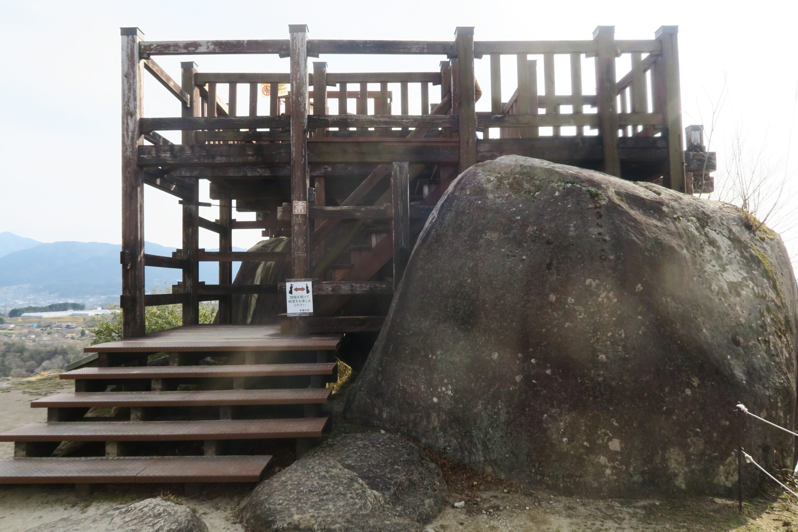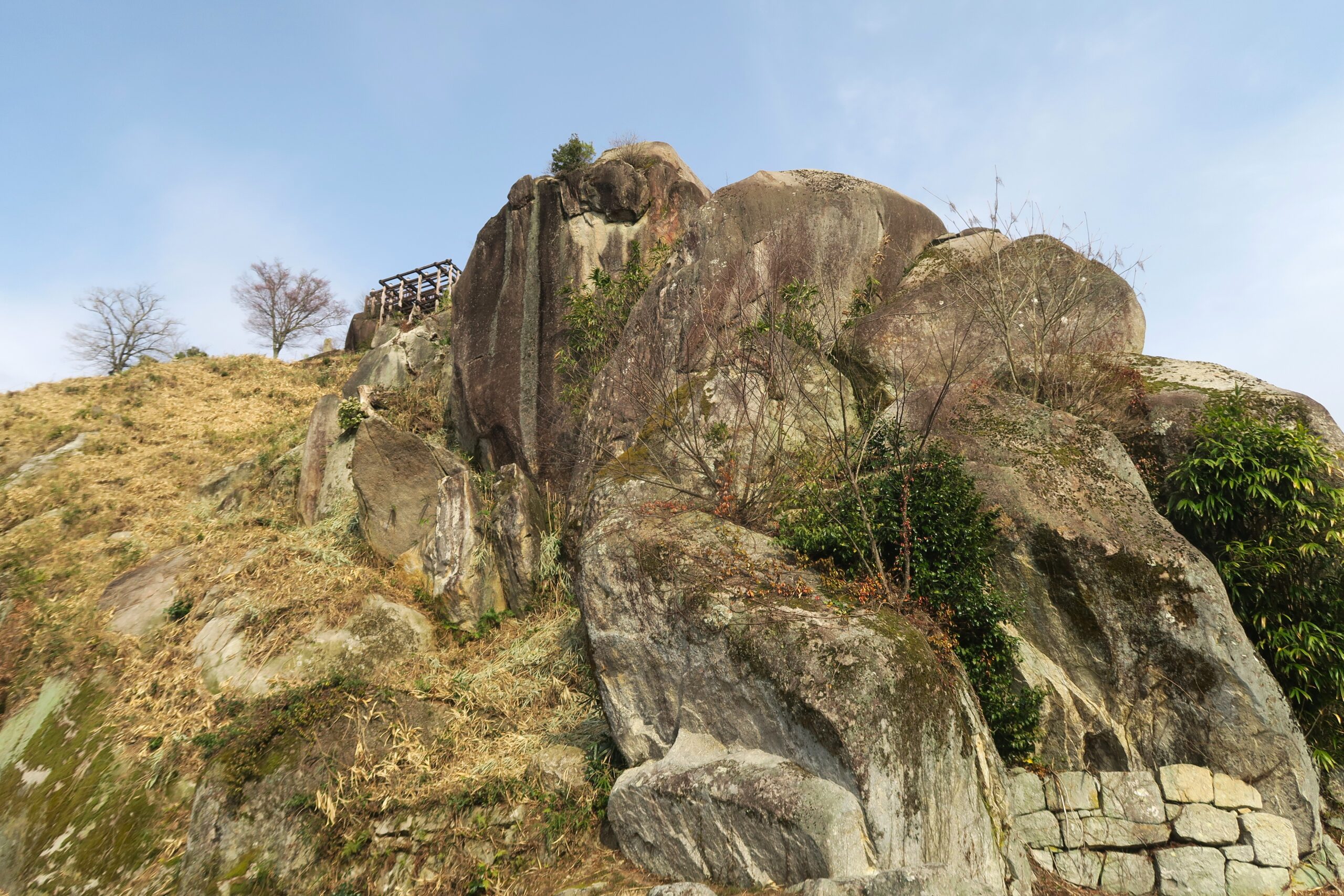 さらに本丸からみて西側に、巨岩の上に三層の懸造りの矢倉が建てられていました。笠置山に向かって設置された物見矢倉・笠置矢倉で城山大橋、笠置山の絶景を望みます。