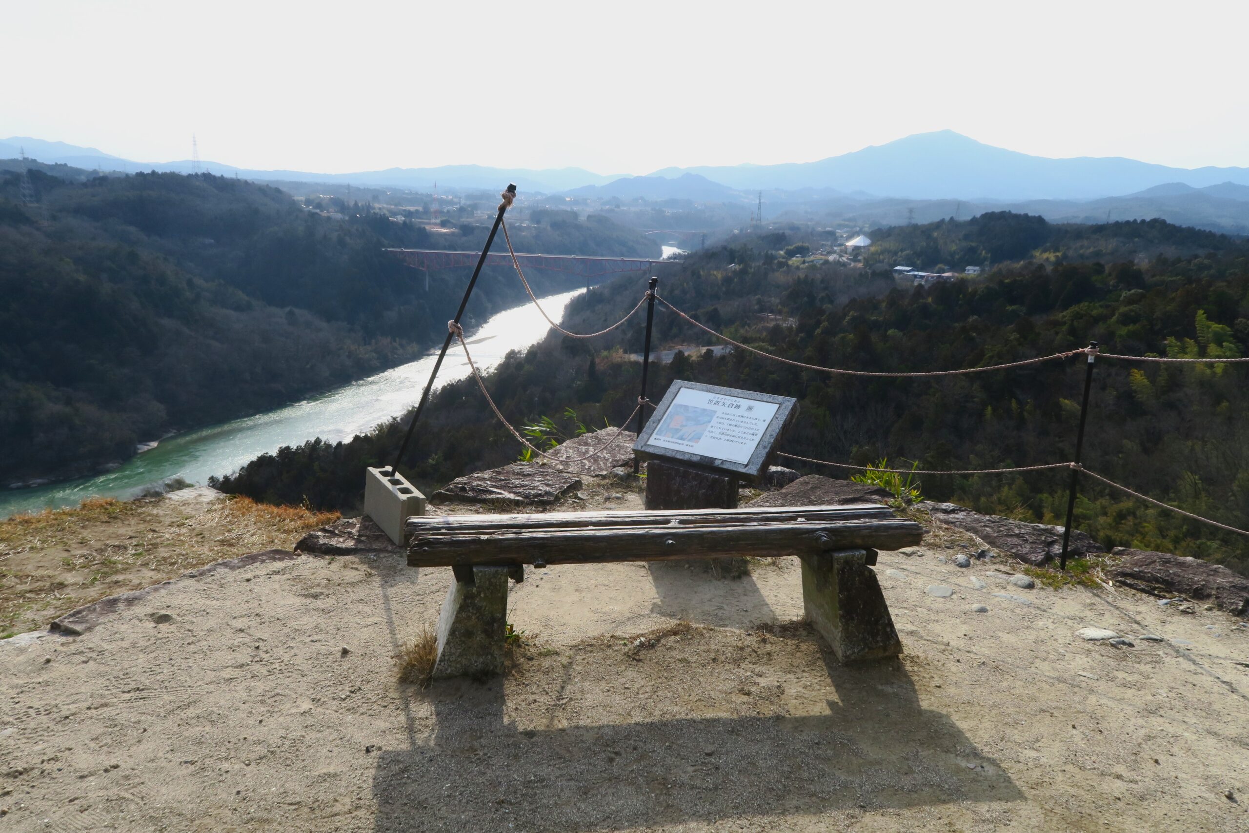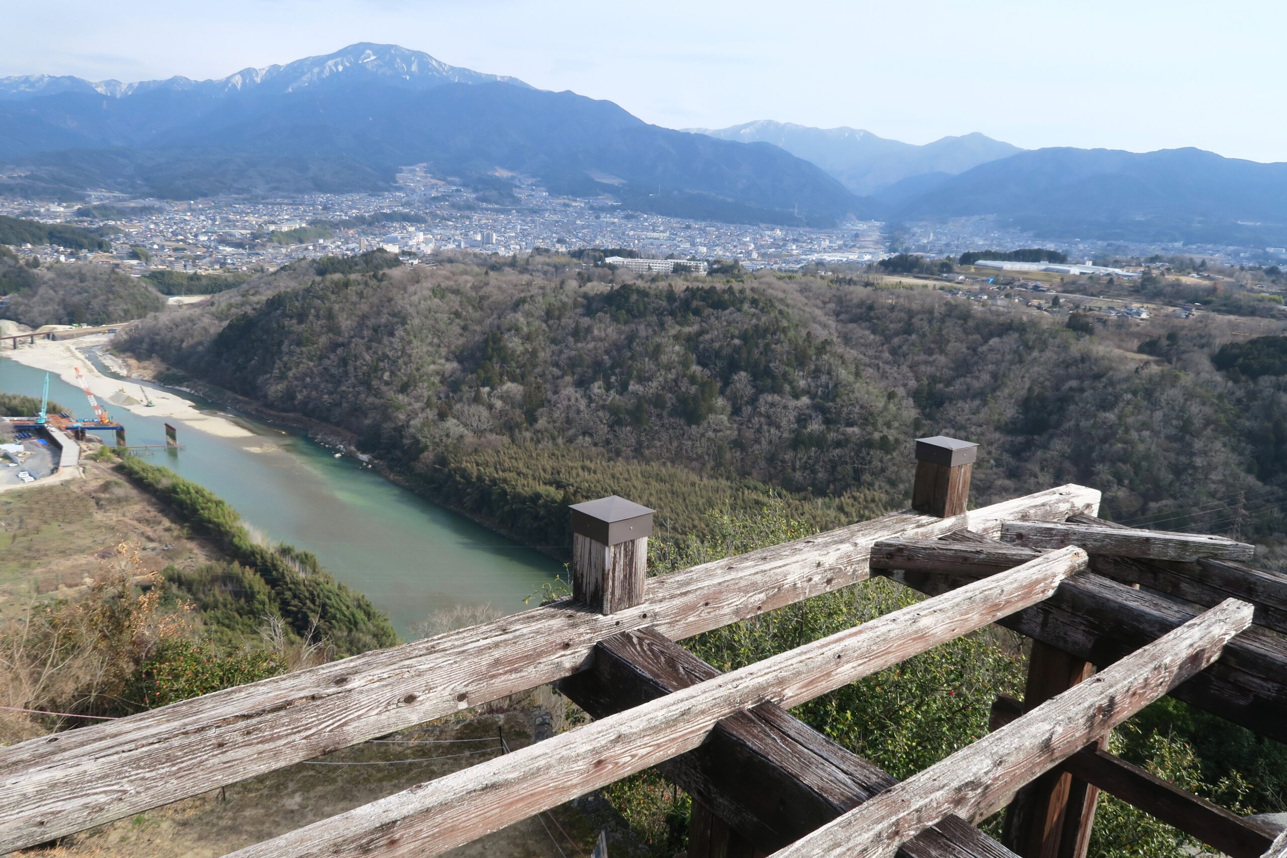 とにかくすばらしいのが360度の視界が一望できる絶景の眺めです。麓から見る城山は一見すると険しさを感じないのどかさですが、城跡に辿り着きひときわ高く築かれた天守台に登ると、はるか下にエメラルドグリーンに輝く木曽川が悠々と流れて深い谷を造り、周囲から隔絶していることがわかります。借景となるのは名峰・恵那山で眺めているだけで心が洗われます。