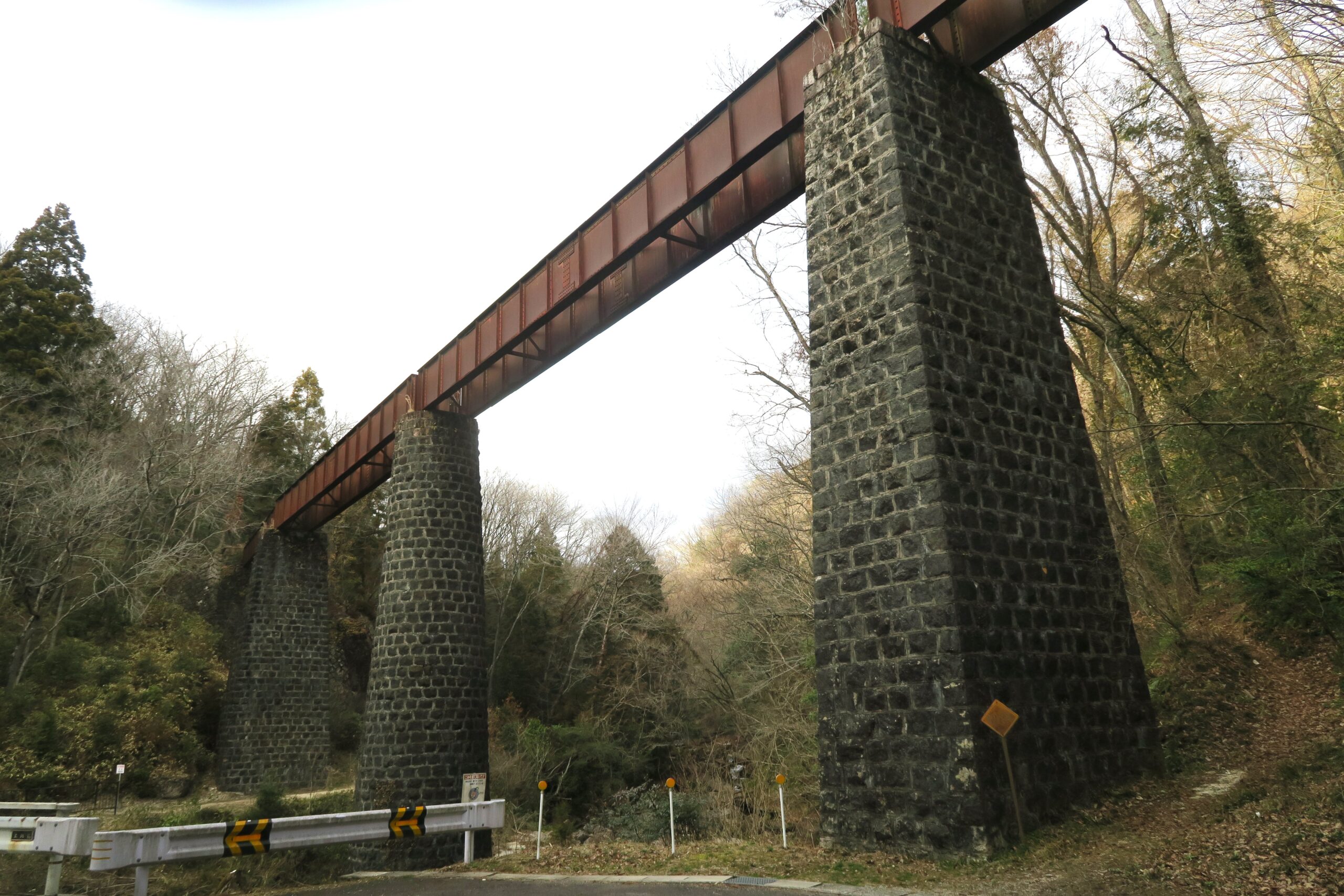木曽川の支流にかかるのが旧北恵那鉄道 上地橋梁跡です。昭和53年(1978)に廃線になった北恵那鉄道線の廃線跡で美しい石積みの橋脚と鉄橋が目の前に現れ、今なお力強い佇まいです。