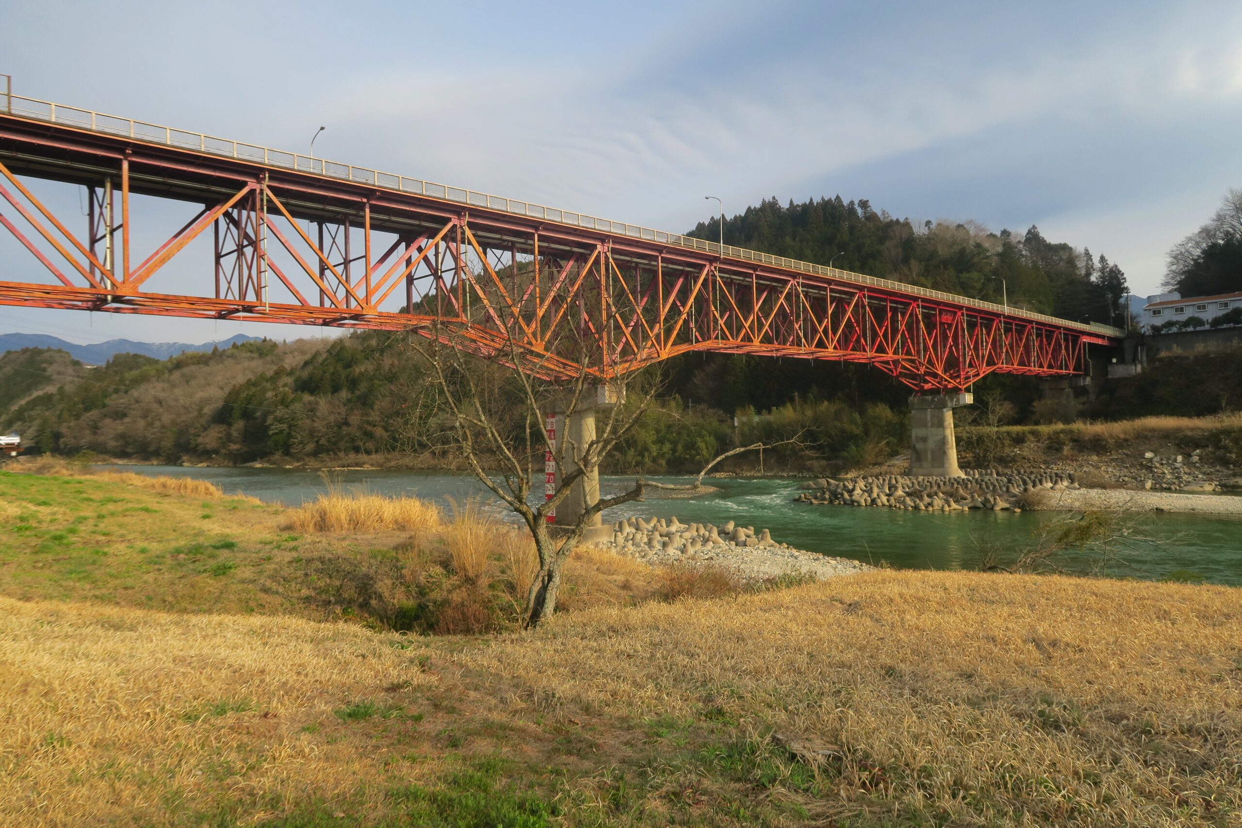 木曽川に沿って進み、中間地点で木曽川に架かる玉蔵橋が見えてきます。時間が合えば玉蔵橋バス停から中津川駅に戻ることもできます。全行程3時間ほどで午前中に苗木城を見学すれば午後は岩村城にバトンタッチです。
