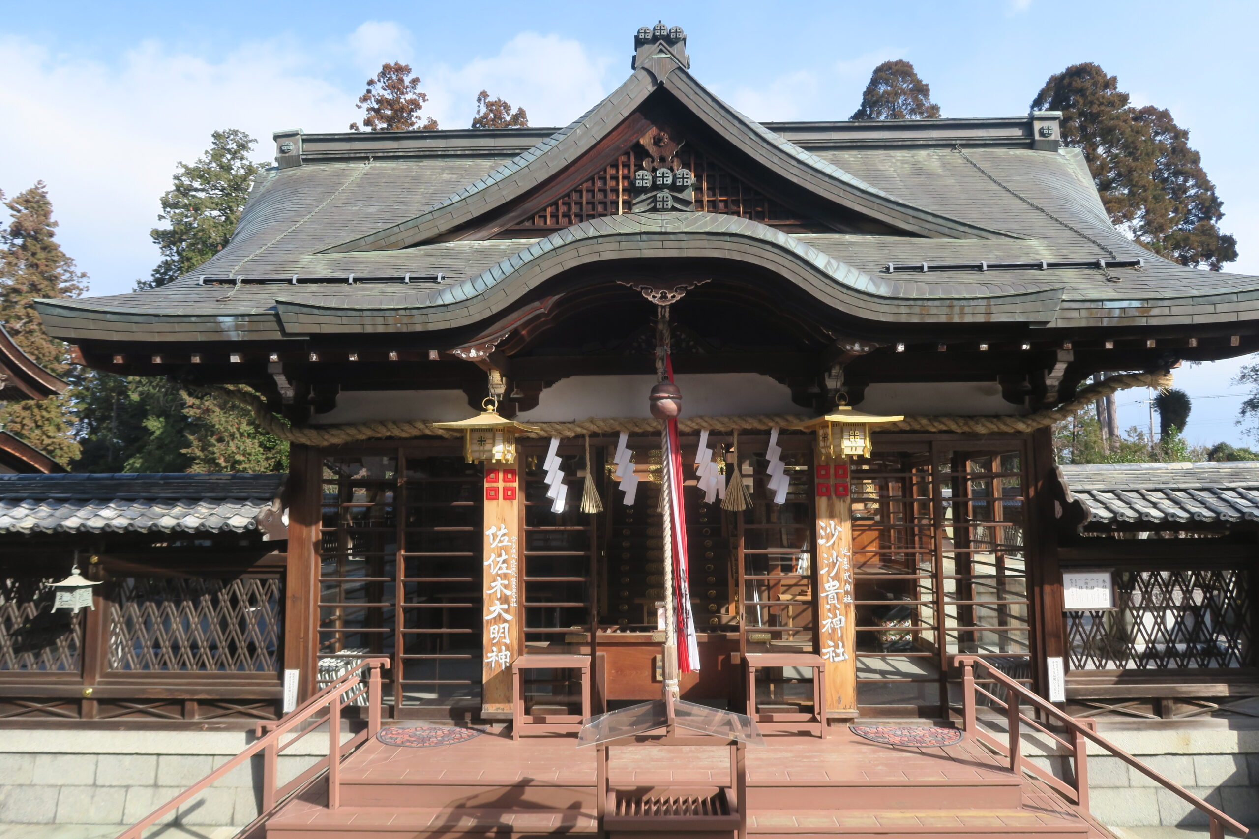 沙沙貴神社は少彦名神、大毘古神(古代四道将軍の一人で沙沙貴君の祖神)、仁徳天皇、宇多源氏、佐々木源氏、近江源氏のご先祖である宇多天皇/敦實親王の四座五柱を祭神として祀り、これらを総称して佐々木大明神という。佐々木氏は宇多天皇の皇子敦實親王の玄孫である源成頼が近江国佐々木庄に下り、成頼の孫経方が佐々木姓を名乗ったことに始まります。源平合戦で戦功をあげた定綱の跡を継いだ信綱の息子の代に4家に分かれ、長男重綱-大原氏、次男高信-高嶋氏、四男氏信-京極氏、そして三男泰綱に始まる六角氏が総領本家として近江守護職を継承しています。