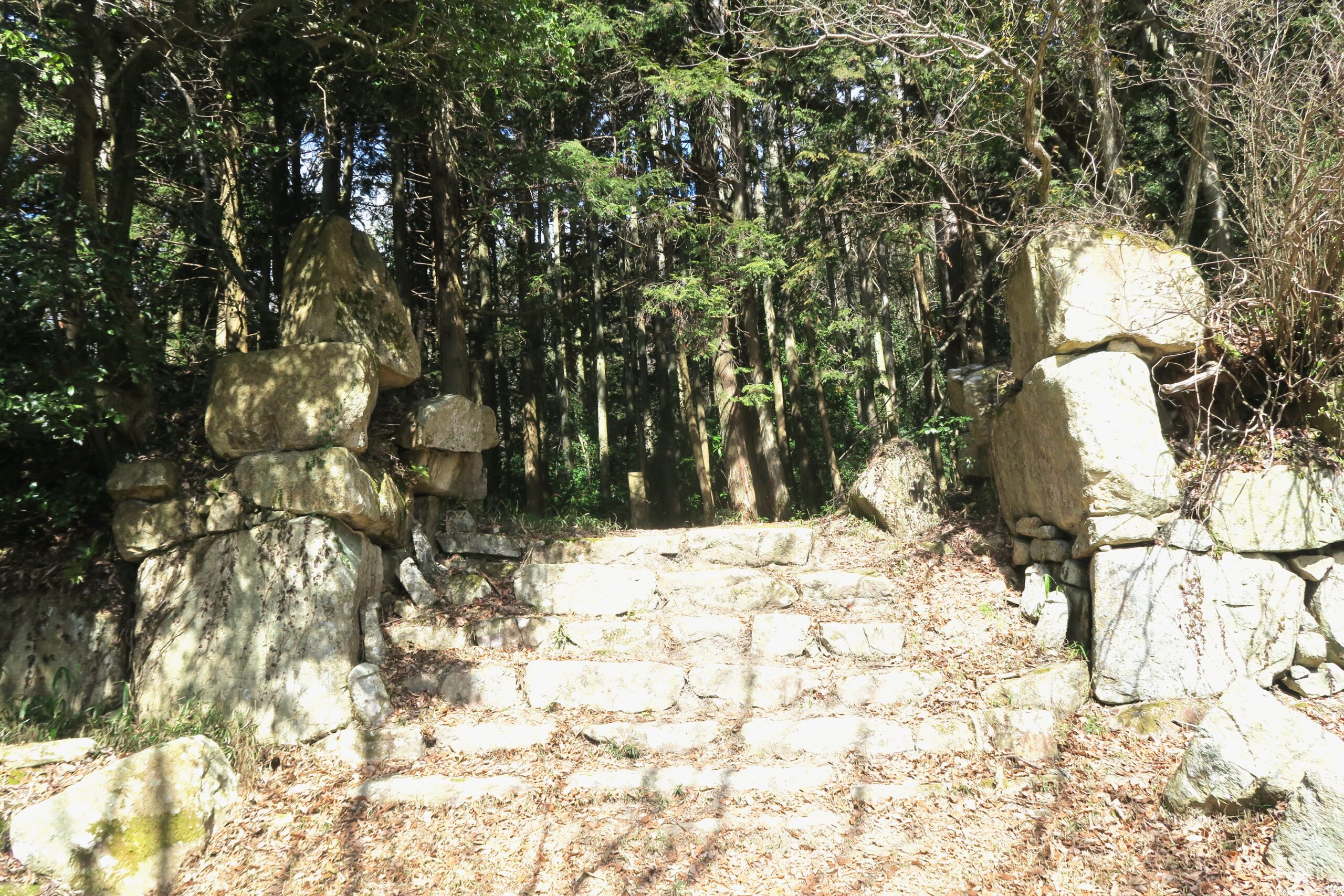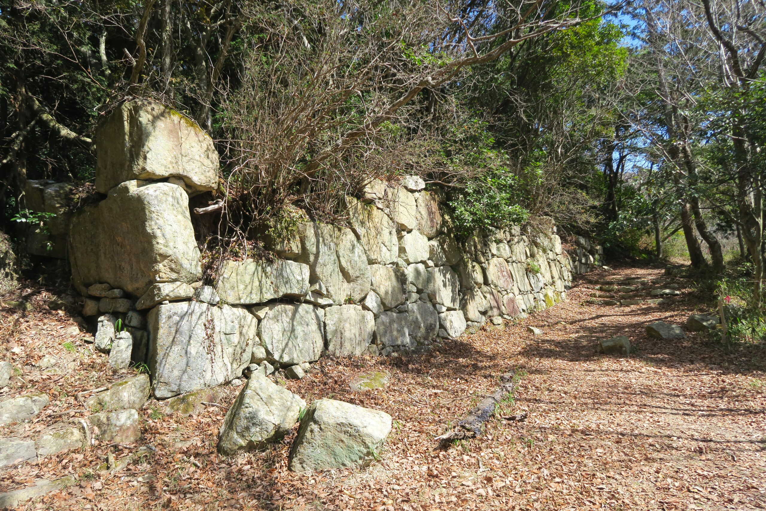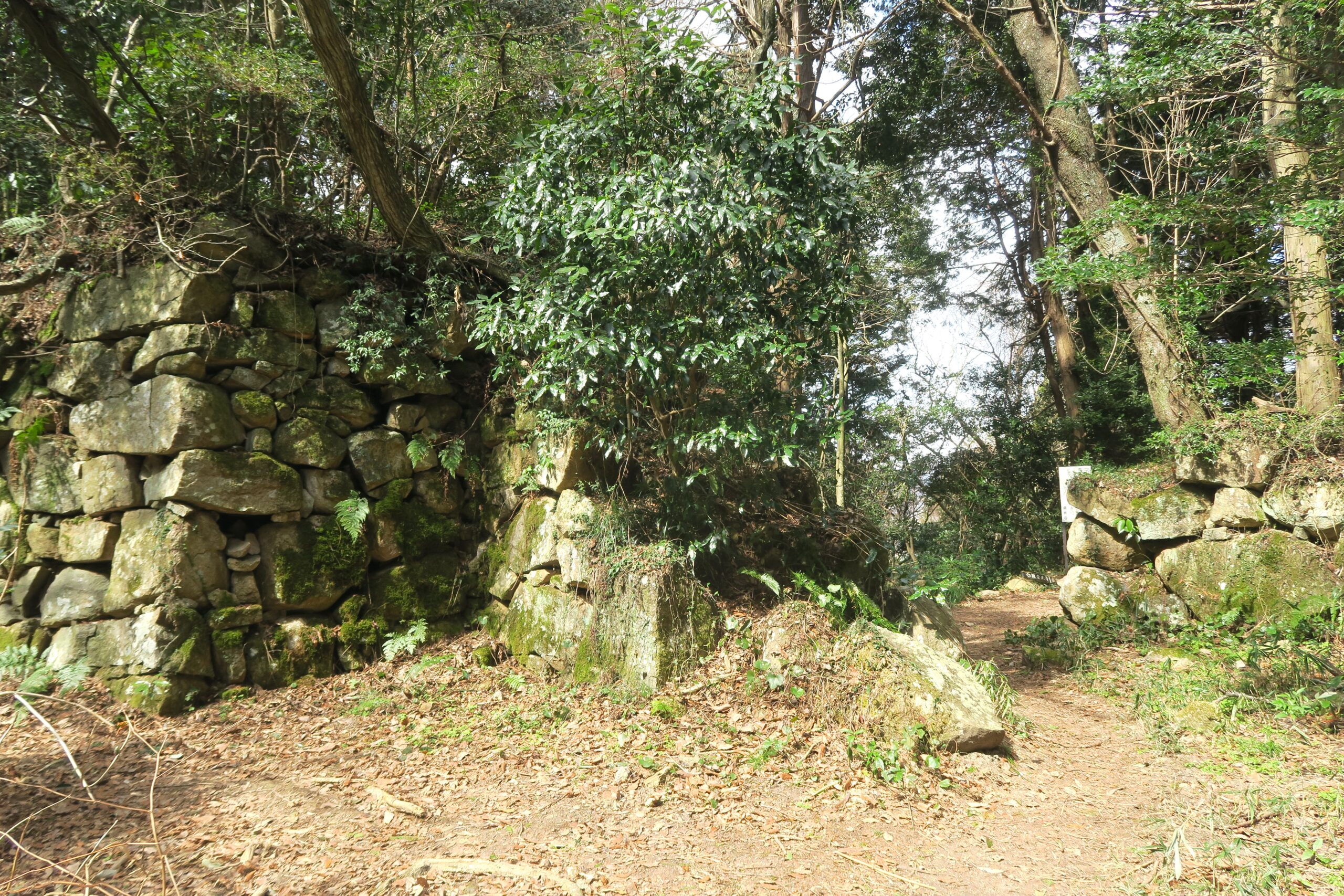 途中三叉路になり左が大石垣方面、右手が帰路の桑実寺へ、直進が本丸ということでまずは本丸跡に向かいます。本丸の大手口には石段が築かれています。石段の横の壁面にも石が積まれて、石積みと石段の間には排水路のような溝も造られています。