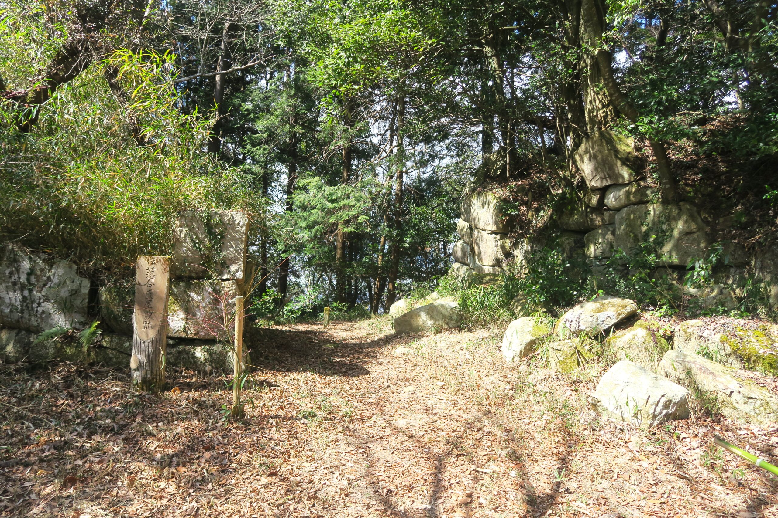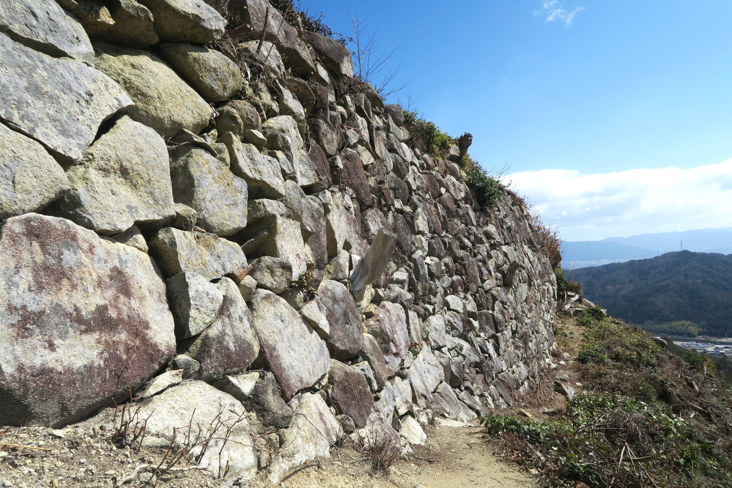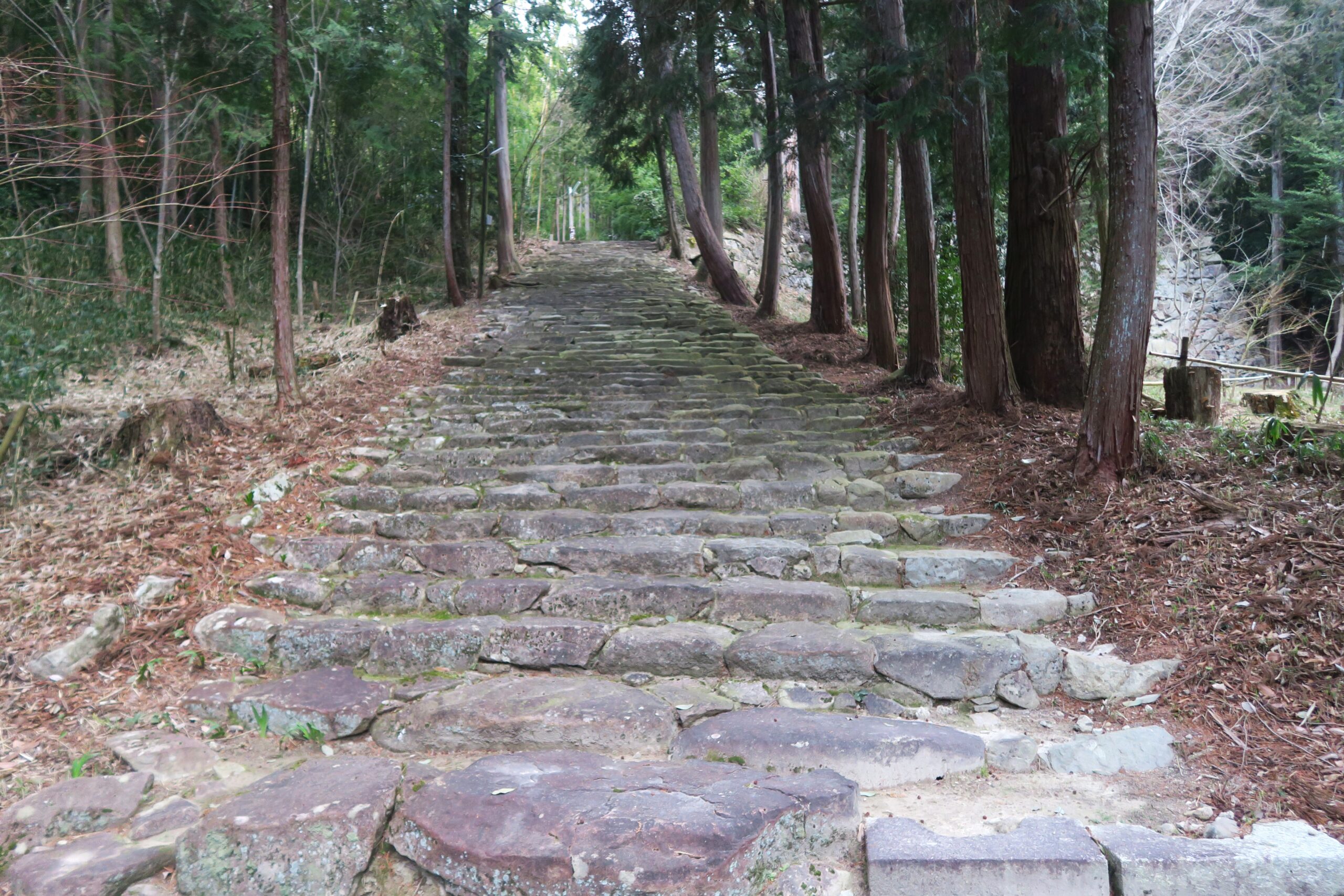 途中三叉路になり左が大石垣方面、右手が帰路の桑実寺へ、直進が本丸ということでまずは本丸跡に向かいます。本丸の大手口には石段が築かれています。石段の横の壁面にも石が積まれて、石積みと石段の間には排水路のような溝も造られています。