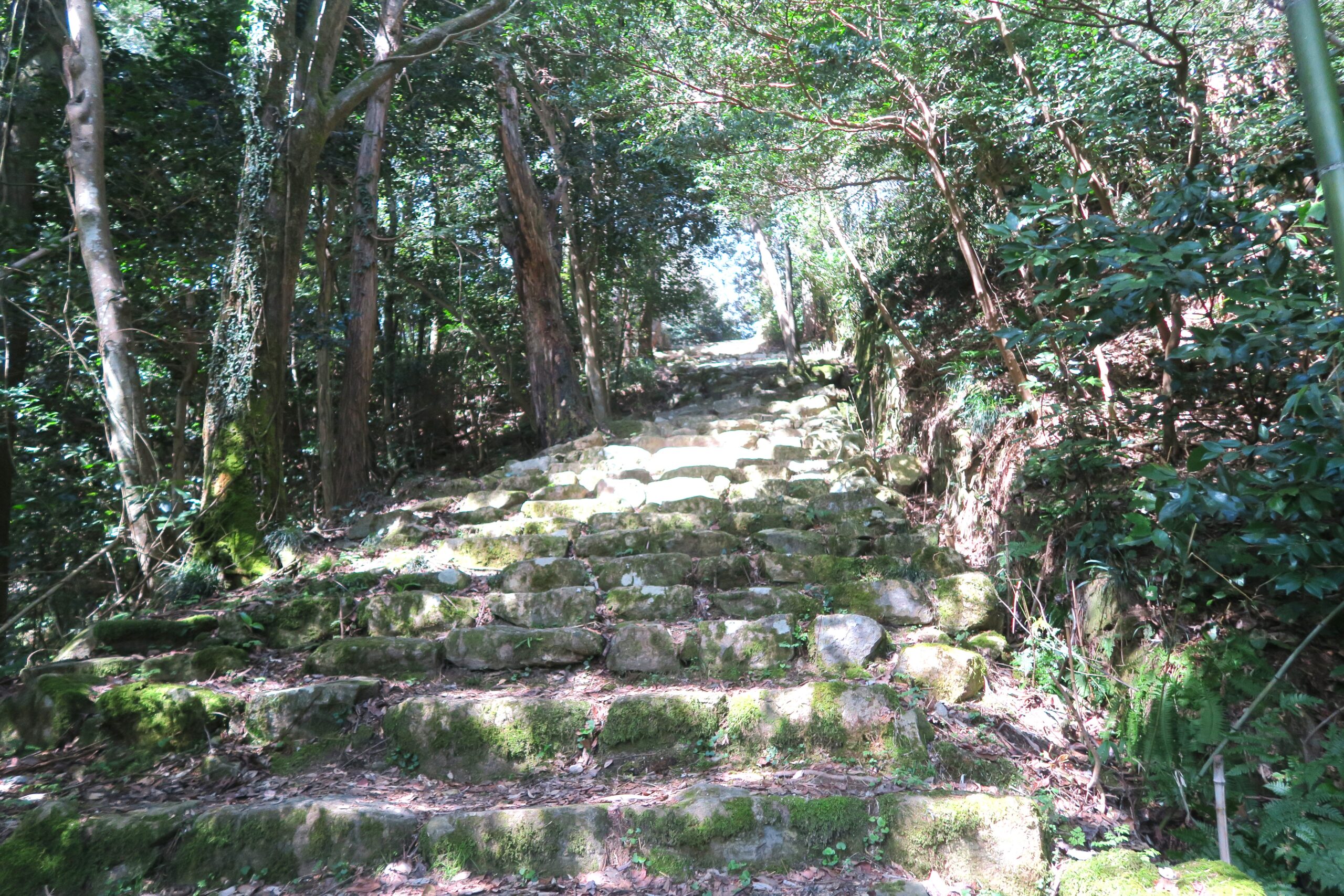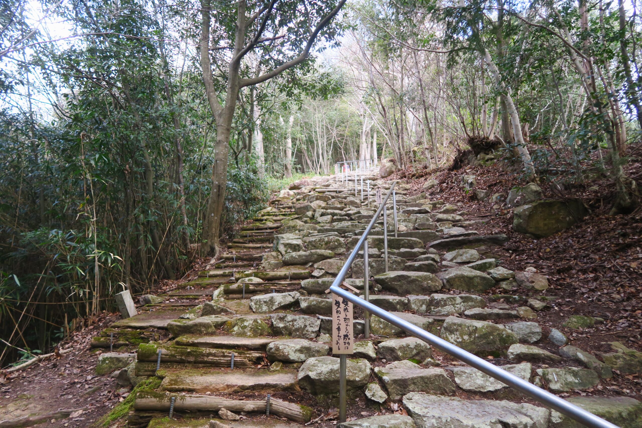 追手道には行かず参道を上がると、日吉神社の先からは1200段(駐車場からは440段)あるという石段の道になります。麓の日吉神社のあたりはそれほどでもないが、次第に急な坂道になって来る。それも普通の石段ではなく、大きな自然石を並べただけのもので、一段上るたびにかなりの労力がいる。石段は馬の歩幅に合わせて積まれているようで、人の歩幅には少し広すぎます。