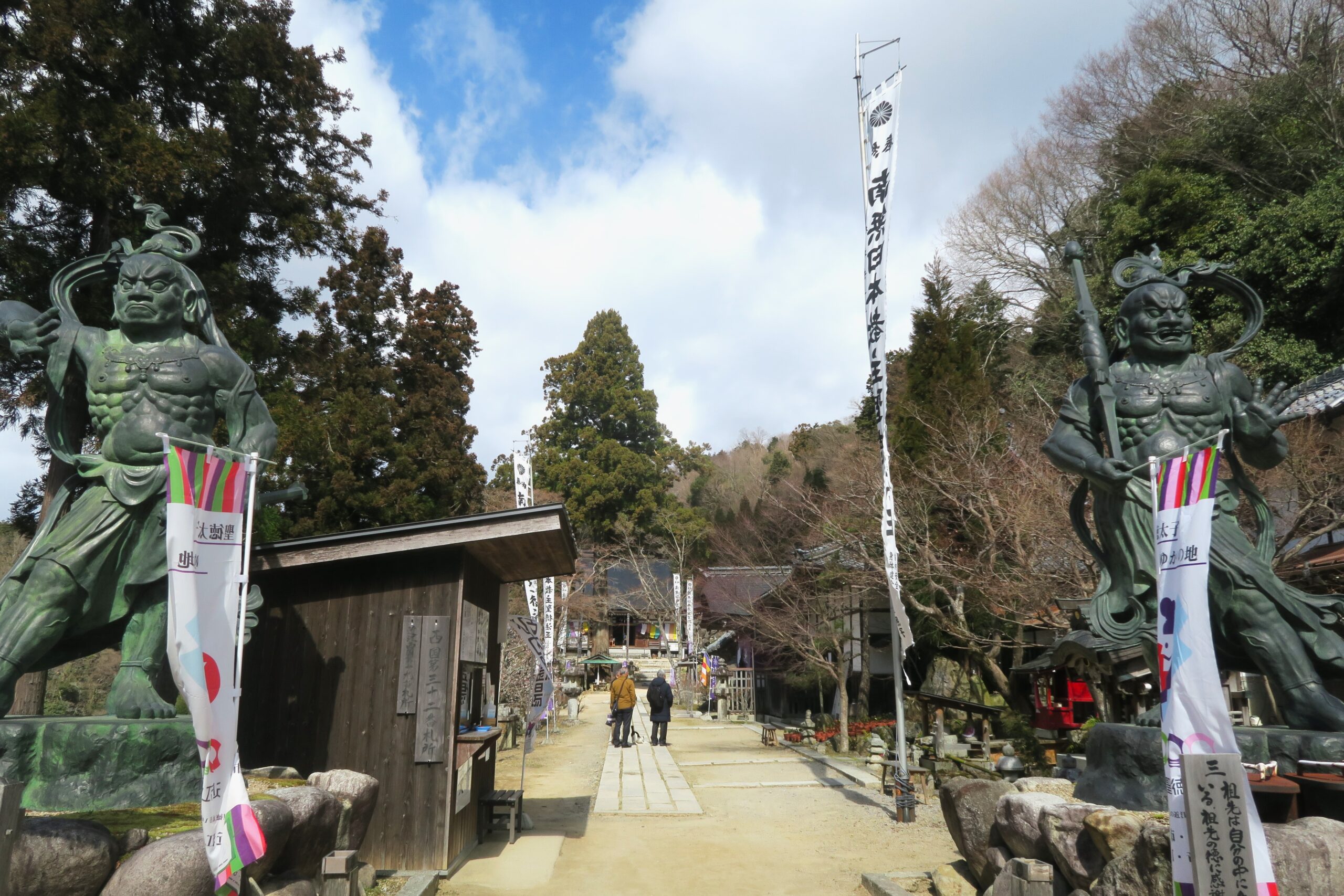 この山ははじめ佐々貴山といっていたのが巡礼が盛んになってから観音寺山と改めたとのこと。付近一帯には古墳が多く、ササキの名はミササギからでたらしい。土地の人は昔から衣笠を伏せたような形をしていることから繖山と呼んでいました。西国三十三観音霊場第32番札所でもある観音正寺には杖を持った巡礼者の姿も見えます。山門を持たない当寺の門固めの仁王像が雄々しくそびえ立ちます。