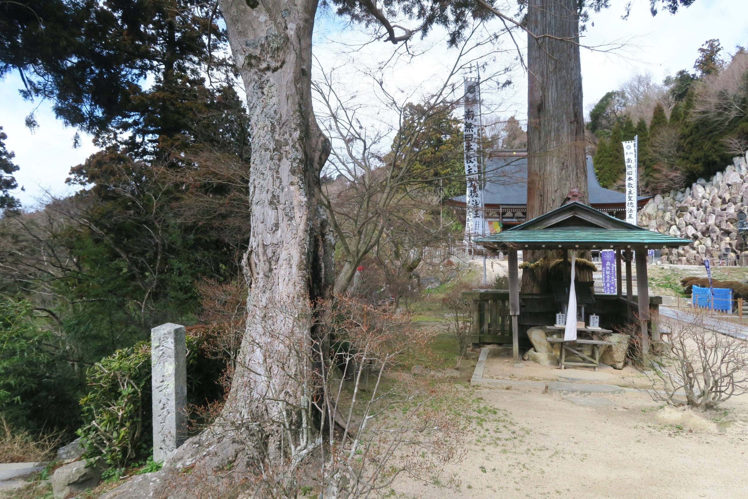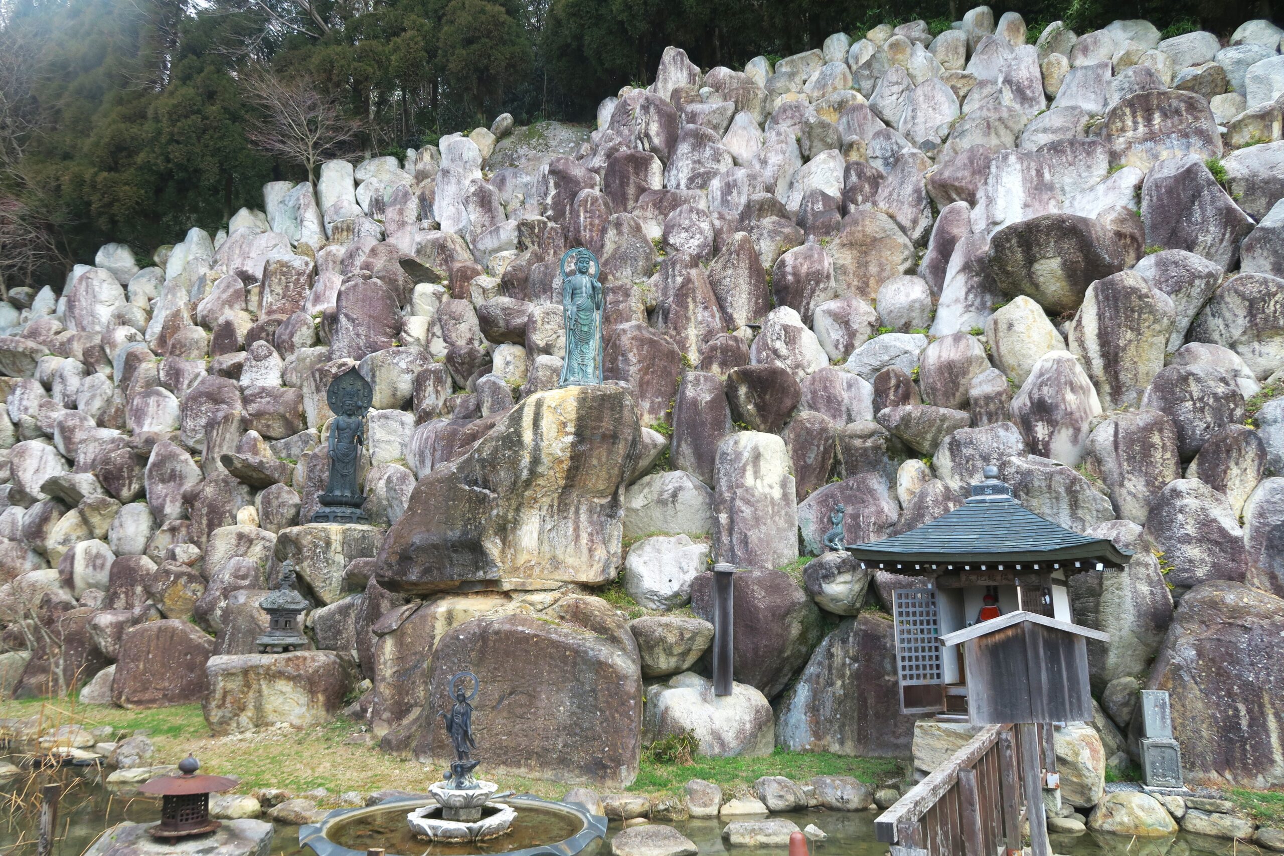 伝承によれば推古天皇13年(605)に近江国を遍歴していた聖徳太子が、釈迦如来と大日如来から啓示を受け自刻の千手観音を祀ったことに始まるとされます。本尊は高さ6.3mの白檀観音で、その縁起伝説は二通りあります。一つは前世が堅田の漁師であったという人魚に出会い、成仏させて欲しいとの人魚の願いを聞き入れ、約束を果たすために千手観音の像を刻み寺が建立されたという「人魚の伝説」ともうひとつは、繖山の巨岩の上で天女が舞っていたのを見て、その岩を『天楽石』と名付け、巨石が重なり合った岩室の内部に五仏を描き瞑想していますと天照大神・春日明神のお告げがあり、山上に湧く水で墨をすり千手観音をお告げとおりに描くと今度は、釈迦如来と大日如来が現れ、霊木で千手観音を作るようにとの啓示を受けます。千手観音像を彫り上げ、天楽石を奥之院として建立したという「天楽岩の伝説」です。写真は山の斜面に沿ってたくさんの石が積み上げられた庭園。