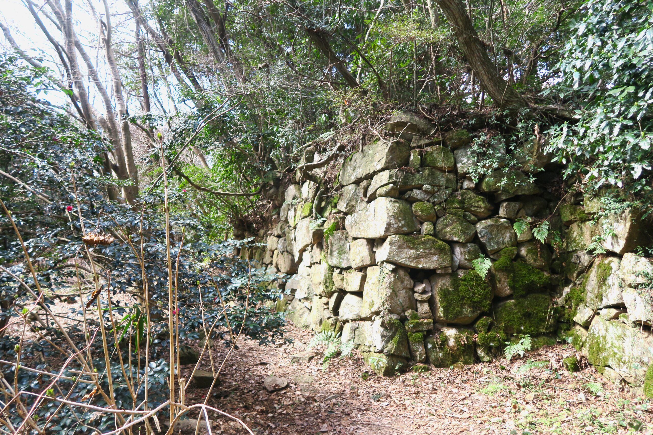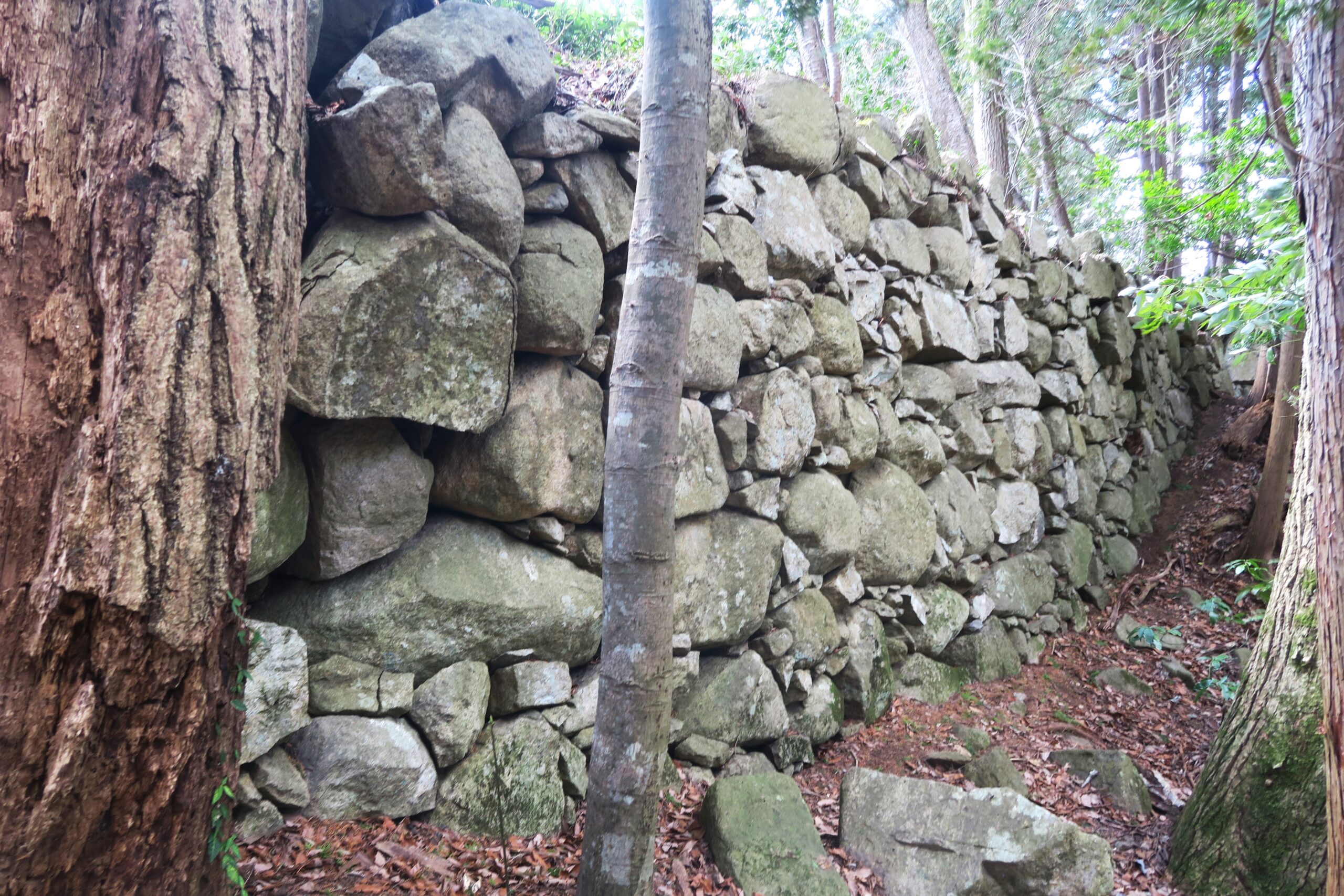本丸の裏(北側)から桑実寺へ向かう場所に石塁をずらした構造の食い違い虎口があります。石垣で虎口を折り曲げることにより敵が直進できないように工夫されていて、両側の石垣が迫力あります。