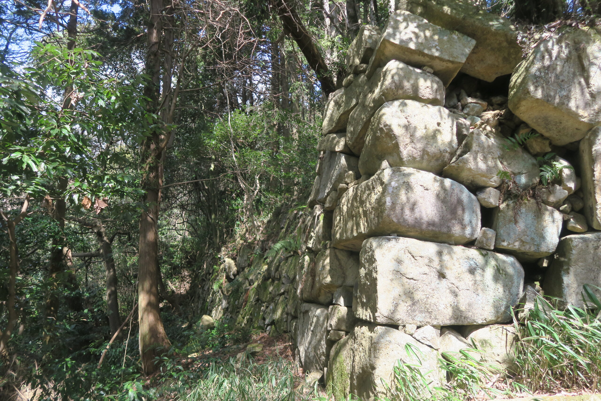 伝池田丸からさらに南へ尾根筋を下ると大石垣。高さが4~5程あり、乱積みの技法で積まれています。眼下には城下町の石寺や東山道が見えます。観音寺城は本格的な石垣の城で城内では552ヶ所で石垣が確認され、桑實寺などを含めると倍近くの石垣が存在します。