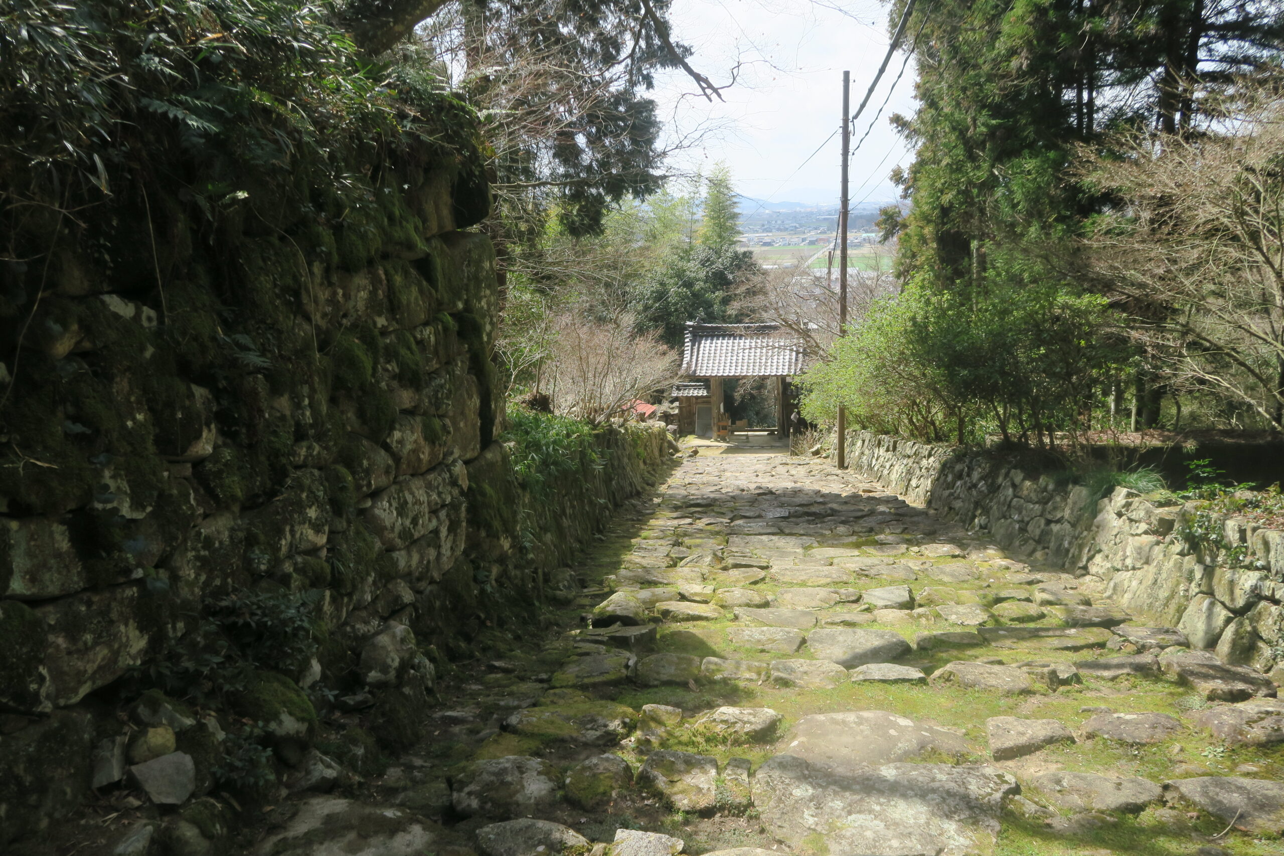桑實寺の山門から集落まで両側に坊跡の残る石段を約670段程、距離にして約500m下ります。2院16坊あったという往時の姿を偲ばせています。この道は西国古道の一部です。