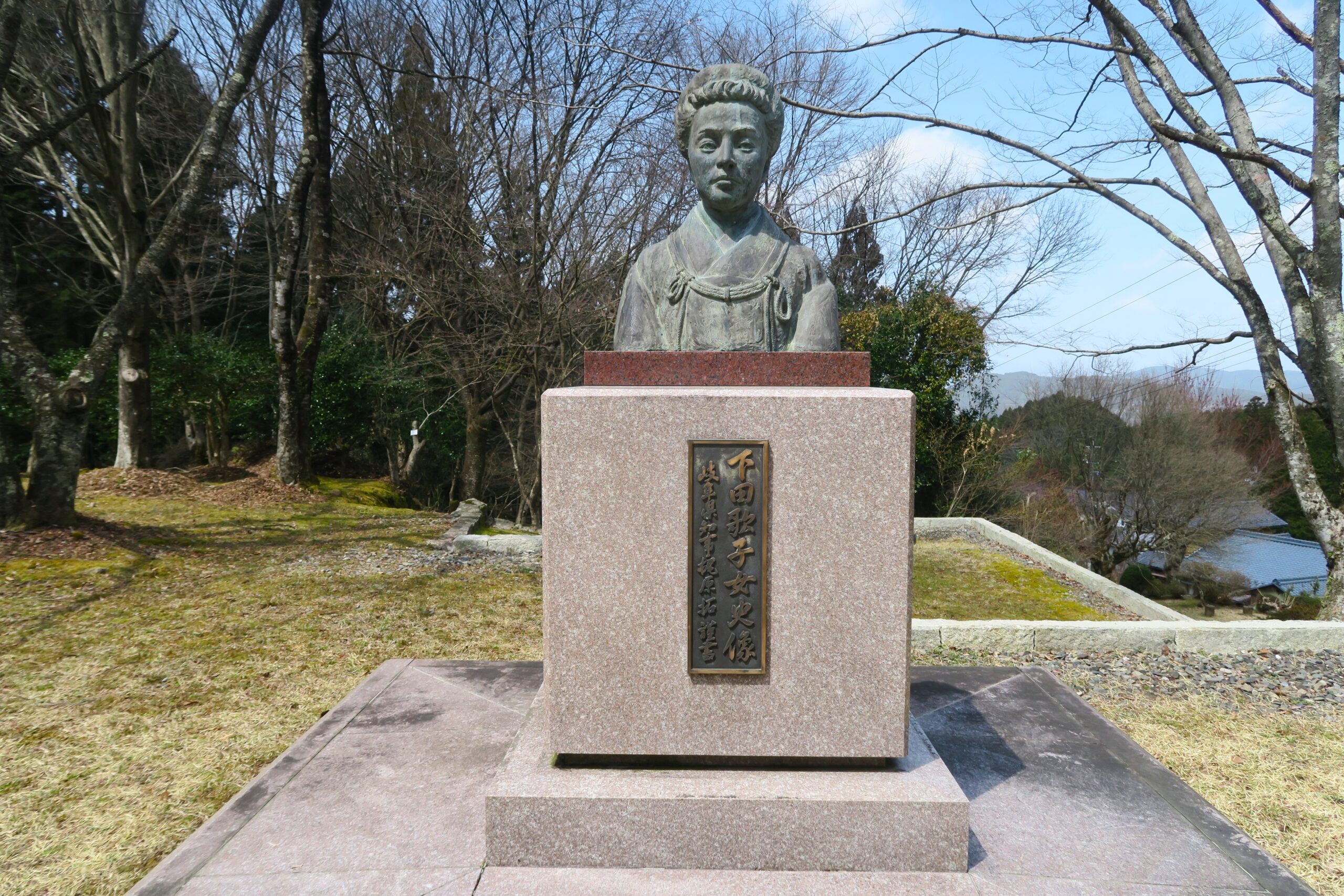 岩村城登城道の途中には明治から昭和に活躍した日本の女子教育の先駆者であり、実践女子大学の創立者の歌人・下田歌子の銅像が立ちます。知新館の教授であった岩村藩士の長女で幼名は平尾鉐といい、5歳で俳句・漢詩を詠み、和歌を作る神童でした。19歳で宮中の女官に登用され、宮中での歌会にいつも優れた和歌を詠むことから昭憲皇太后より歌子の名を賜ります。