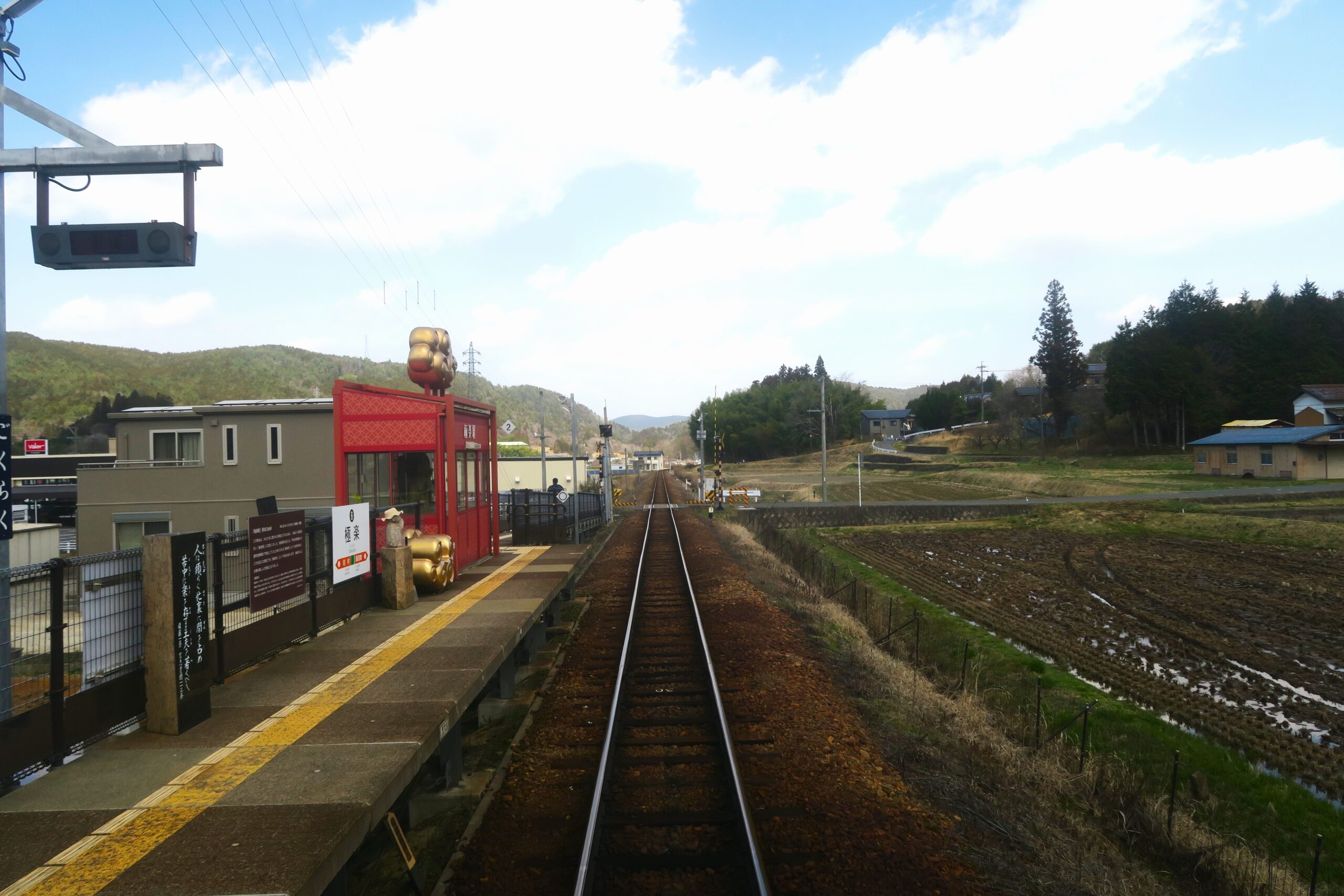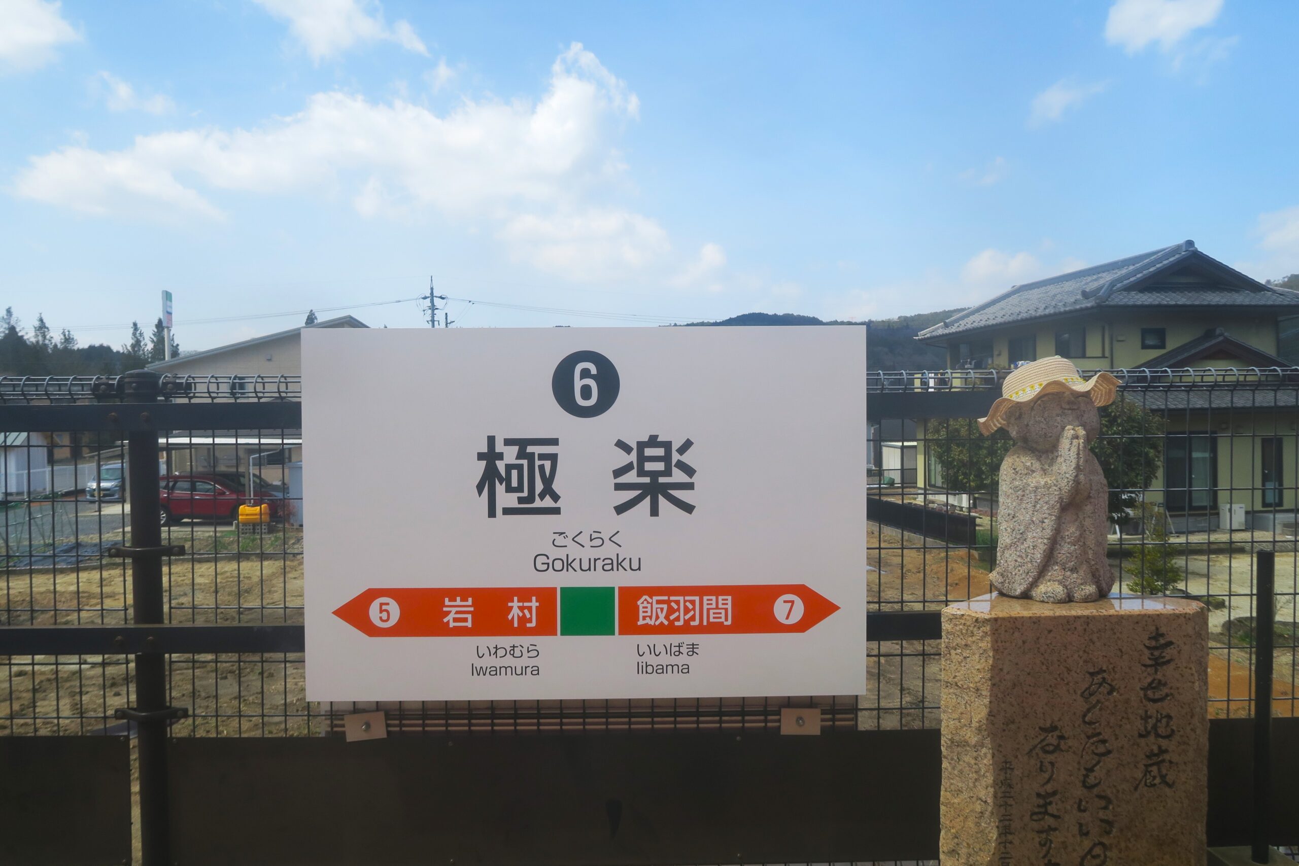 明智鉄道の中で最も新しい駅が「極楽駅」です。そのネーミングから縁起の良い駅として記念写真の人気撮影スポットです。