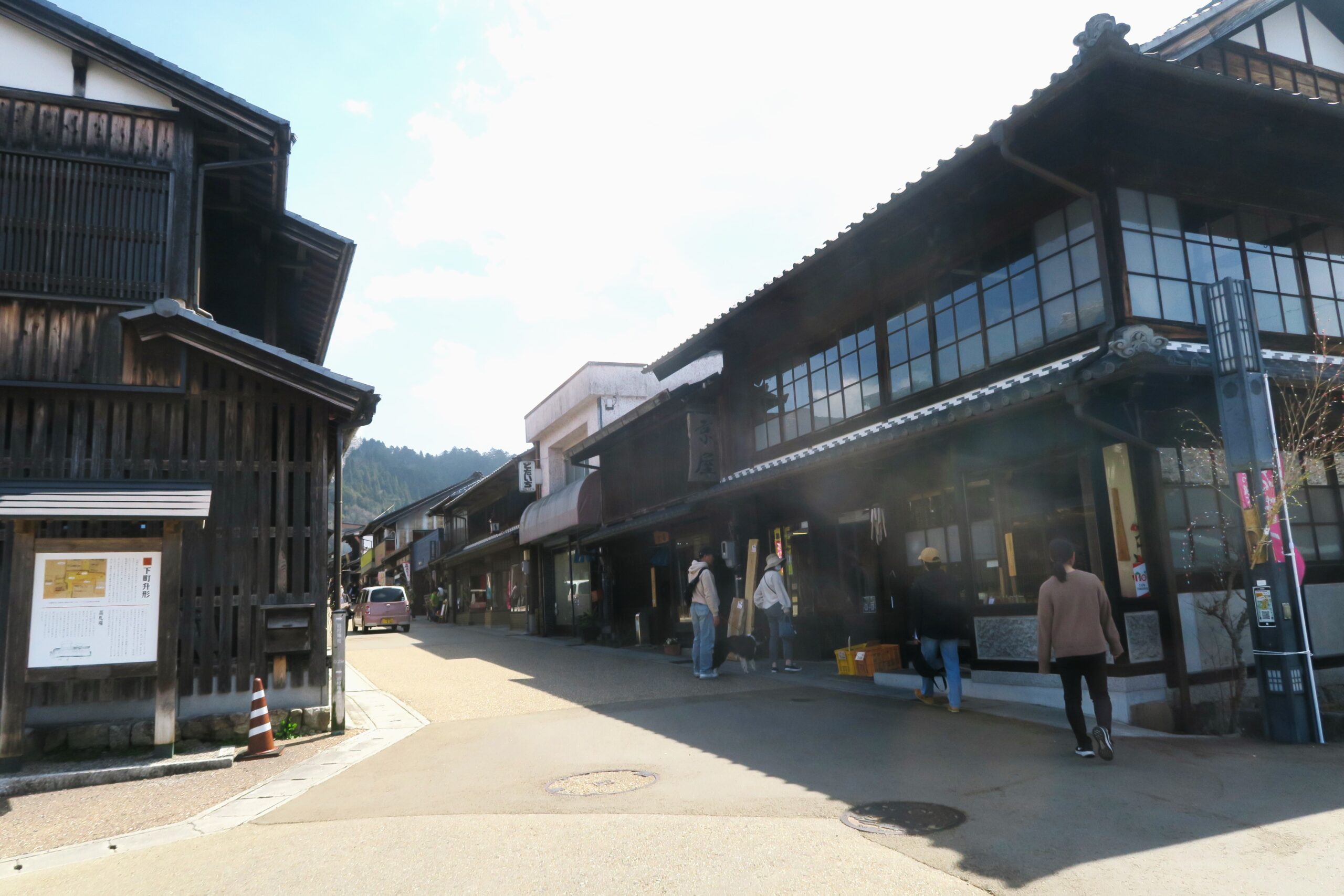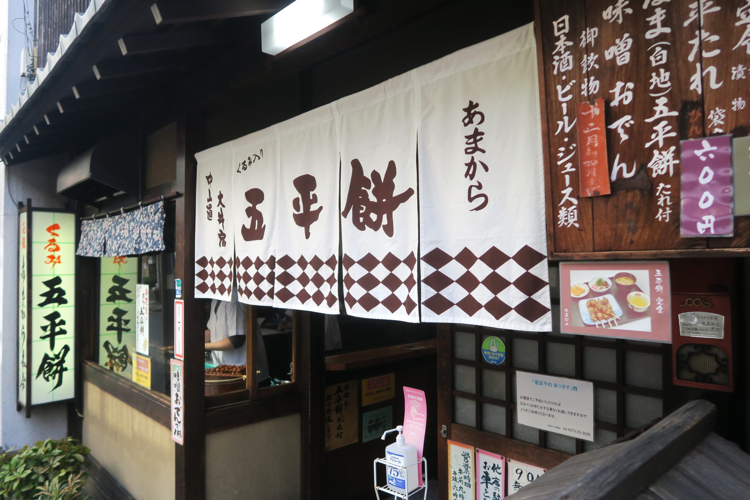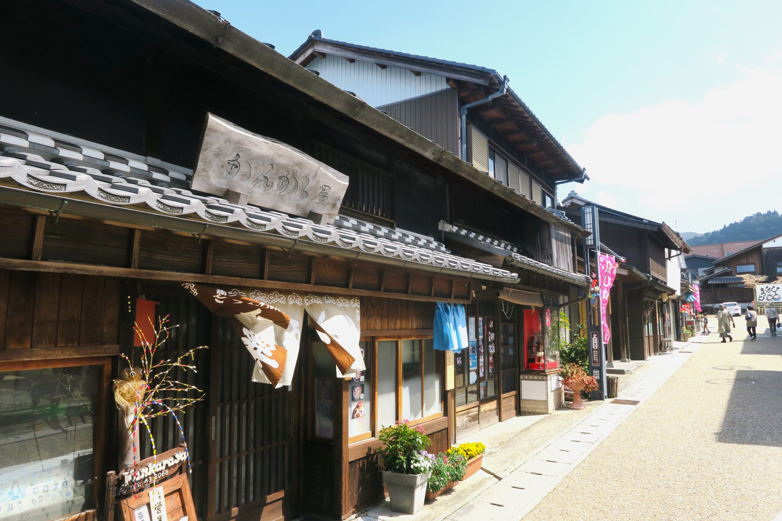 ここから駅側は岩村電気軌道が開業した明治以降の建物が多く、昭和レトロで、その雰囲気は連続テレビ小説「半分、青い。」の主人公の実家「ふくろう商店街」のイメージそのままです。桝形の手前、五平餅の「みはら」は「半分、青い。」の主人公の祖父が五平餅作り名人という設定でロケ地になる人気店※2024年5月閉店。写真は嘉永年間から伝わる「かんから餅」のお店かんから屋。富田の餅米を100%使用したふんわりとした餅は、きなこ、ごま、あんこの三種類でここでしか食べられない地元で不変の人気を誇ります。