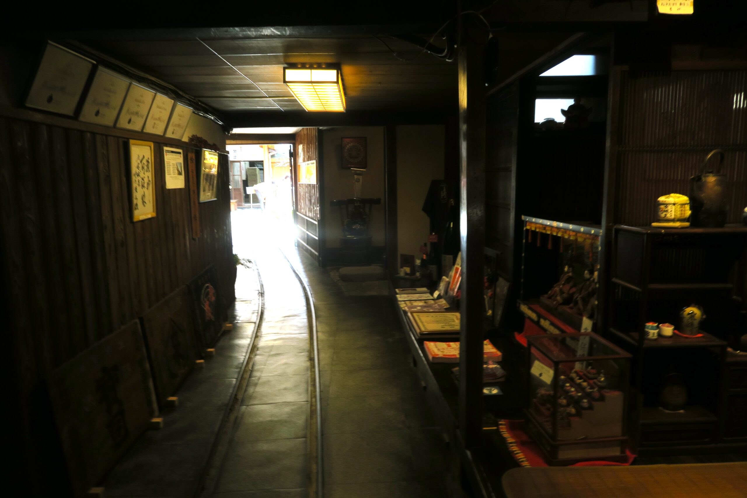 店内では岩村城からの払下げ材を用いた廊下や城で使われていた甕などが見られ、かつては奥の蔵から店の入口まで荷を運んでいたトロッコと店の奥まで敷かれている約100mのレールが残っています。