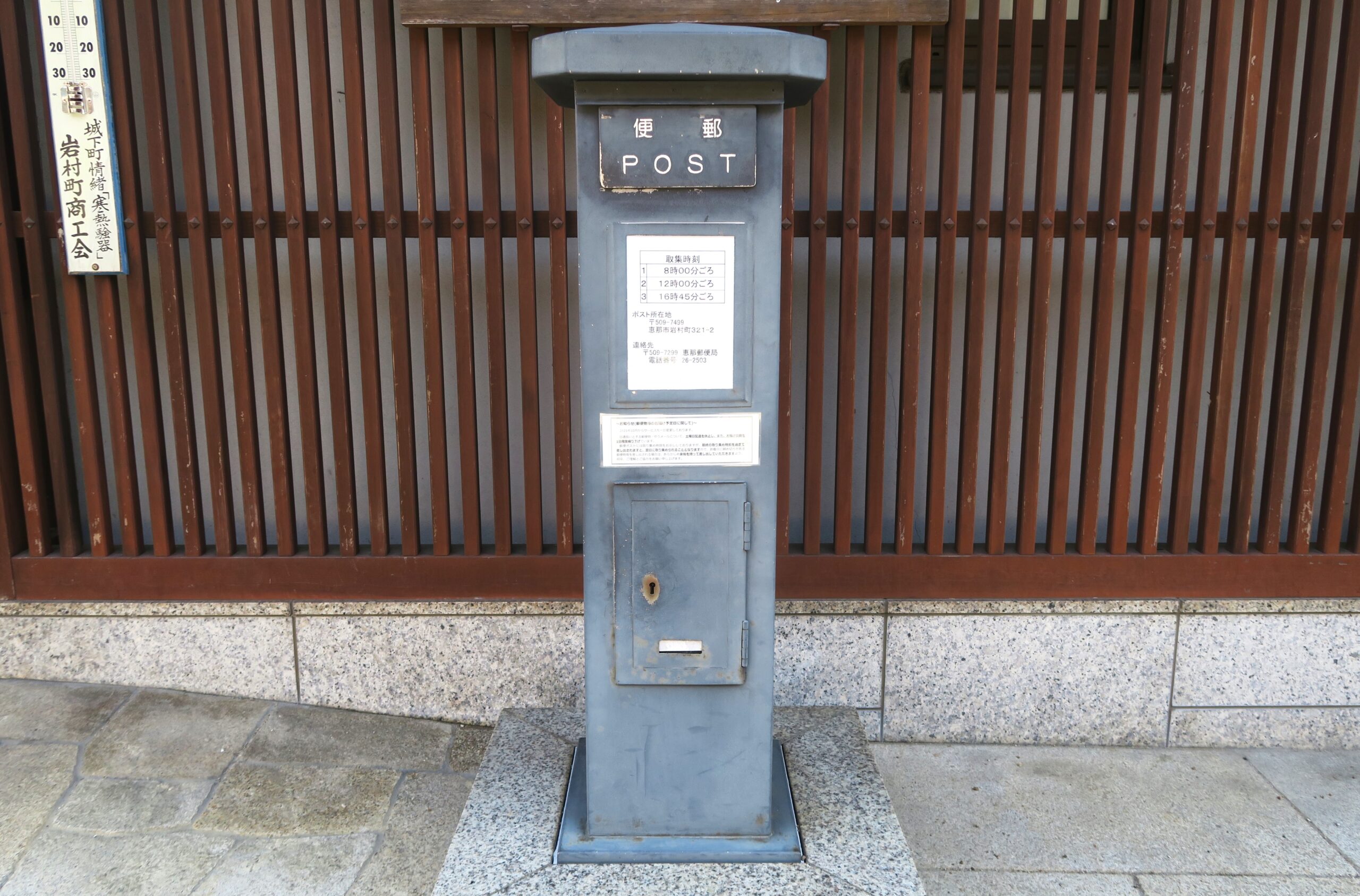 岩村郵便局前には明治20年(1887)頃のポストが再現されています。