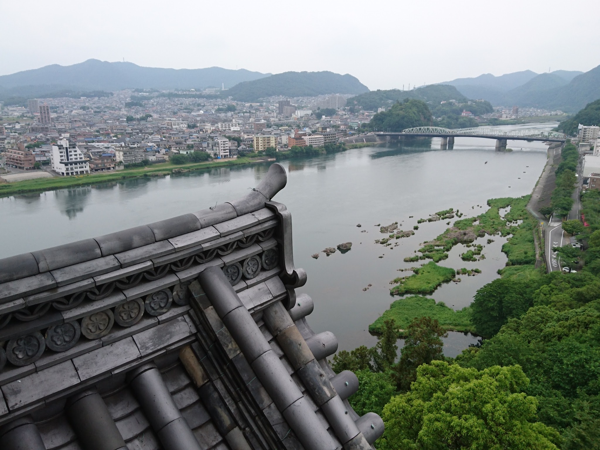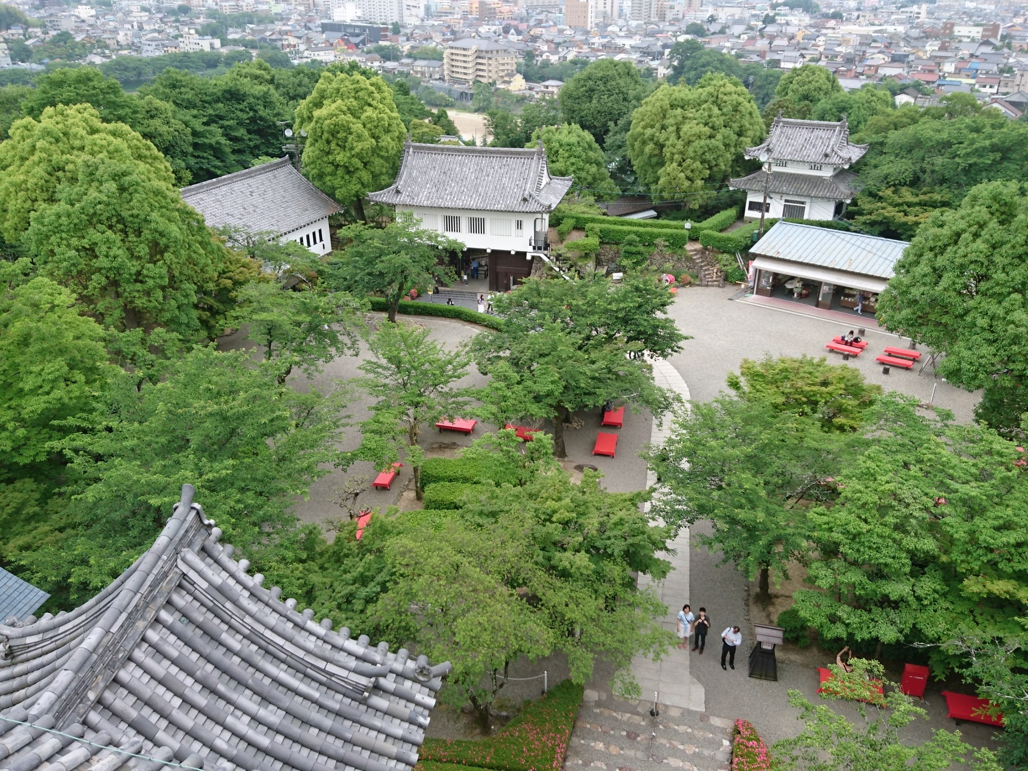 急な階段を次々上り、歴代城主の肖像画や写真が居並ぶ望楼の最上層へ。途端に明るく四方の視野が開ける。望楼は3間×4間のこじんまりとした空間で、外に巡らされた高欄は70cmの膝丈しかなく、一周しながら下を見るとちょっと怖い。現存天守では唯一、廻縁を一周でき、高欄の手摺りが継ぎ目のない一本の材で作られていることもこの天守の自慢だとか。成瀬正成の時代に回廊が設けられたとのこと。