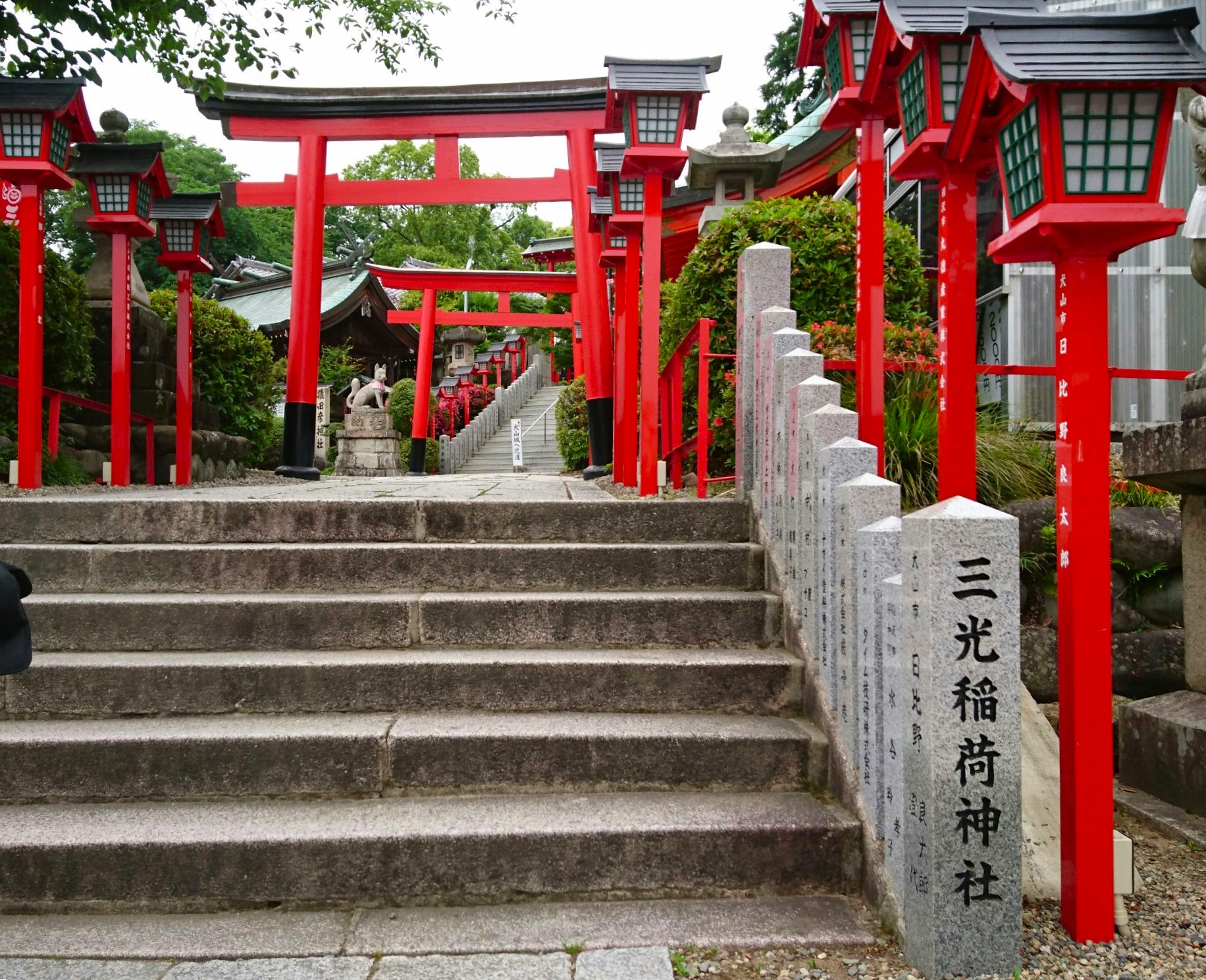 城を堪能した後は、石垣の残る道を下り三光稲荷神社の朱の鳥居をくぐりながら下りて犬山城下町へ。創建は明らかではないが天正14年(1586)の伝承がある。かつて三狐山(三光山)に鎮座し、江戸時代以降、犬山城主成瀬氏の守護神とされます。