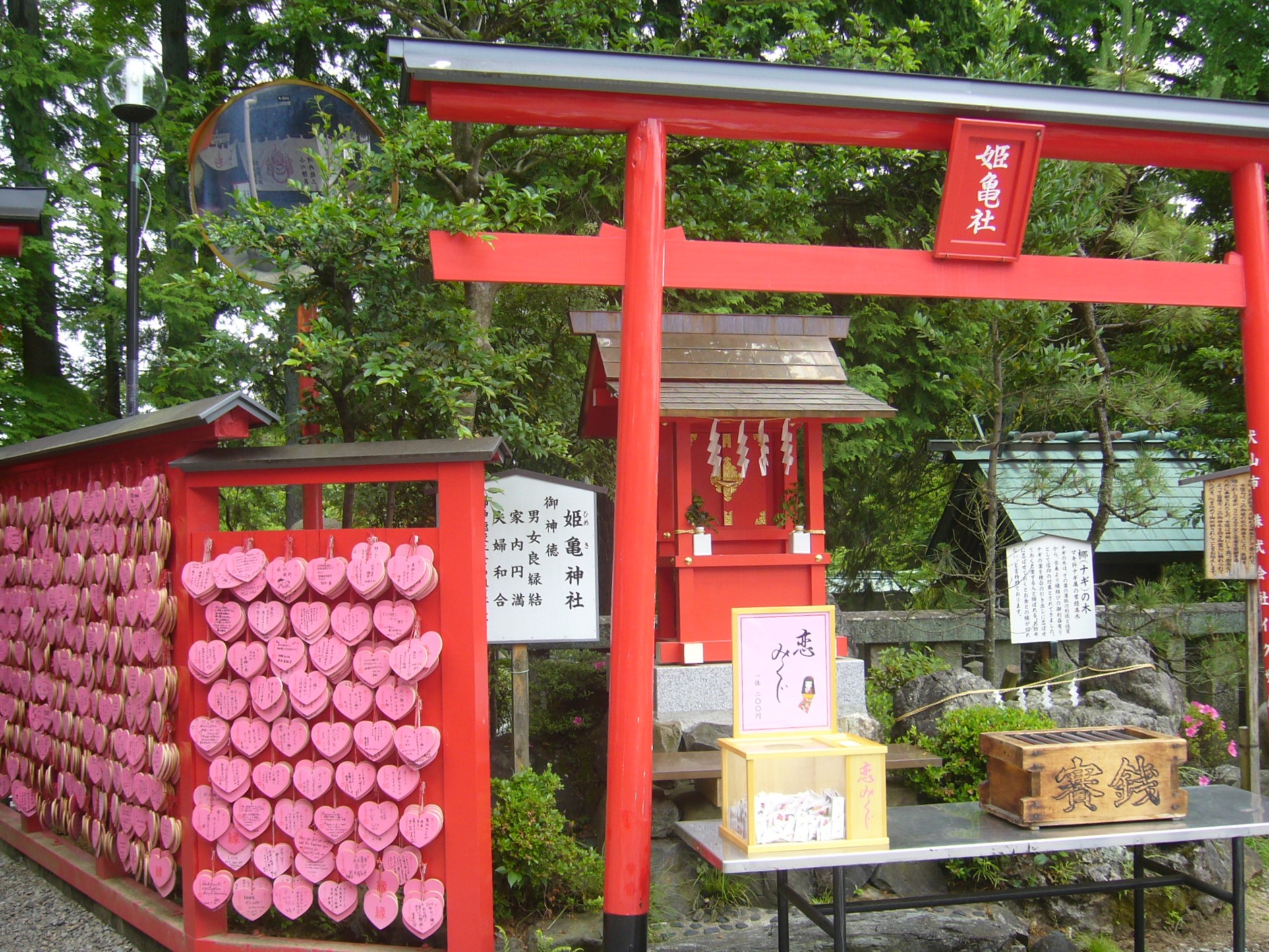 近年は縁結びの神様として広く知られる三光稲荷神社の絵馬掛けには、ハートの絵馬がたくさん並ぶ。
