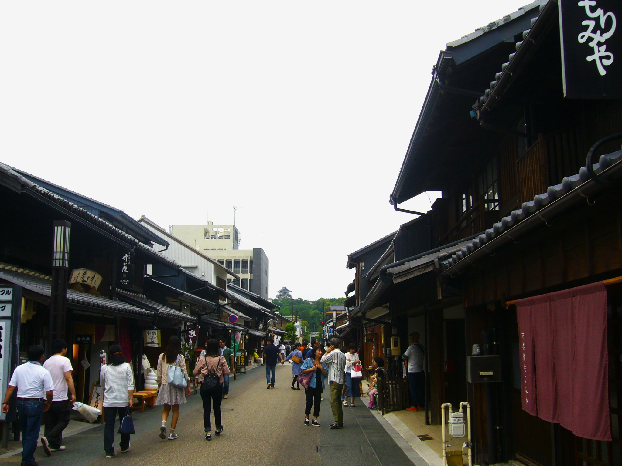 犬山城下町は今もなお昔の情緒が残る町並みが城から南へ真っすぐに伸びる本町通りを軸に、現在も江戸時代と同様の碁盤目状の区画が残ります。築城とともに整備されたもので、さすがに建物こそすべて昔のままということはないものの、旧磯部家住宅や奥村邸、小島醸造の本宅など風格ある建物が点在しており、町角には大本町、魚屋町、鍛冶屋町など昔の町名の案内看板もあって往時を偲ばせてくれます。今では歴史的建造物を改修したカフェや土産物店が軒を連ね、数ある食事処、甘味処では、味わい、素材、彩りに工夫を凝らした「串グルメ」に出合えます。写真は様々な店が並び城下町らしい賑わいを見せる本町通りで、甘いもの、辛いもの、色とりどりの串を片手にここの散策もまた、楽しいひとときです。気に入った串を食べ比べてみてください。
