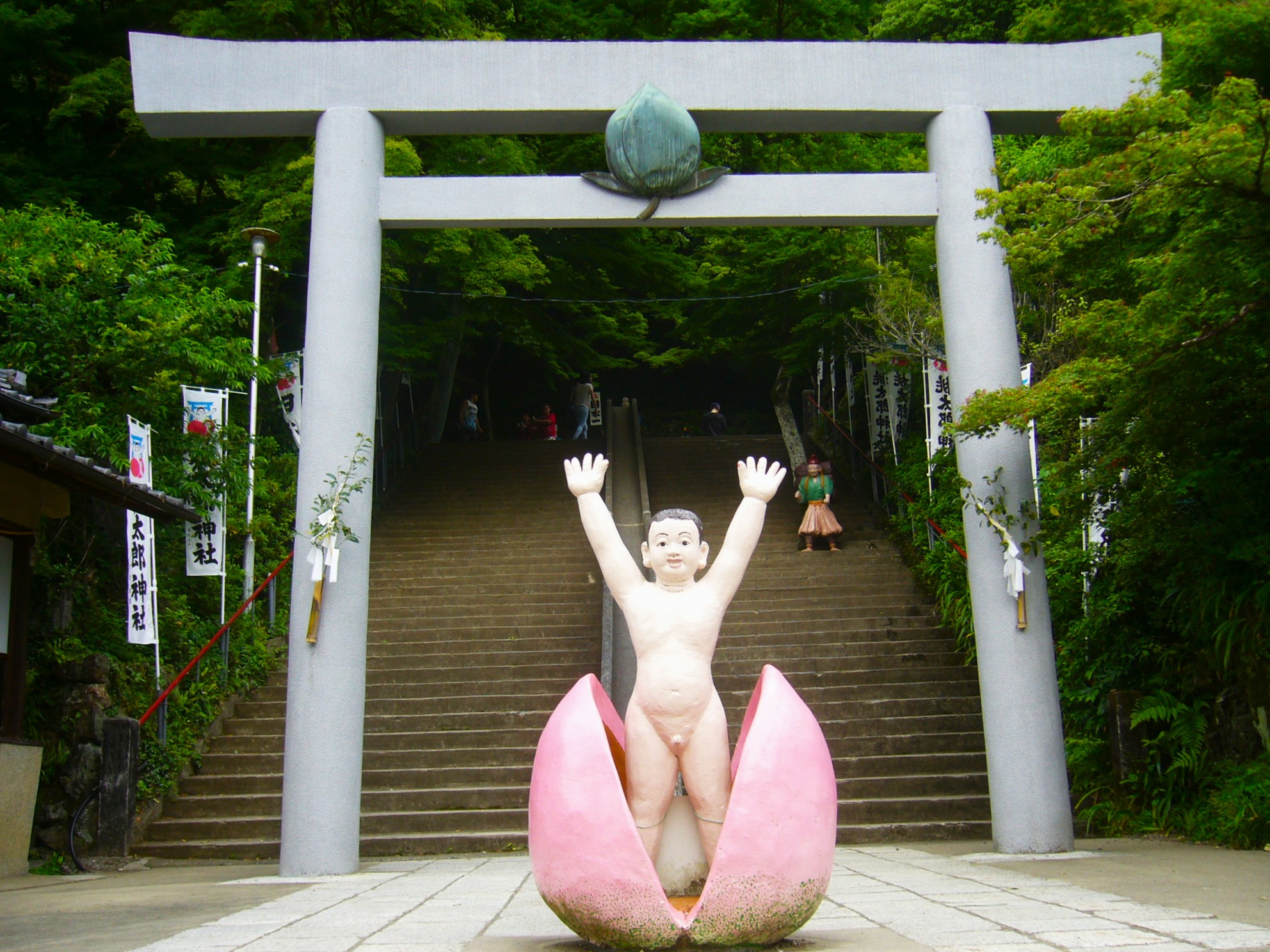 桃太郎の伝説は、日本各地に伝えられていますが、犬山もその一つです。その桃太郎すなわち桃の実の精霊で大神実命を祀っているのが桃太郎神社です。飛騨木曽川国定公園の中でも「河川美日本一」と称される日本ライン沿岸に位置します。古来より子供の守り神として広く崇敬されている神社の境内には、物語の主なシーンを再現したユーモラスな像が点在しています。近くには「鬼が島」などの伝説にちなんだ地名も残されています。
