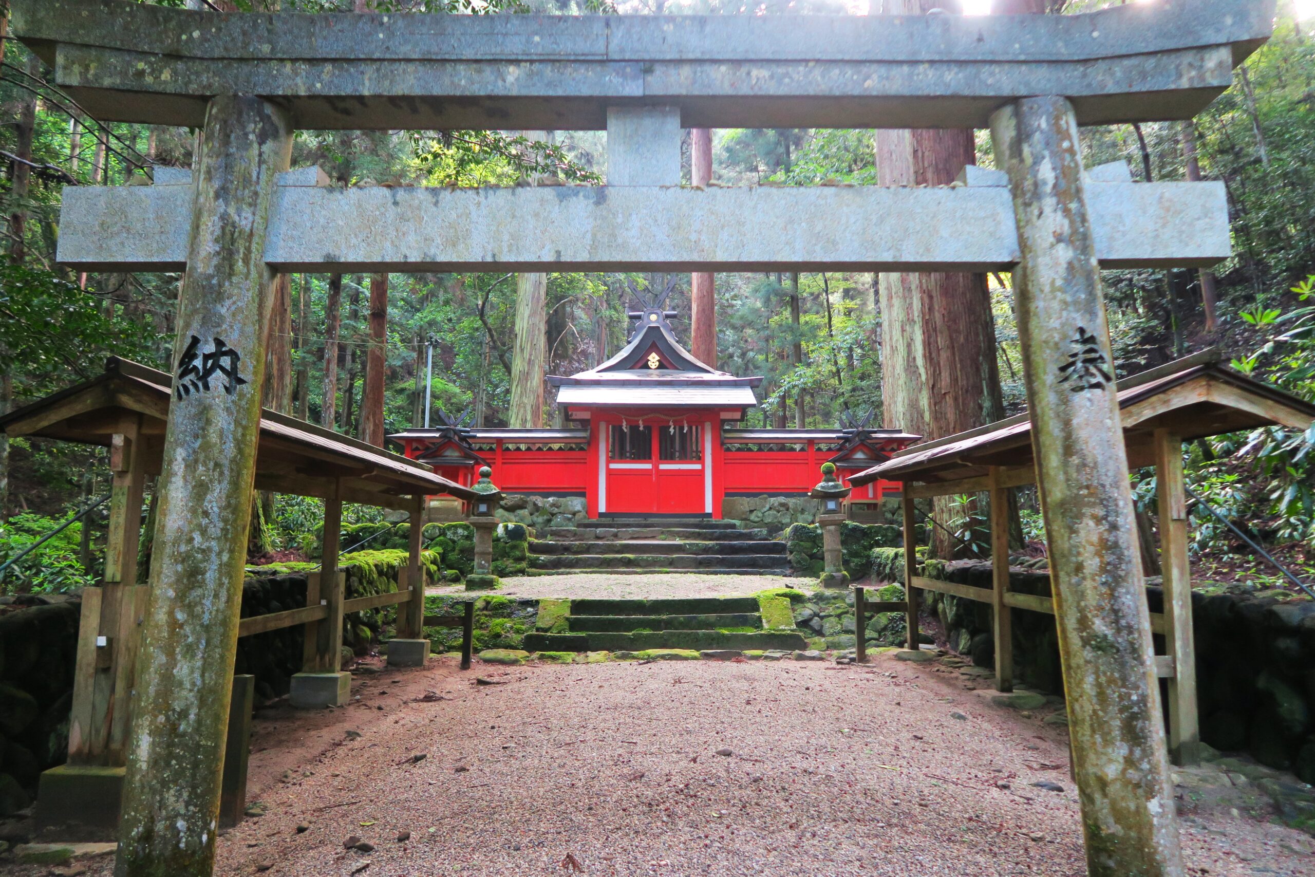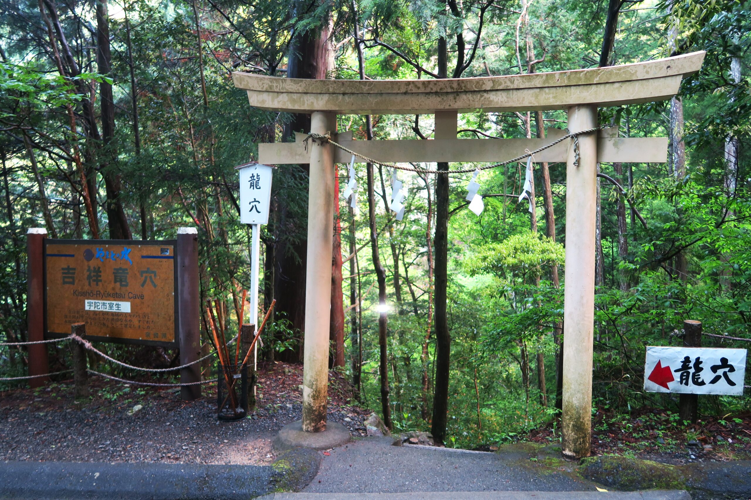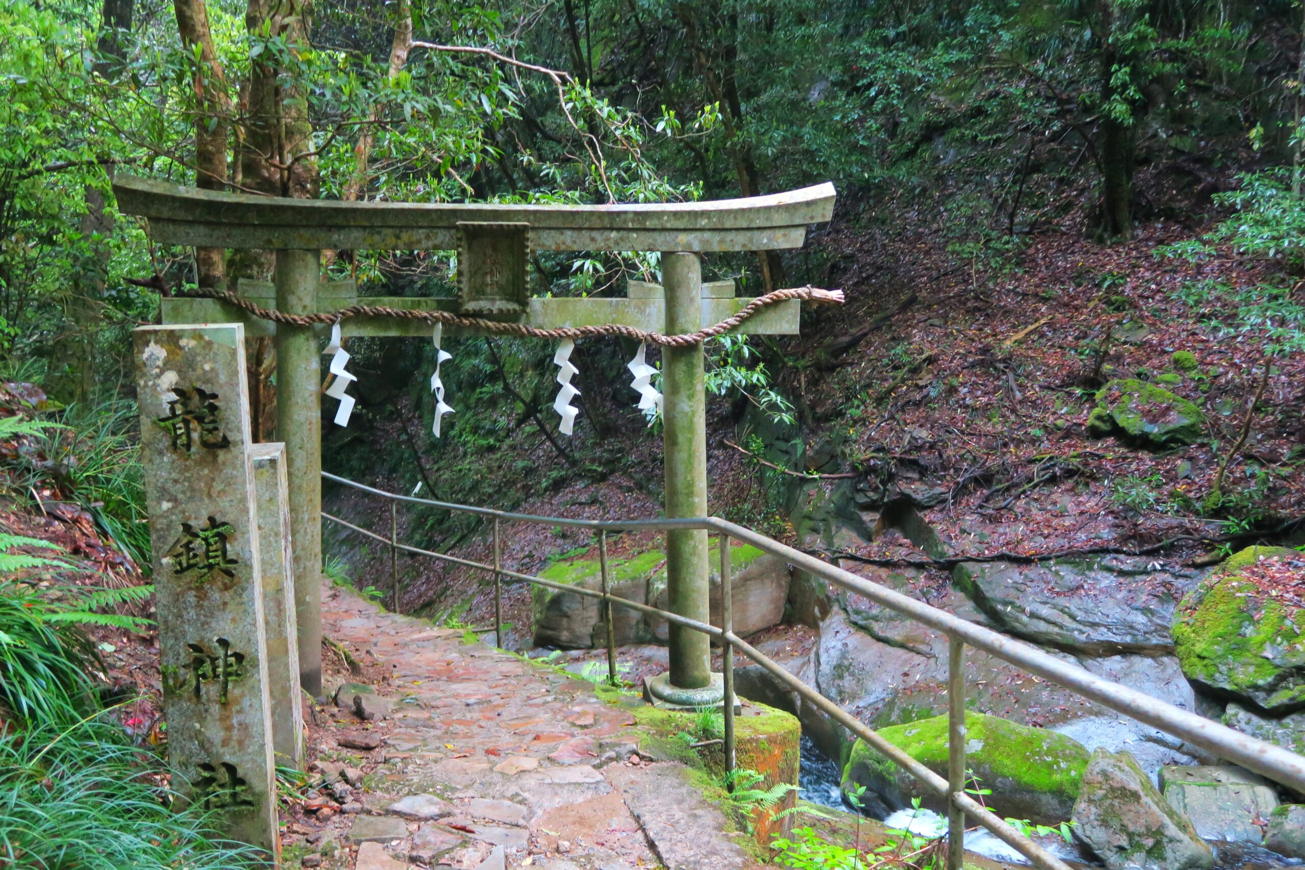 室生湖に注ぐ「やまとの水」に選定されている清流・深谷川上流にある龍鎮渓谷。その清澄な水が流れる渓流沿いの遊歩道を歩いていくと石の鳥居が現れます。龍鎮神社の入り口です。