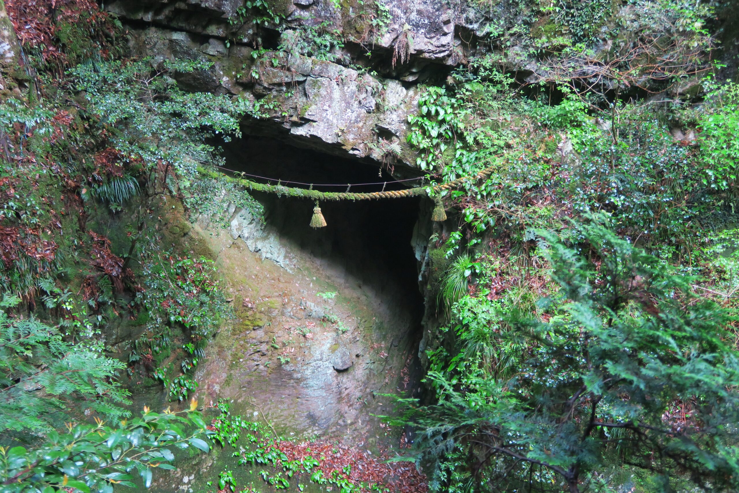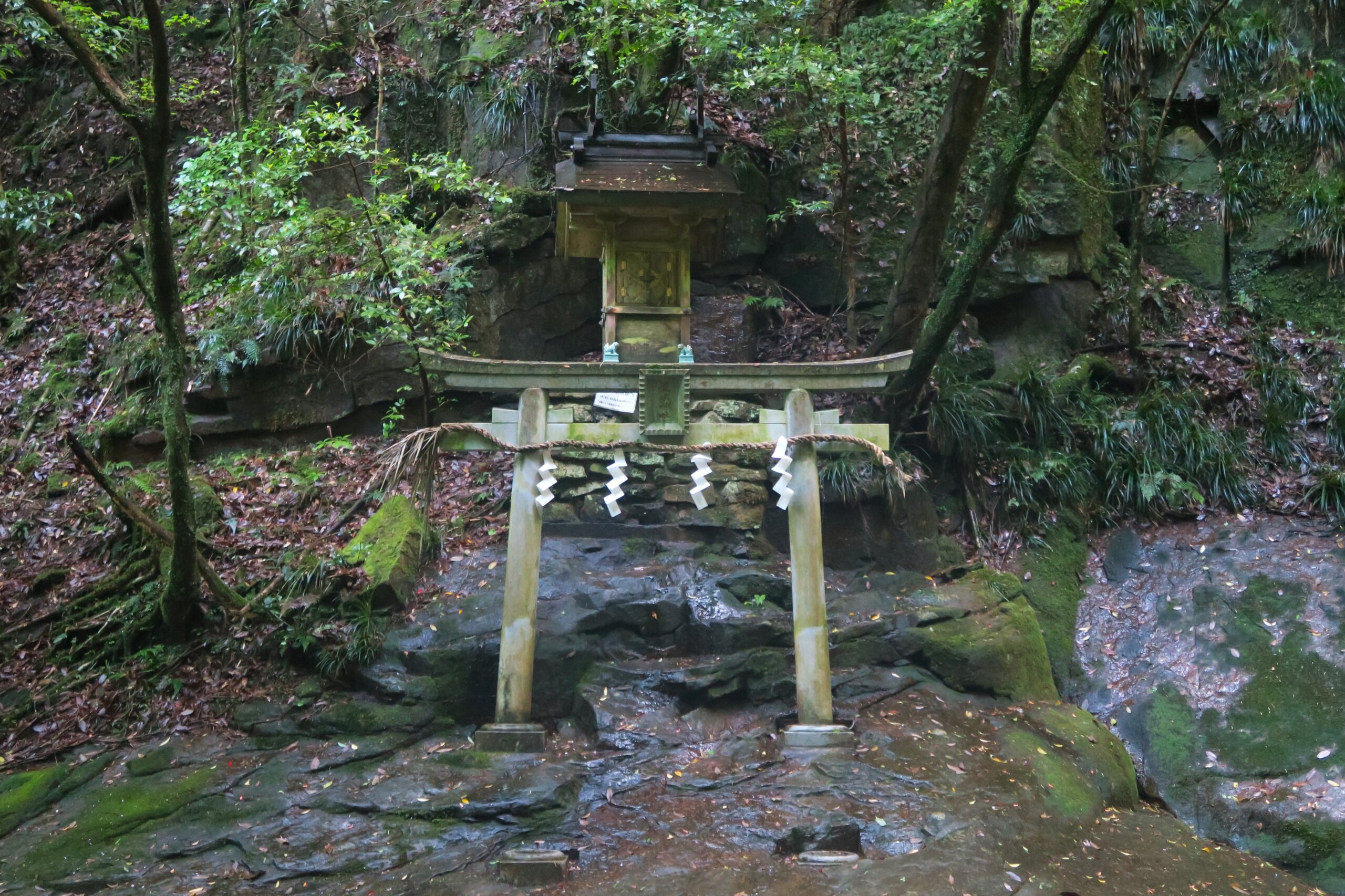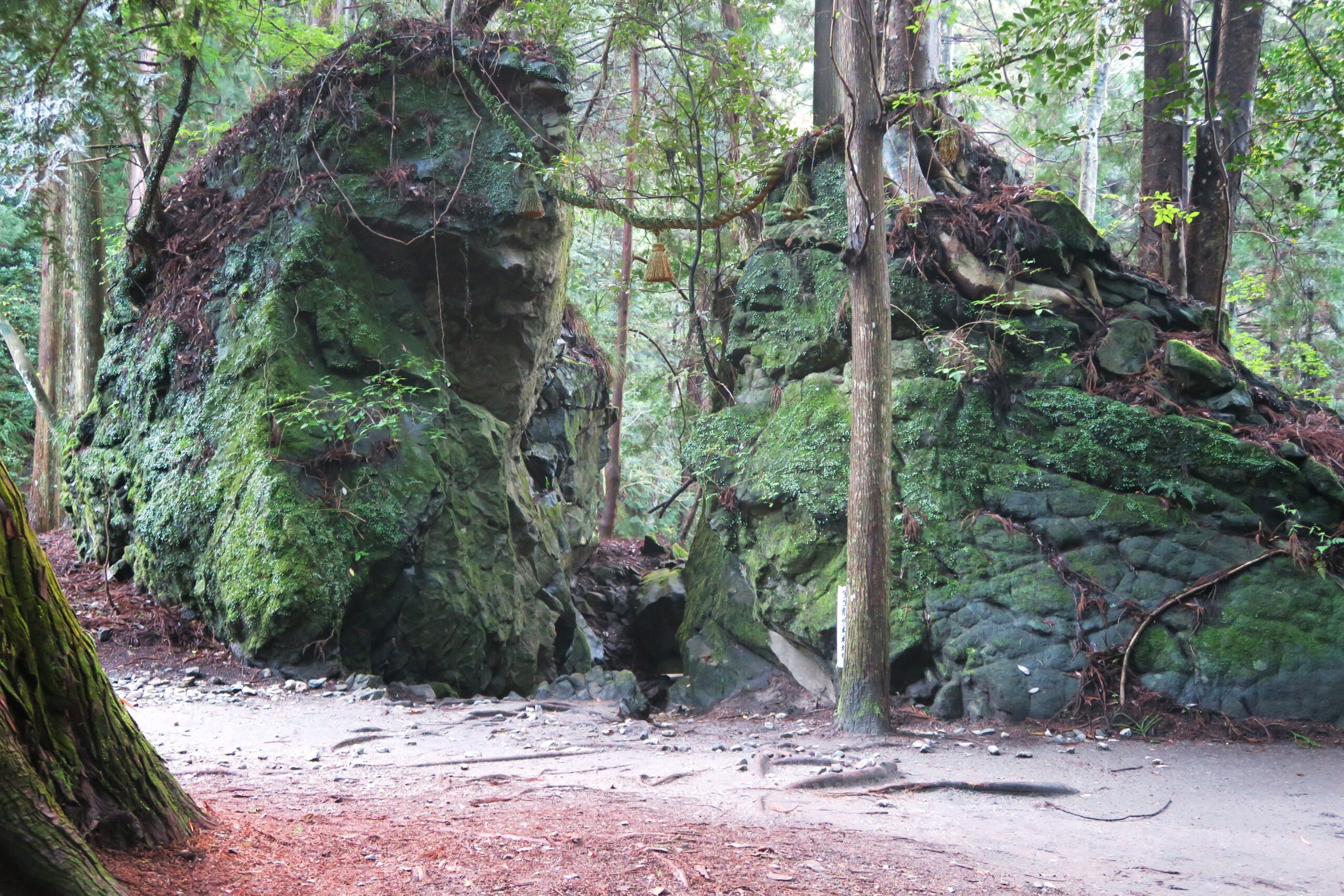 川の上には注連縄が張られ、鬱蒼とした森と苔むした岩が神聖な雰囲気を醸しています。
