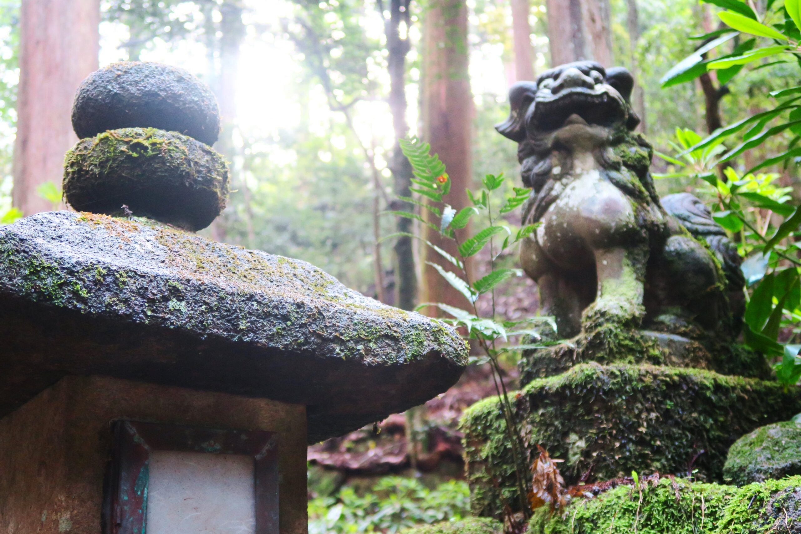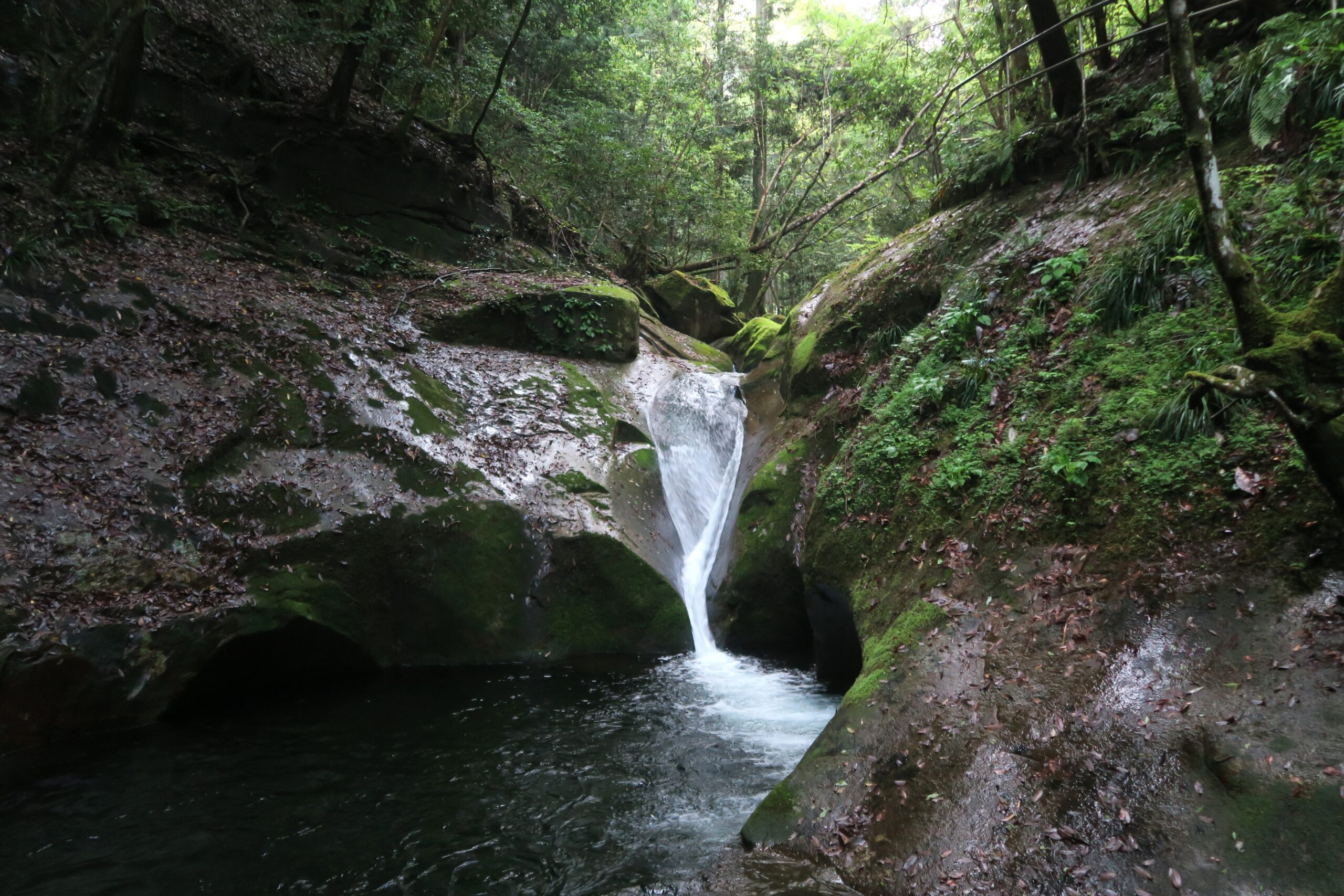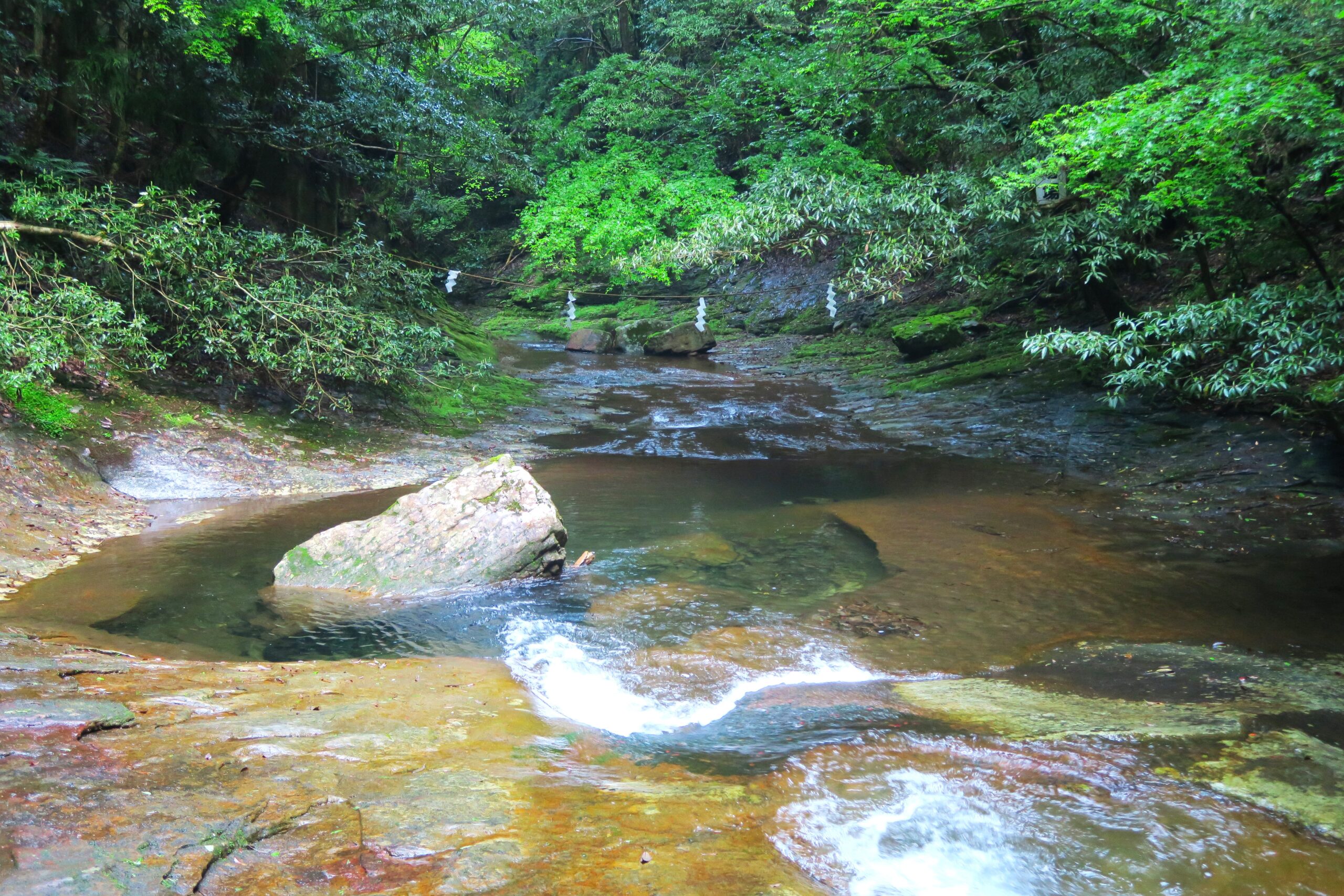 川の上には注連縄が張られ、鬱蒼とした森と苔むした岩が神聖な雰囲気を醸しています。