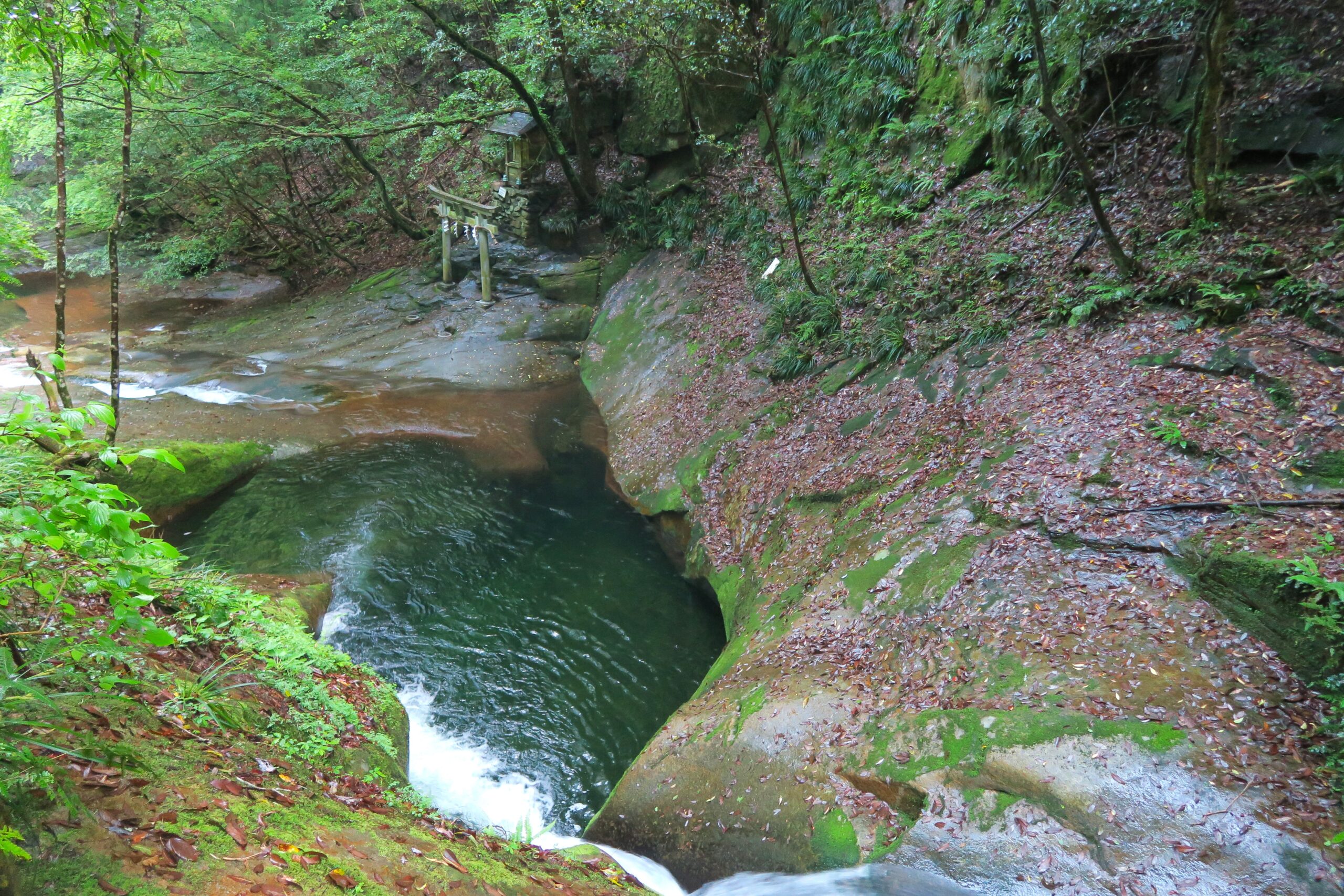 龍神が棲むという滝壺の透明度は高く、吸い込まれるような美しさで、陽があたると美しいエメラルドグリーンや濃紺の景色が広がる。まさしく龍が鎮まるという名にふさわしい美しい風情をたたえています。