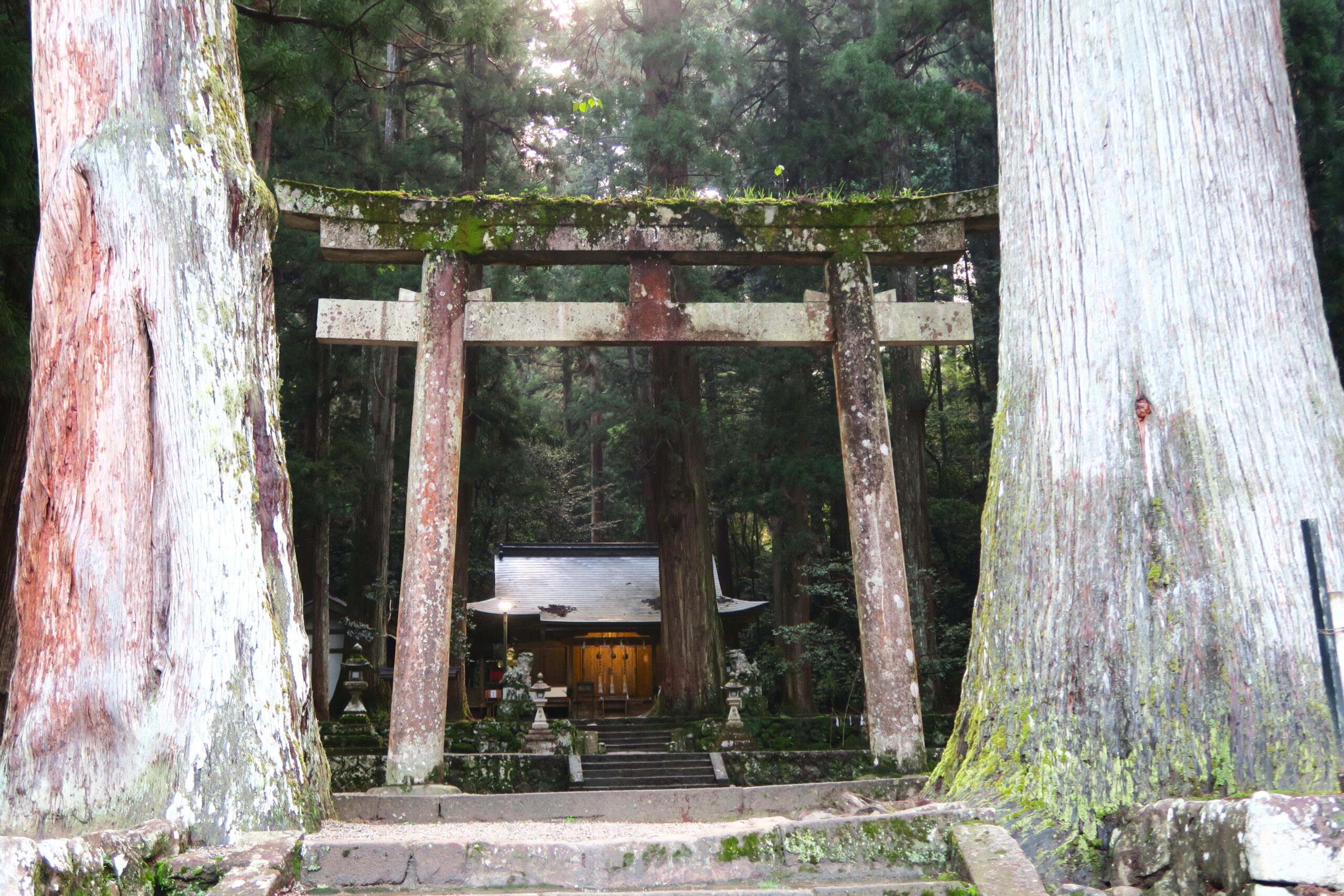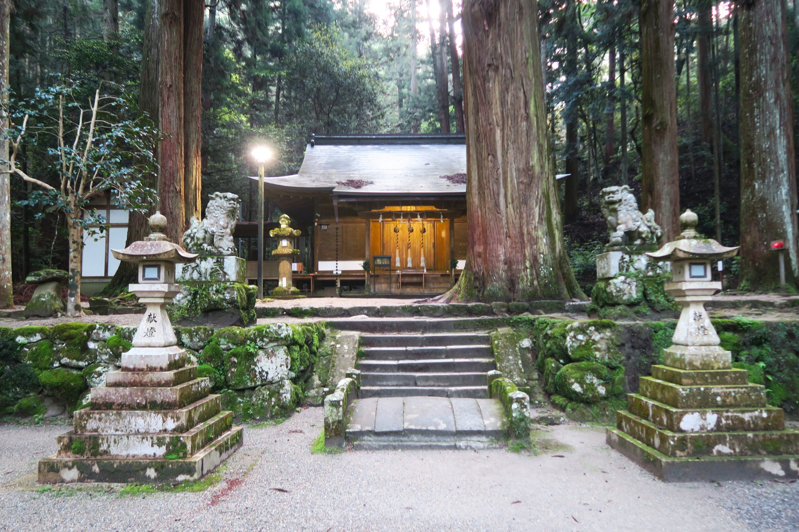 拝殿の脇を通りさらに奥に進むと、真っ直ぐに伸びる杉林の間に美しい朱塗りが映える檜皮葺きの本殿が姿を見せます。元和3年(1617)に建てられた春日造。春日大社若宮の旧社殿が譲られた春日移しのひとつで、およそ300年前から伝わる典型的な春日造が美しく厳かな雰囲気が漂います。